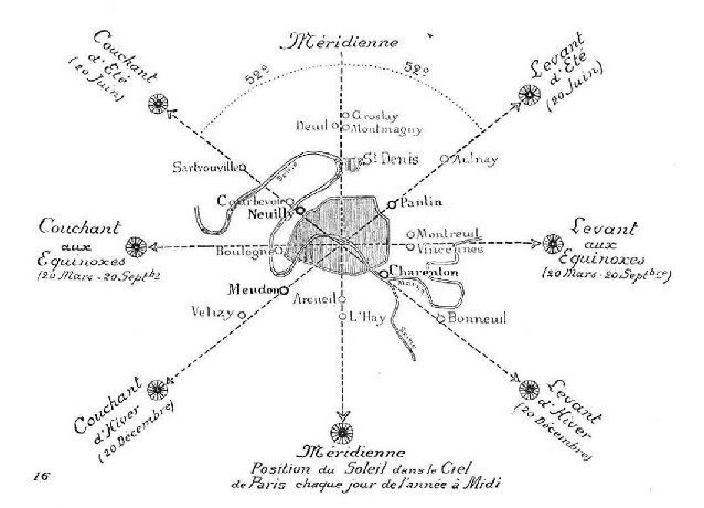 It is possible to see that the French Meridian, which passes both the northerly and southerly points of France, also passes through Paris at the correct latitude for the summer and winter solstice sunrises and sunsets to occur at 52� off True North/South (A phenomena which is captured along the ‘Champs de Lysee’ (Tr. ‘Elysian Fields’), which is orientated along the path of the rising summer solstice sun and the setting winter solstice sun.