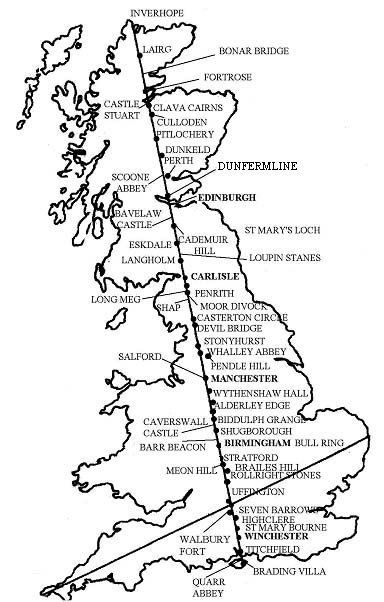 The St. Michael’s ley has been shown to be inter-related with several other prominent British megaliths through geometry, astronomy and an apparent knowledge of longitude/latitude, not least of all to Stonehenge. Stonehenge, whilst not being a part of the St. Michael ley, is connected with both Glastonbury and Avebury/Silbury through geometry, and also forms the crossing point of several prominent ley-lines – both astronomical and non-astronomical. The first astronomically significant ley-line to pass through Stonehenge was first identified by Sir Norman Lockyer, and later extended to 22 miles in length by K. Koop. This ley follows the path of the mid-summer sunrise on a bearing of 49� 15′. (2) Another significant ley-line to pass through Stonehenge was also identified by Lockyer, and can be shown to extend accurately for 18.5 miles. It skirts only the edge of the henge at the junction of the avenue, missing the centre (and the sarsen stones) altogether. This line runs on a bearing of 170� 45′, and appears to have no astronomical significance.