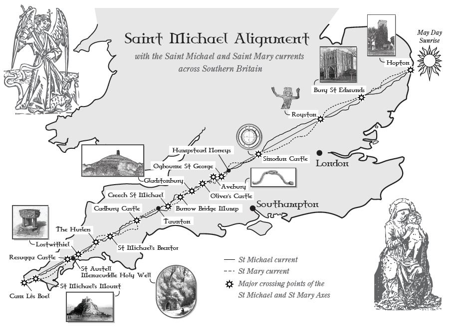 Twin underground telluric currents, known as the Michael and Mary lines after the number of churches dedicated to either Mary or St. Michael to be found along them, weave around the central overground mid-line. This reveals the primal ‘Caduceus’ pattern that can be found within all true Leys: a triple-fold axis composed of masculine, feminine, and spirit currents, which may be experienced by the practising Geomancer as containing information in the thinking, feeling and spirit realms respectively.