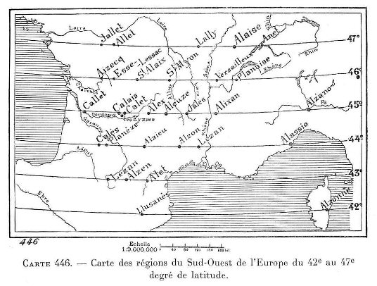 These lines, centred on Alaise, connect towns, villages and special places of a similar name in France and other countries.  Guichard realized that the system must have been planned thousands of years ago.  Guichard wrote a book about his discoveries.  It was entitled “Eleusis-Alesi” but only 500 copies were printed in 1936.  The book was a study on the origins of European civilization.