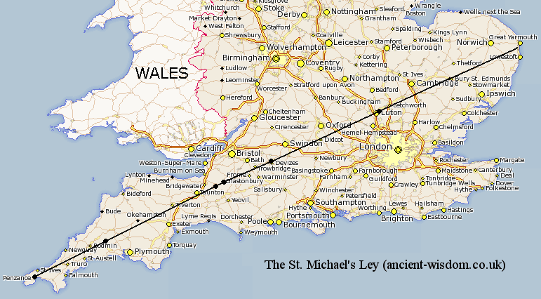 Perhaps the most famous Ley in Britain is the ‘Michael and Mary’ line, which runs across England from Hopton in Norfolk to St. Michael’s Mount in Cornwall, and thence right around the globe. Aligned to Beltane and Lughnasadh / Lammas sunrise, this was first rediscovered by Jean Richer and John Michell and subsequently described in more detail by Hamish Miller and Paul Broadhurst in “The Sun and the Serpent” (1989).