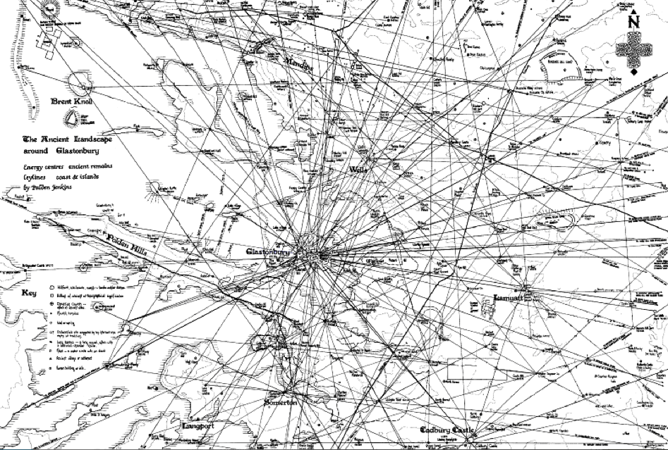 Map detailing the convergence of ley lines at Glastonbury, UK.