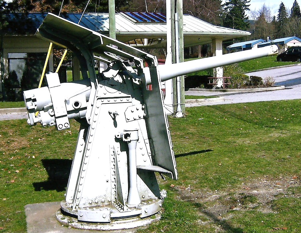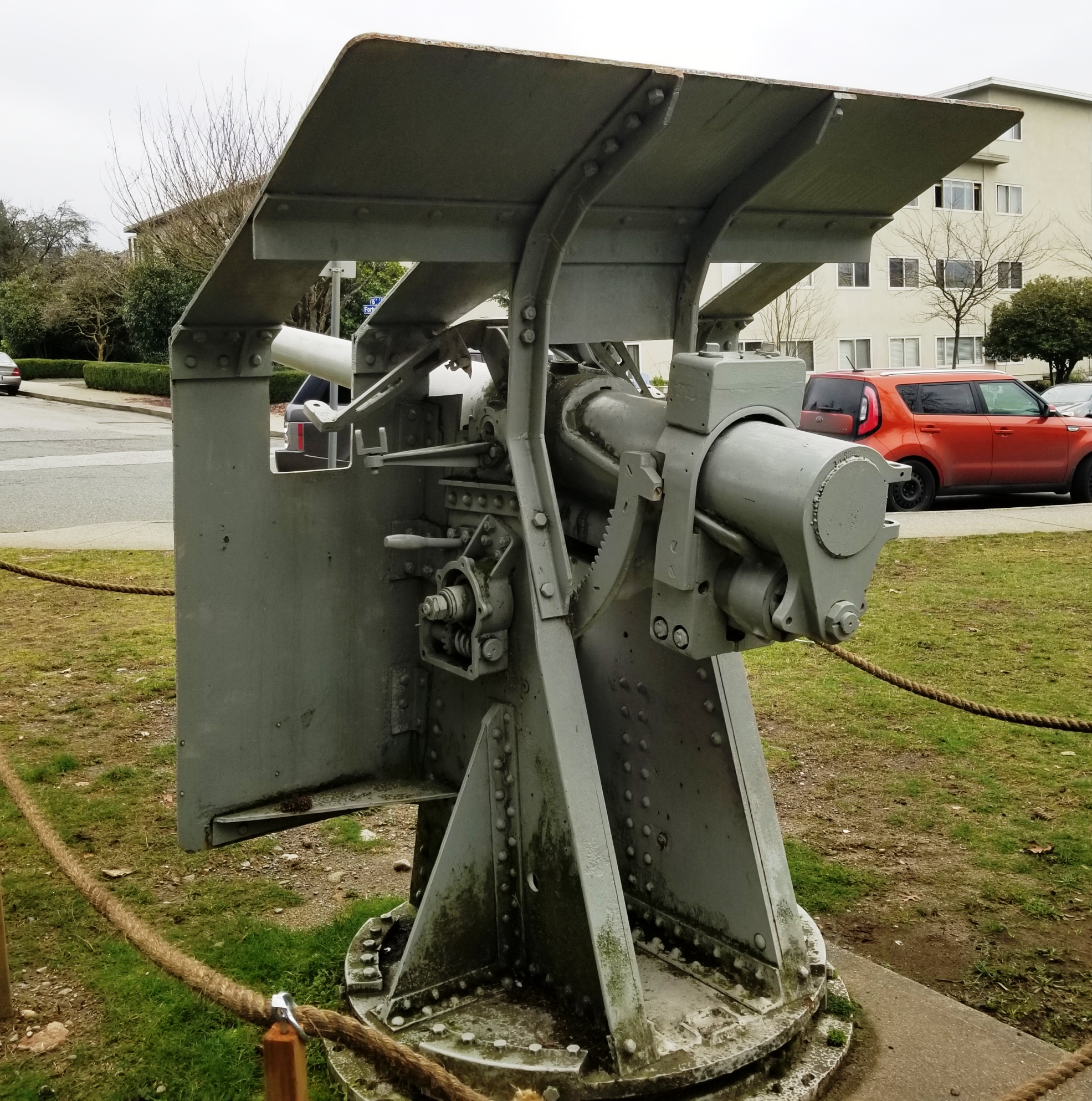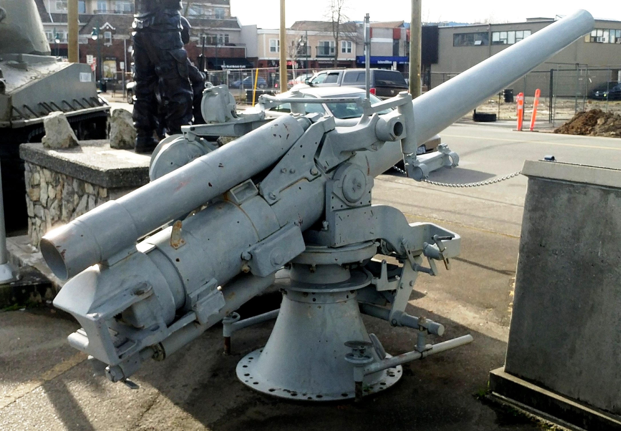 This gun is located at 7411 River Rd., Richmond, in front of the Navy League building. During the Second World War, ten US Coast Guard Cutters were transferred to Britain as part of the Lend-Lease program. This gun may have come from one of those ships. The gun was rapid firing (US term) or quick firing (British term). Fixed ammunition (case and projectile handled as a single assembled unit) with a 14.5-pound (6.6 kg) charge of smokeless powder gave a 33-pound (15 kg) projectile a velocity of 2,900 ft/s (880 m/s). Range was 9 mi (14 km) at the maximum elevation of 20 degrees. Useful life expectancy was 400–500 effective full charges (EFC) for a non-chrome plated barrel, while a chrome plated barrel was listed at 600 rounds.