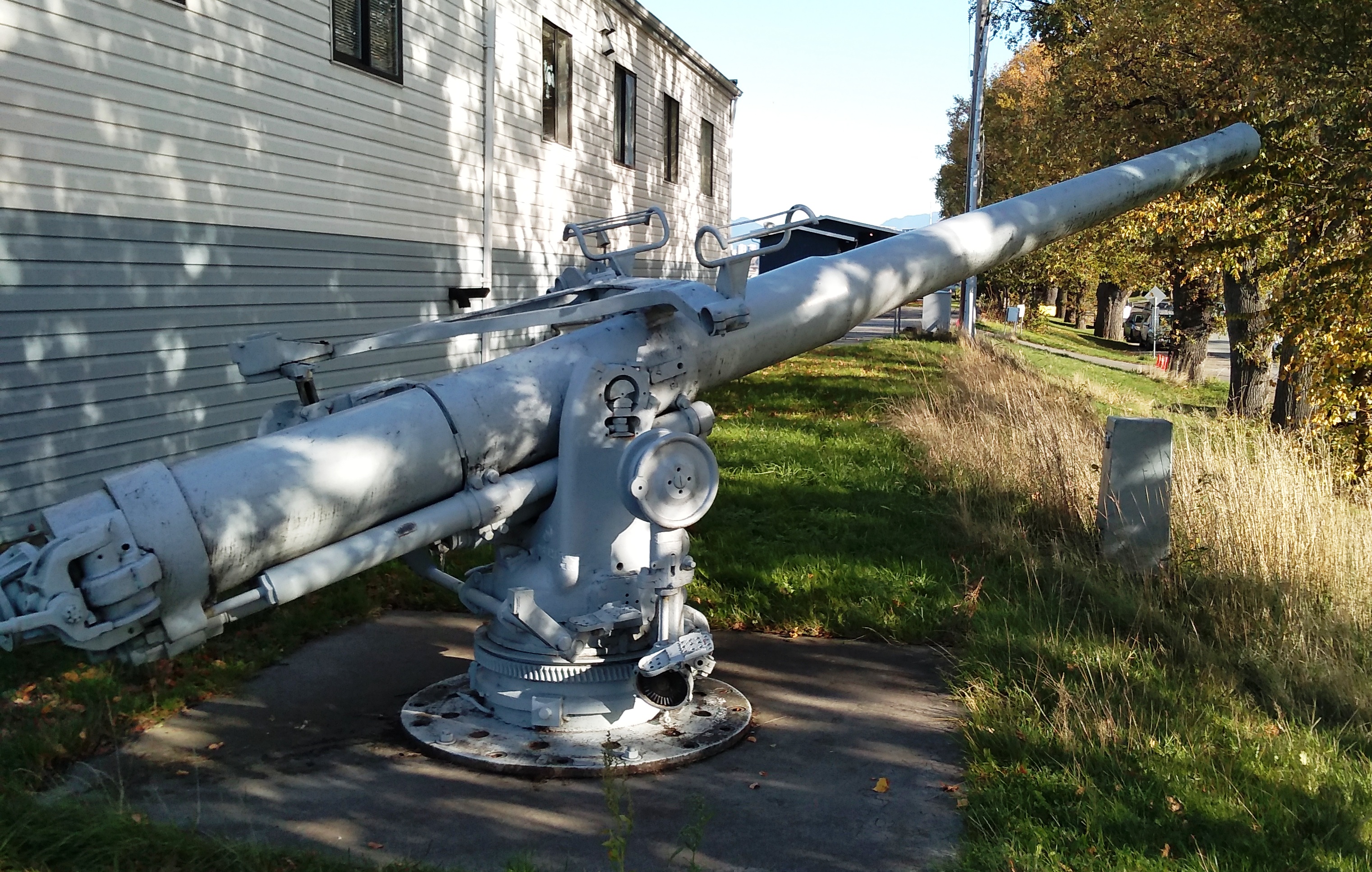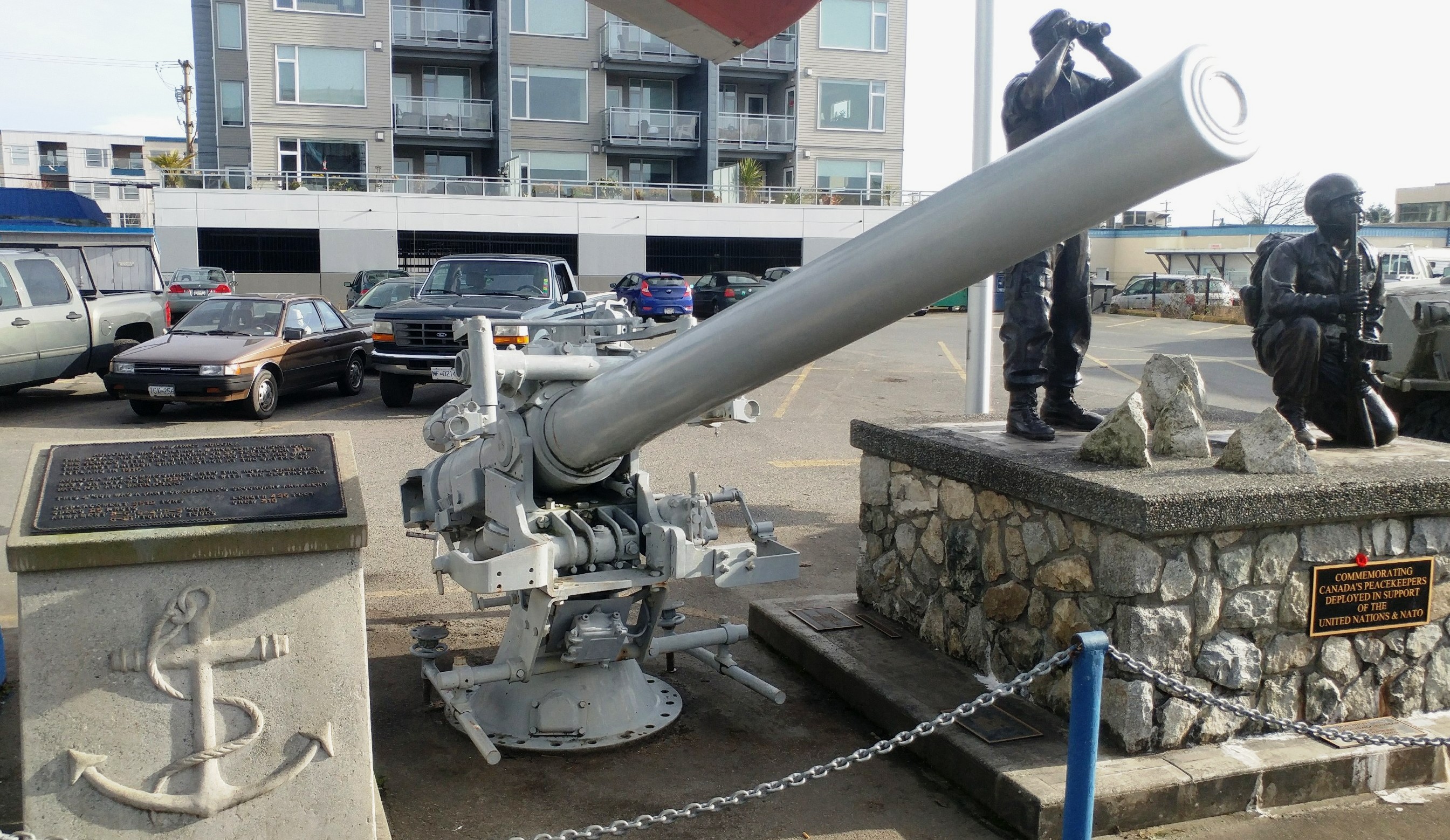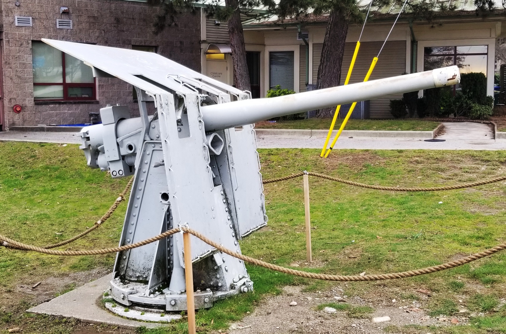 The Naval gun was collected and brought to Vernon in 1944 by Canadian Engineers. It was set up in front of their mess hall where it stood for a few years until being moved to its present display location in front of the headquarters of the Vernon Army Cadet Summer Camp. The gun serves as a memorial to the four Canadian fatalities from the Winnipeg Grenadiers, the Fusiliers de Mont-Royal and the Rocky Mountain Rangers.