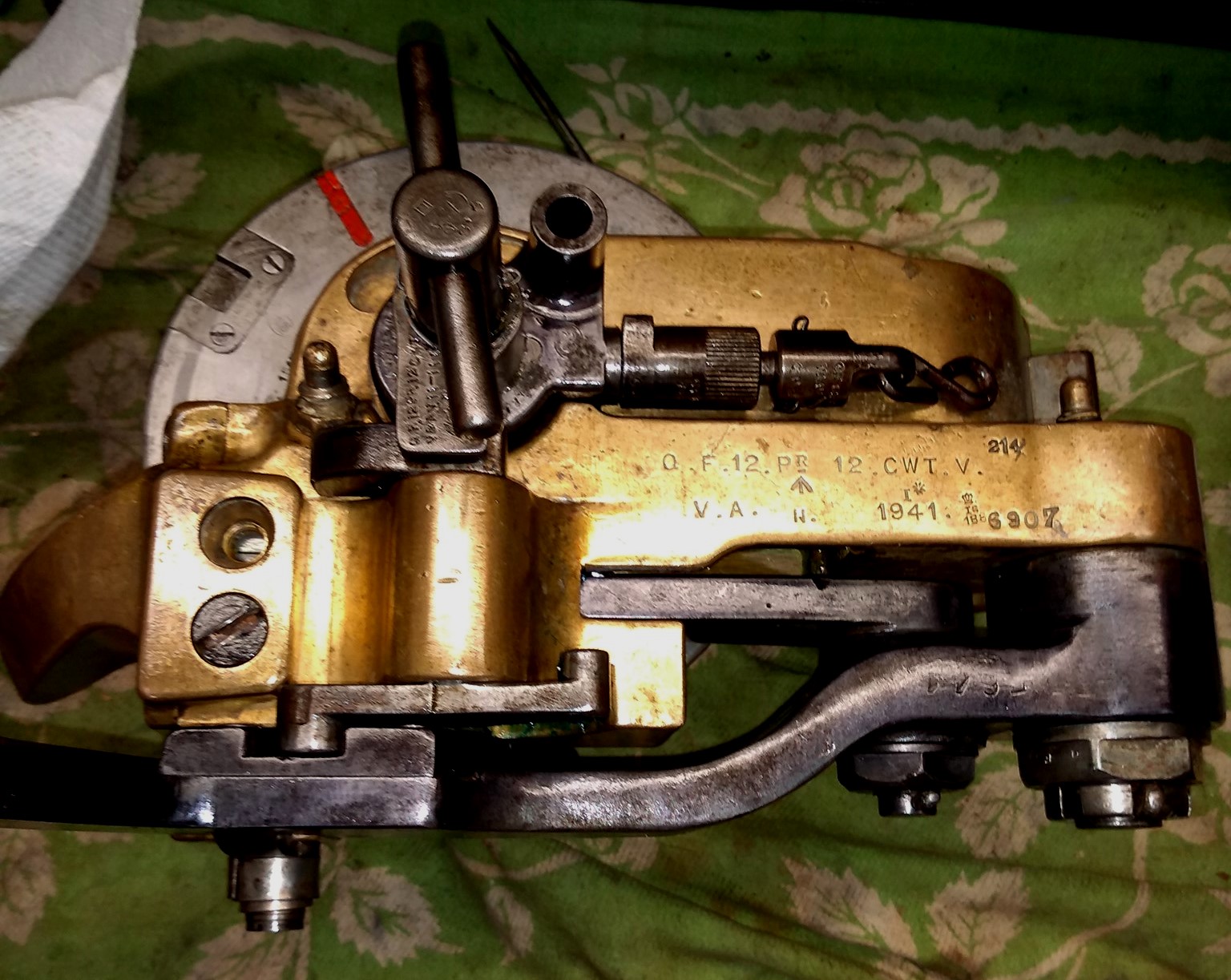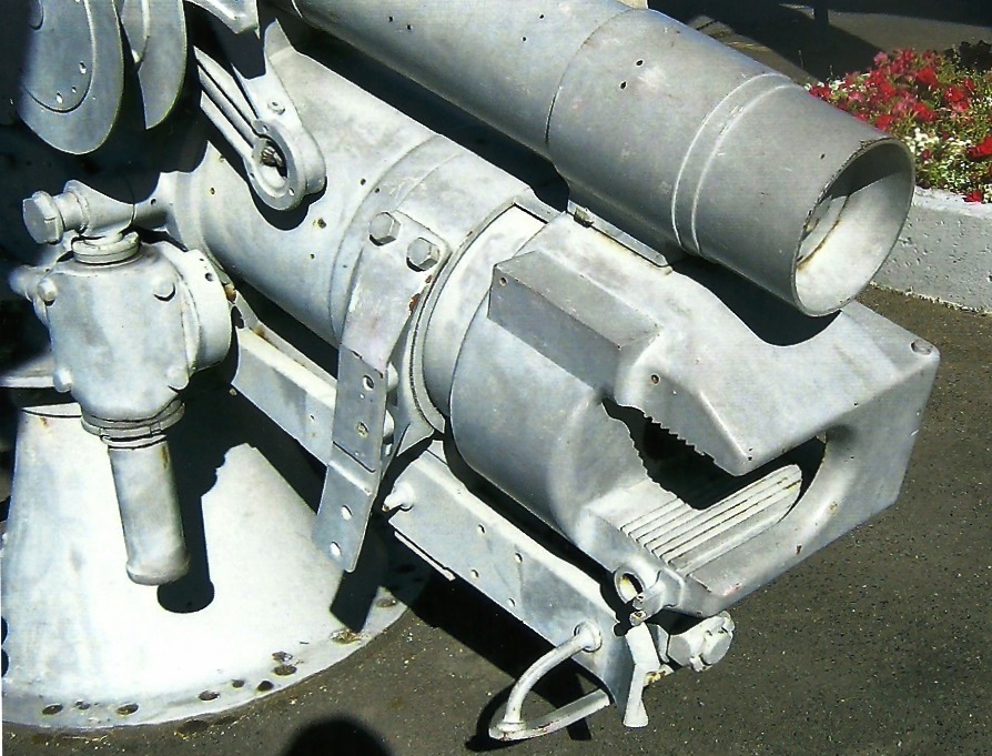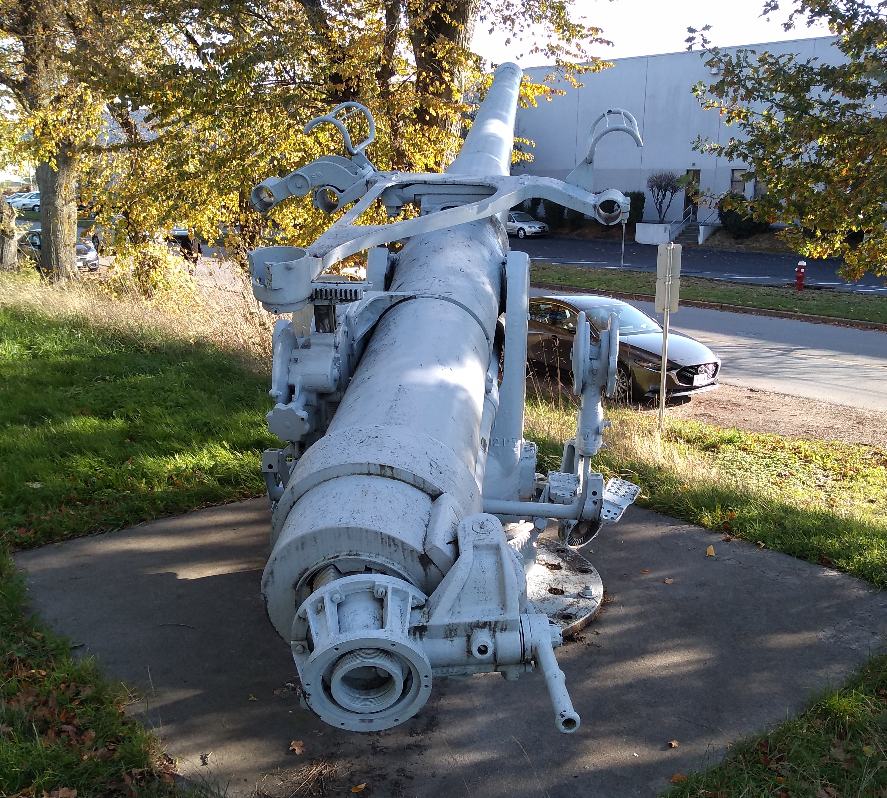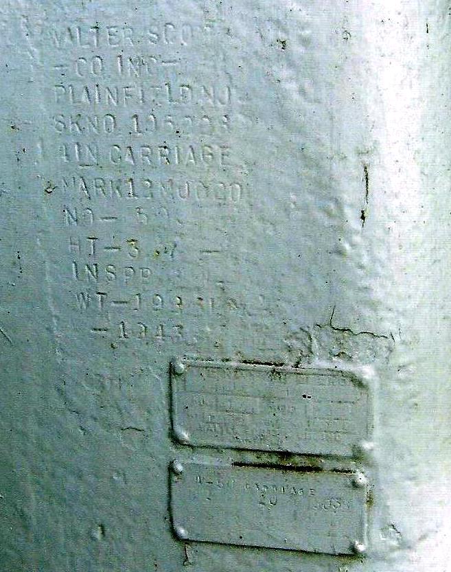 4-inch/50 caliber (102-mm) standard low-angle, quick-firing gun used by the US Navy. Stamped into the steel is “4 IN CARRIAGE. Stamped on a plate riveted to the steel is “4-50 carriage”. The stamping includes “Walter Scott & Co Inc Plainfield NJ”, 1943. The plate bears “Serial Number 5038”. The gun is mounted on a wet mount, used by US Navy submarines. John Eckersley.