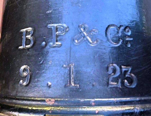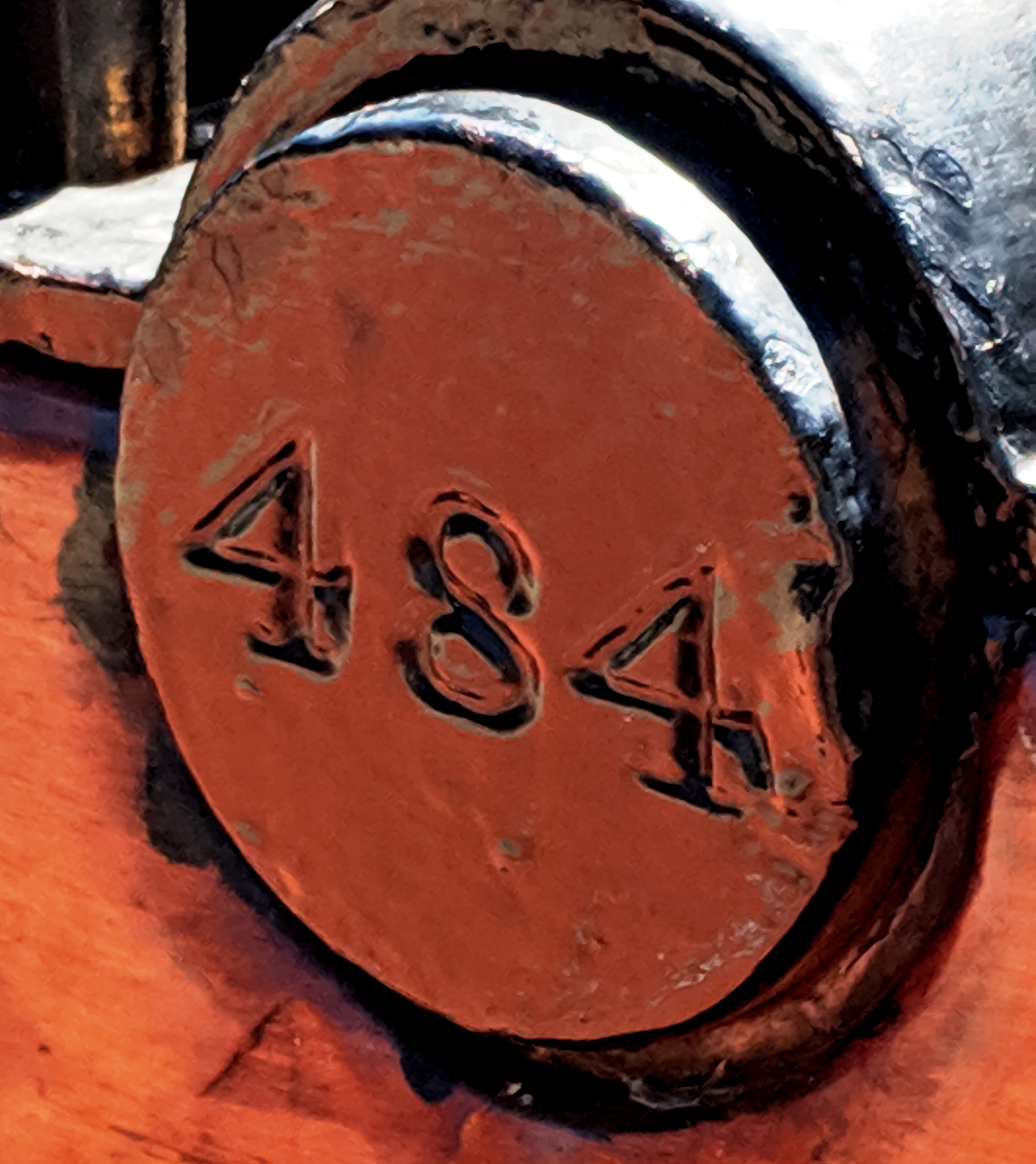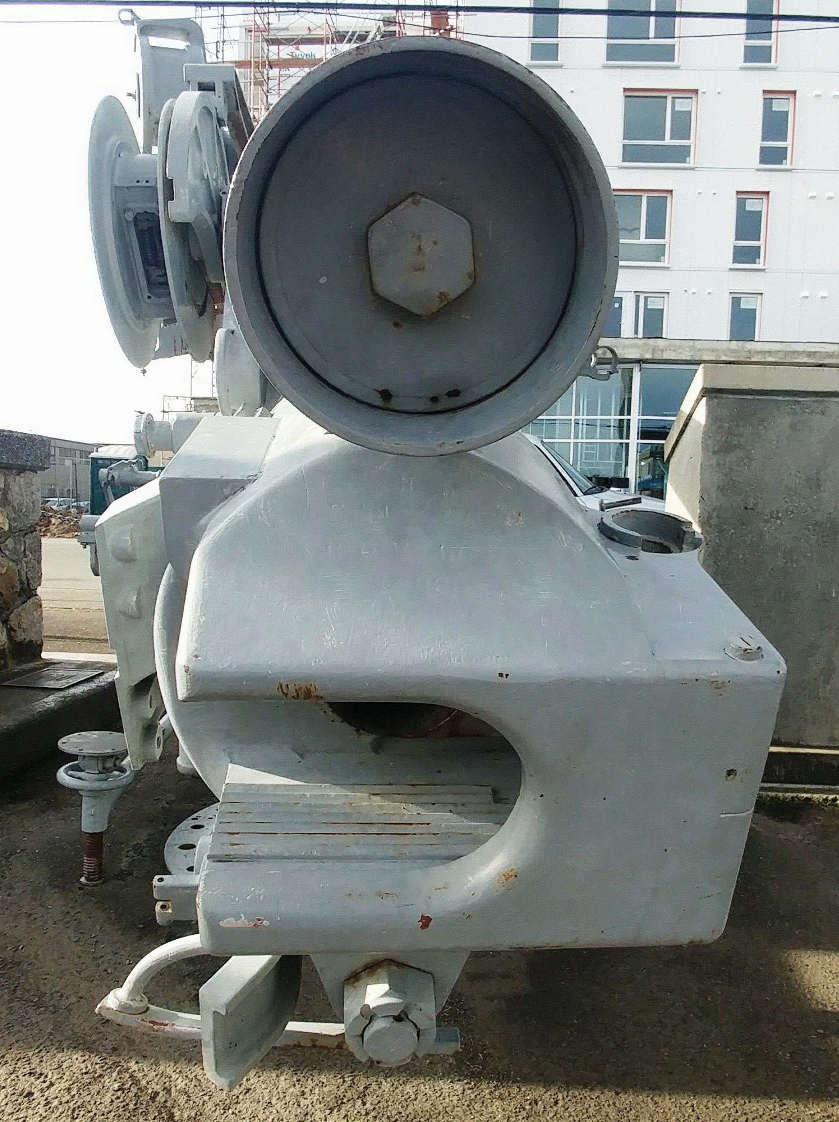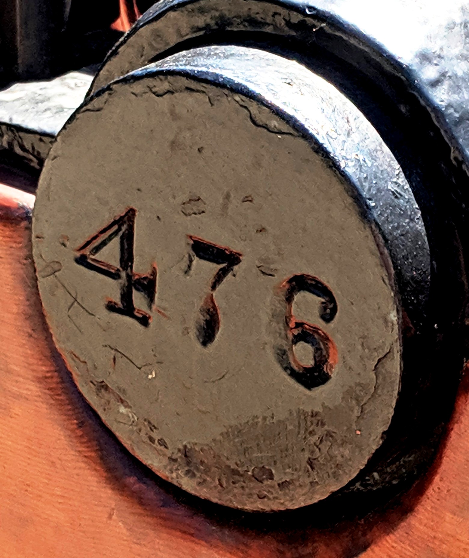 4-inch/50 caliber (102-mm) standard low-angle, quick-firing gun used by the US Navy. Stamped into the steel is “4 IN CARRIAGE. Stamped on a plate riveted to the steel is “4-50 carriage”. The stamping includes “Walter Scott & Co Inc Plainfield NJ”, 1943. The plate bears “Serial Number 5038”. The gun is mounted on a wet mount, used by US Navy submarines. John Eckersley.
