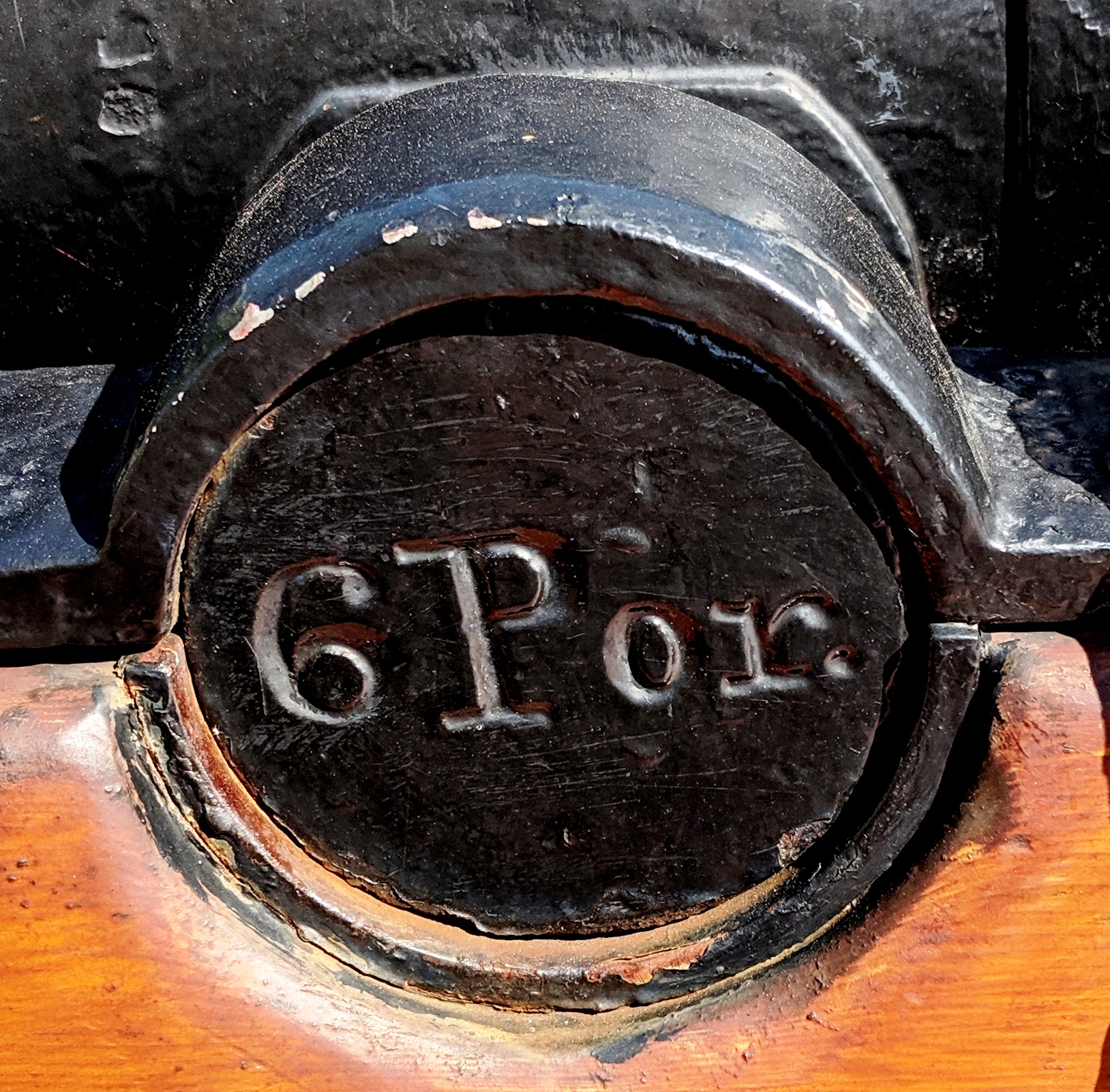 Blomefield 6-pounder 9-cwt Smoothbore Muzzleloading Gun, weight 9-1-23, (1,059 lbs), above No. 7, (Serial No. 484) on the left trunnion, 6-pdr on the right trunnion. B.P. & C. on the barrel (Bailey Pegg and Co- London and Staffordshire iron manufacturers. early 19th century to the 1960s, casting guns for commercial interests and foreign governments). This gun is mounted on a wooden naval gun carriage, No. 1 of 2 in front of the Nanaimo Bastion. One is used for firing demonstrations.