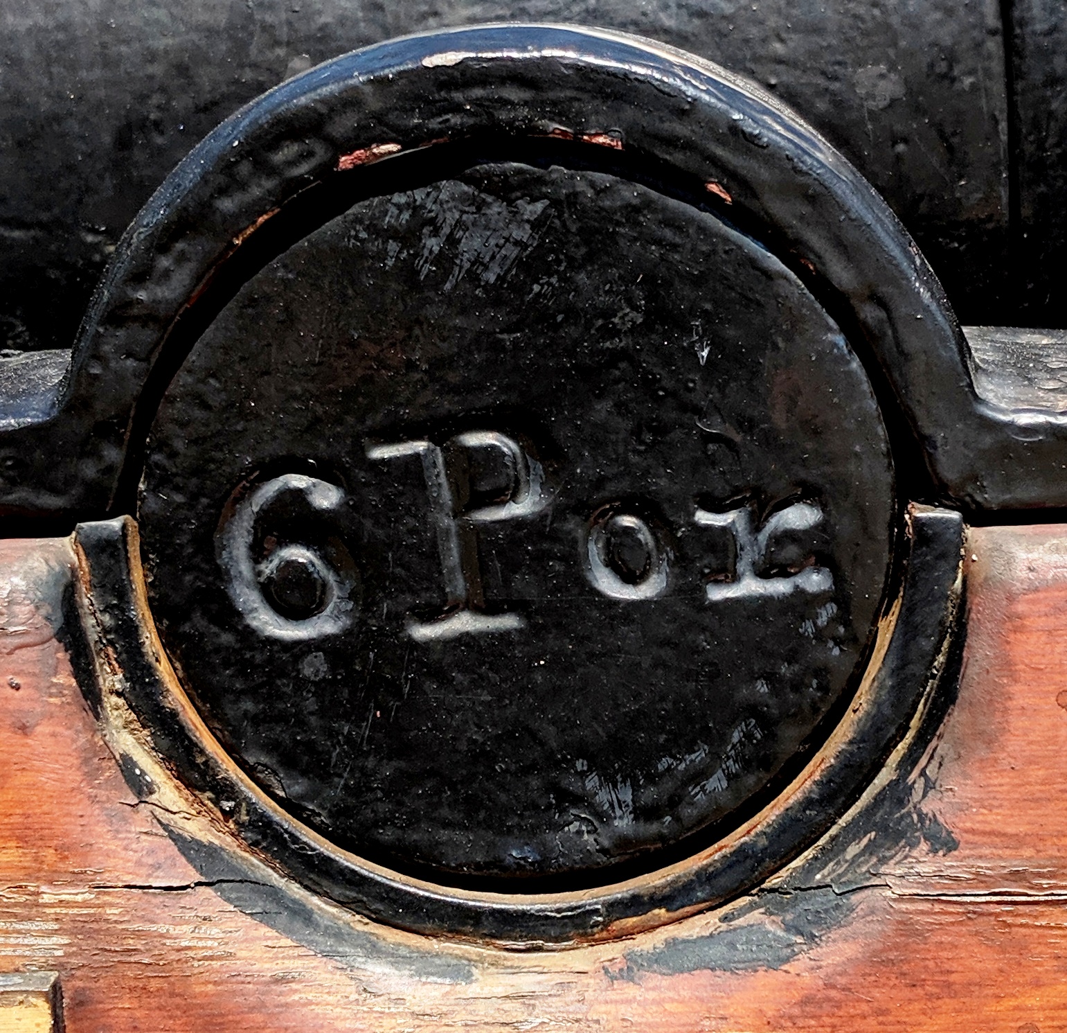 Blomefield 6-pounder 9-cwt Smoothbore Muzzleloading Gun, weight 9-1-23, (1,059 lbs), over No. 2, (Serial No. 476) on the left trunnion, 6-pdr on the right trunnion. B.P. & C. on the barrel. This gun is also mounted on a wooden naval gun carriage, No. 2 of 2 in front of the Nanaimo Bastion.