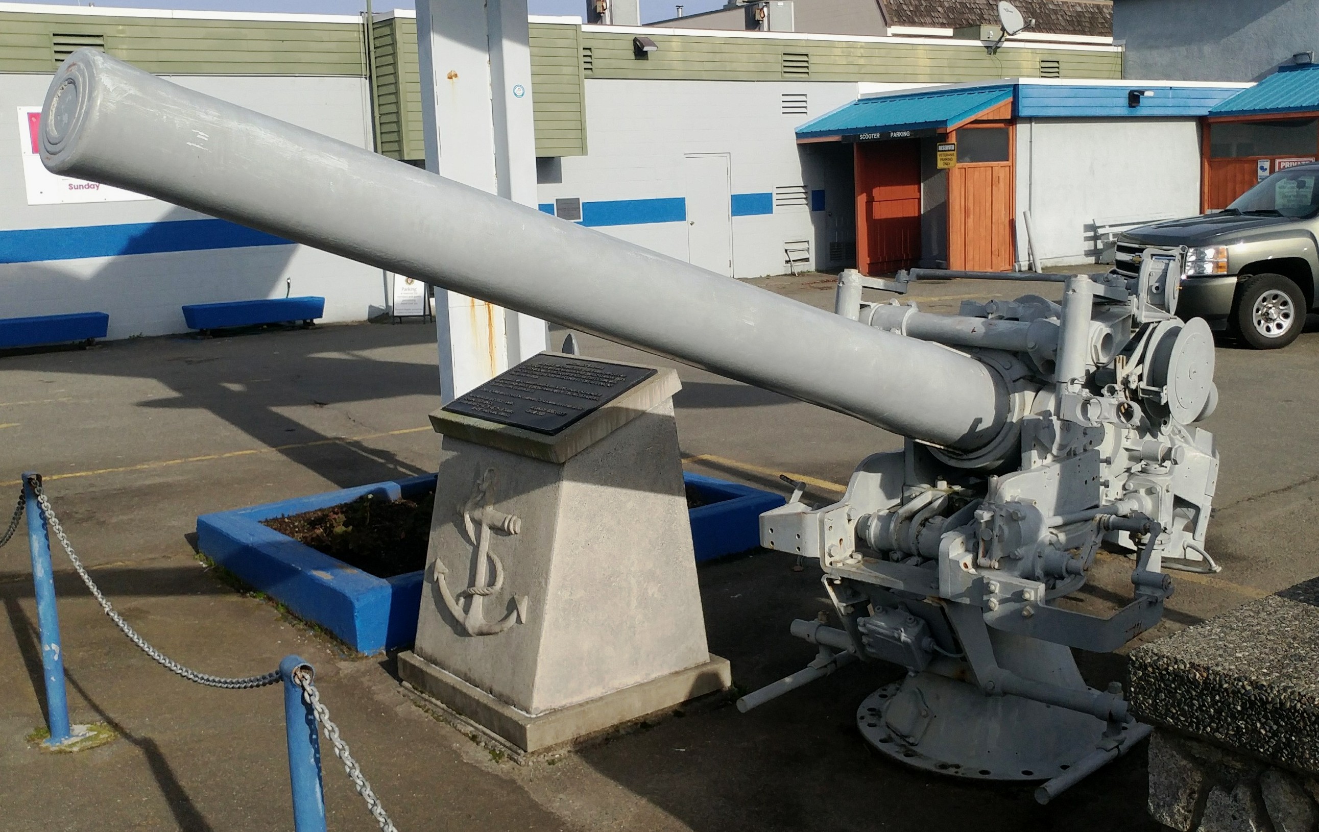 4-inch/45 QF Mk. IV Gun, on a single mount, (Serial No. 985), from HMCS Aurora. This naval gun is located in front of the Merchant Navy, Army, Navy & Air Force (ANAF) Hall, 9831 4th St.