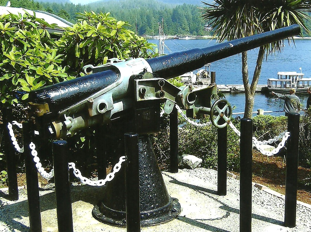 12-pounder 12-cwt QF Mk. V (3-inch/40) Breechloading Naval Gun (Ogden 3-inch Naval gun), from HMCS Thiepval, located at the harbour shore near the dock. HMCS Thiepval was one of twelve Battle-class naval trawlers used by the Royal Canadian Navy (RCN). After seeing service on Canada’s east coast at the end of the First World War, HMCS Thiepval was transferred to the west coast, where she spent the remainder of her career. In 1924, Thiepval visited the Soviet Union and Japan as part of the support efforts for a round-the-world flight attempt. HMCS Thiepval struck a rock and sank off the British Columbia coast in 1930, and her wreck has since become a popular attraction for divers. The channel is now named for the ship in the Broken Group Islands. The gun has no shield and is deeply pitted from its long submersion in salt water.