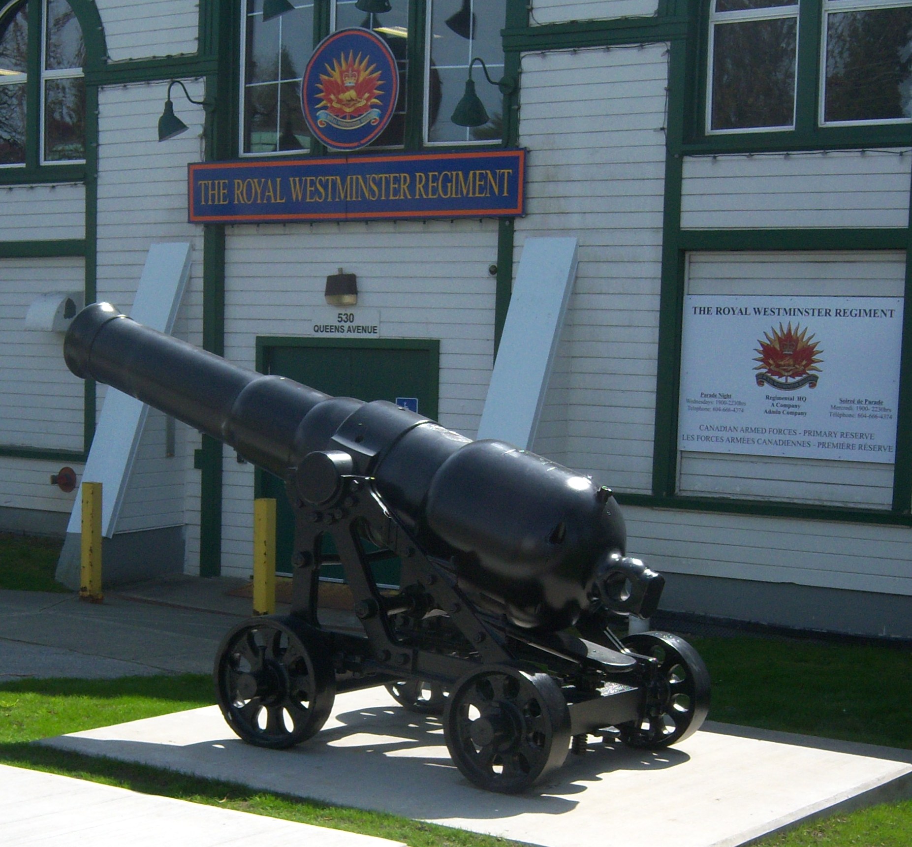 No one knows how the cannon got from their former position and onto the concrete bases that had been built at Westminster Quay, but they were removed from that location when the Royal Westminster Regiment Association restoration operation (headed by 2Lt G.T. McNabb) rescued them. The City of New Westminster was not involved in the restoration, and the entire cost was borne by the RWRA. The wood for the complete replacement of the carriages was donated by a local forestry company (which actually had to cut down a tree in order to produce pieces of wood of sufficient size, the kilning of the wood was donated by a lumber company in Squamish, the actual construction of the carriages was done, gratis, by the Burnaby Village Museum’s restoration carpenter and woodworker (who had already done the restoration of the vintage carousel) and all of the ironmongery was done, at no charge, by the blacksmith at the BVM. When the cannon were emplaced in front of the New Westminster City Hall, it was with the understanding that the City of New Westminster would properly care for them. Some restoration work is ongoing.