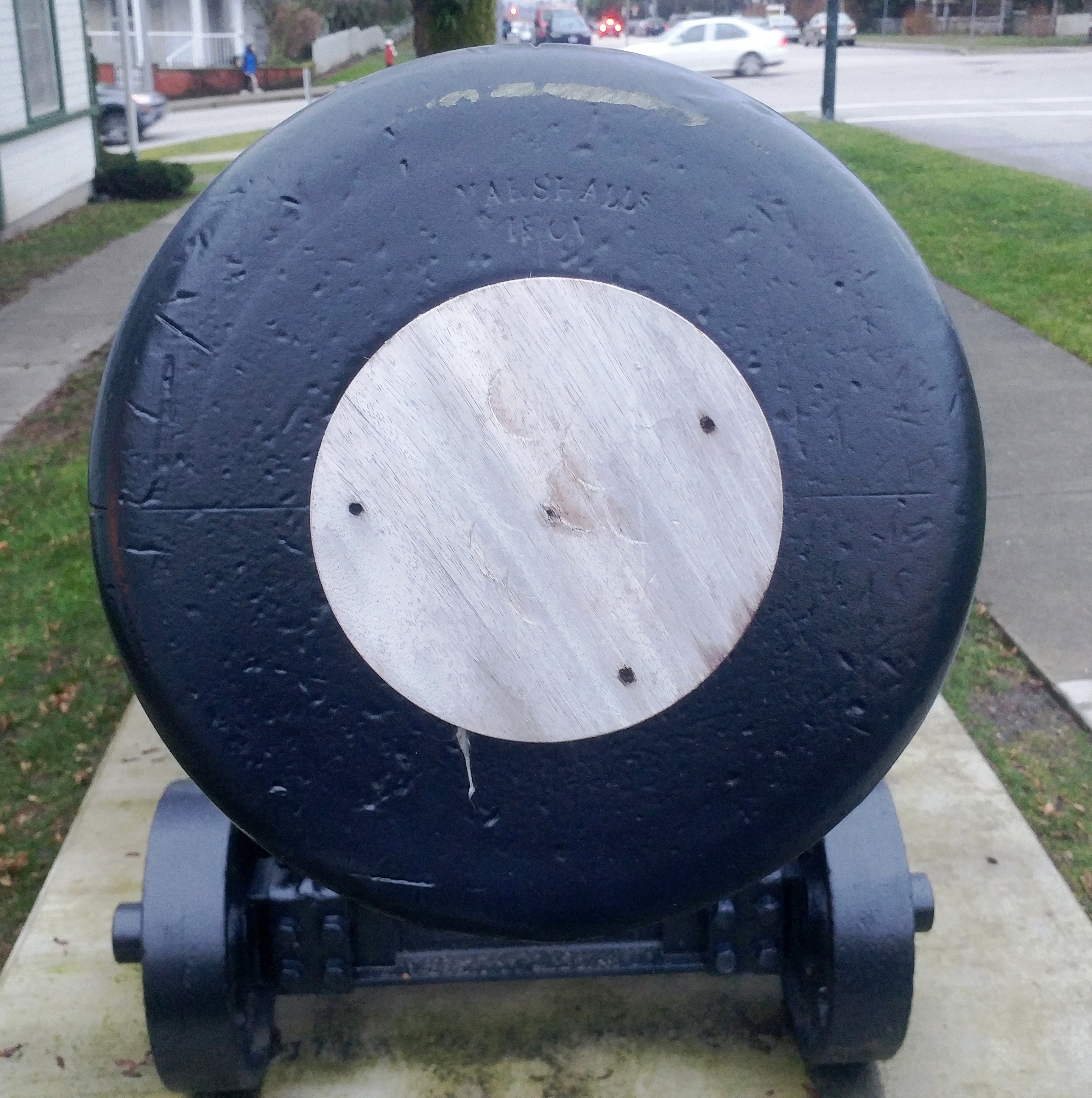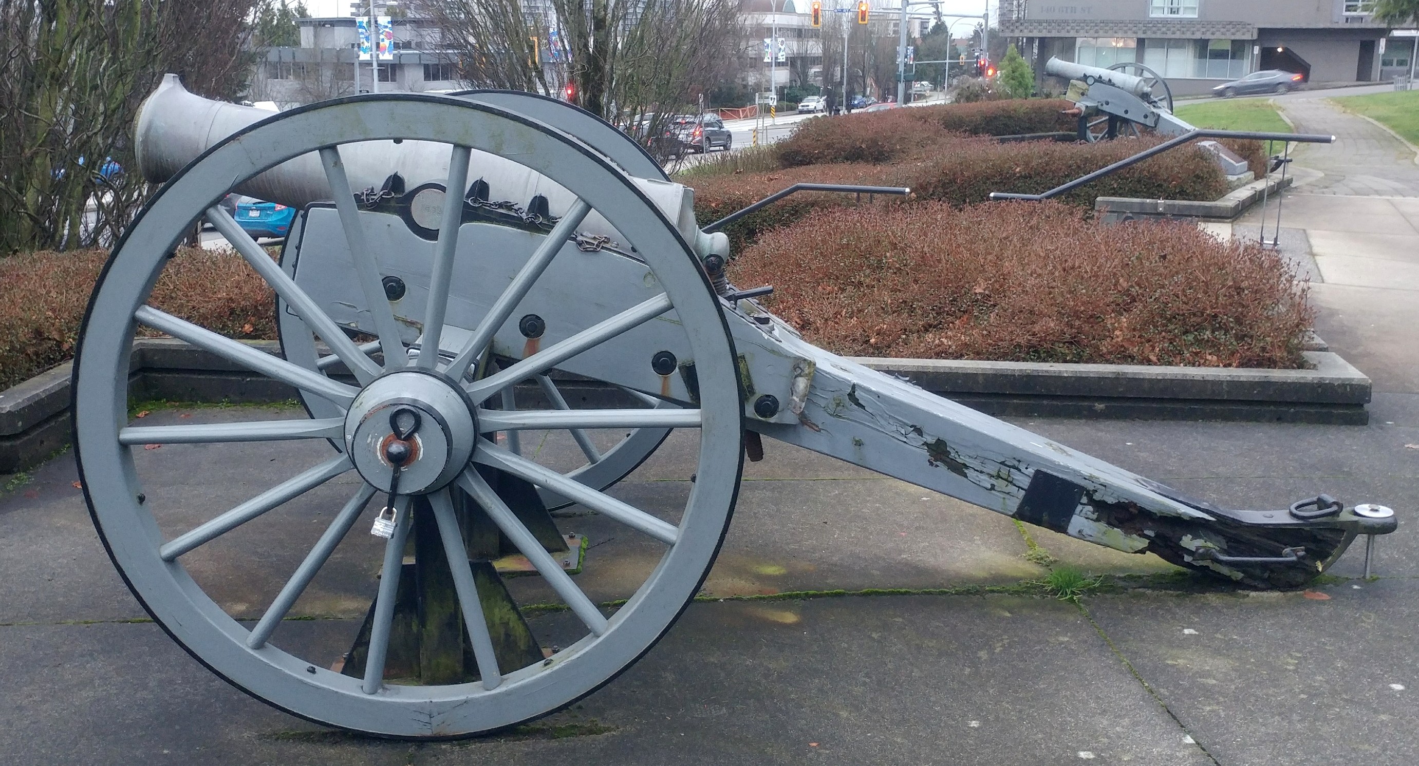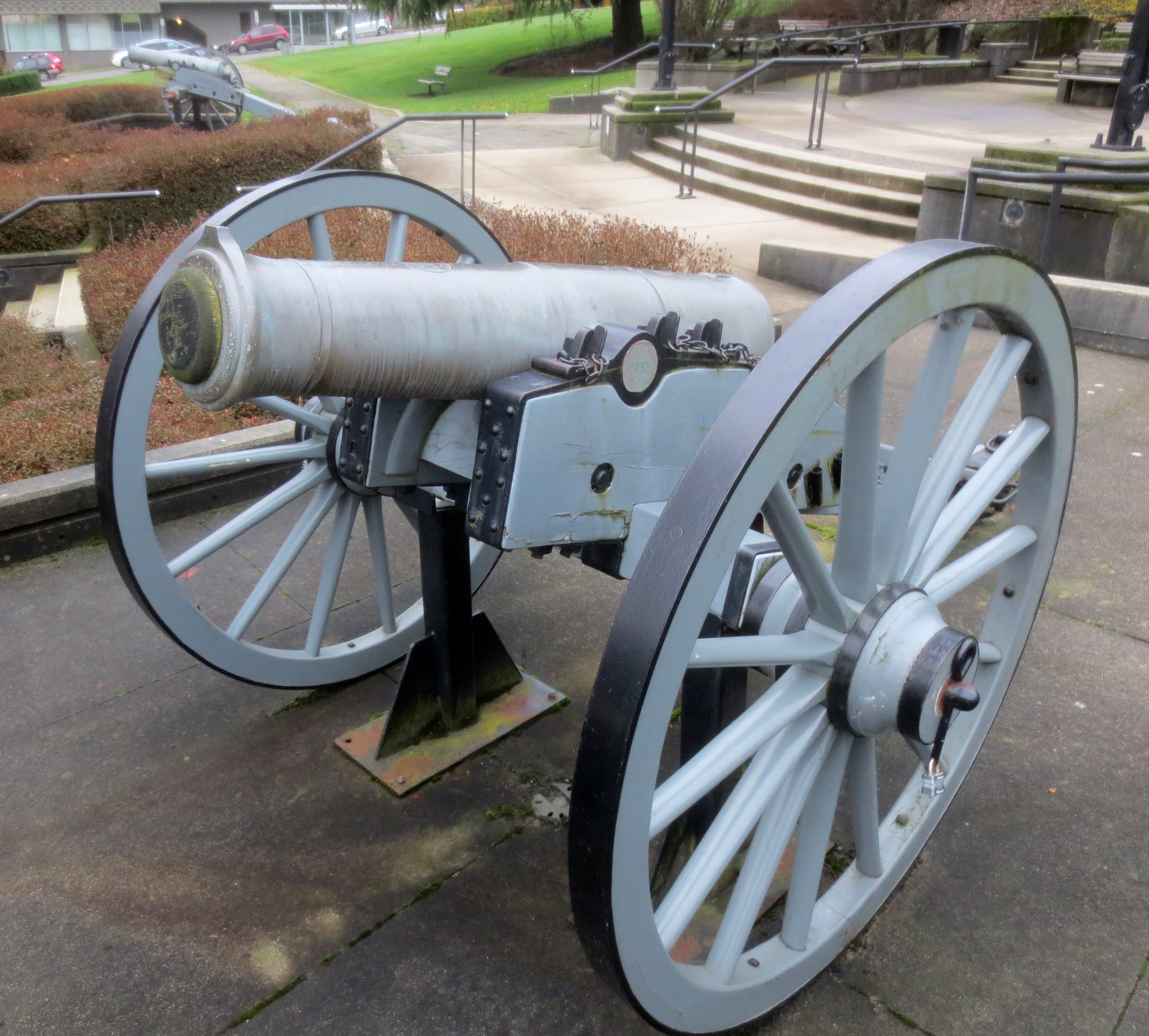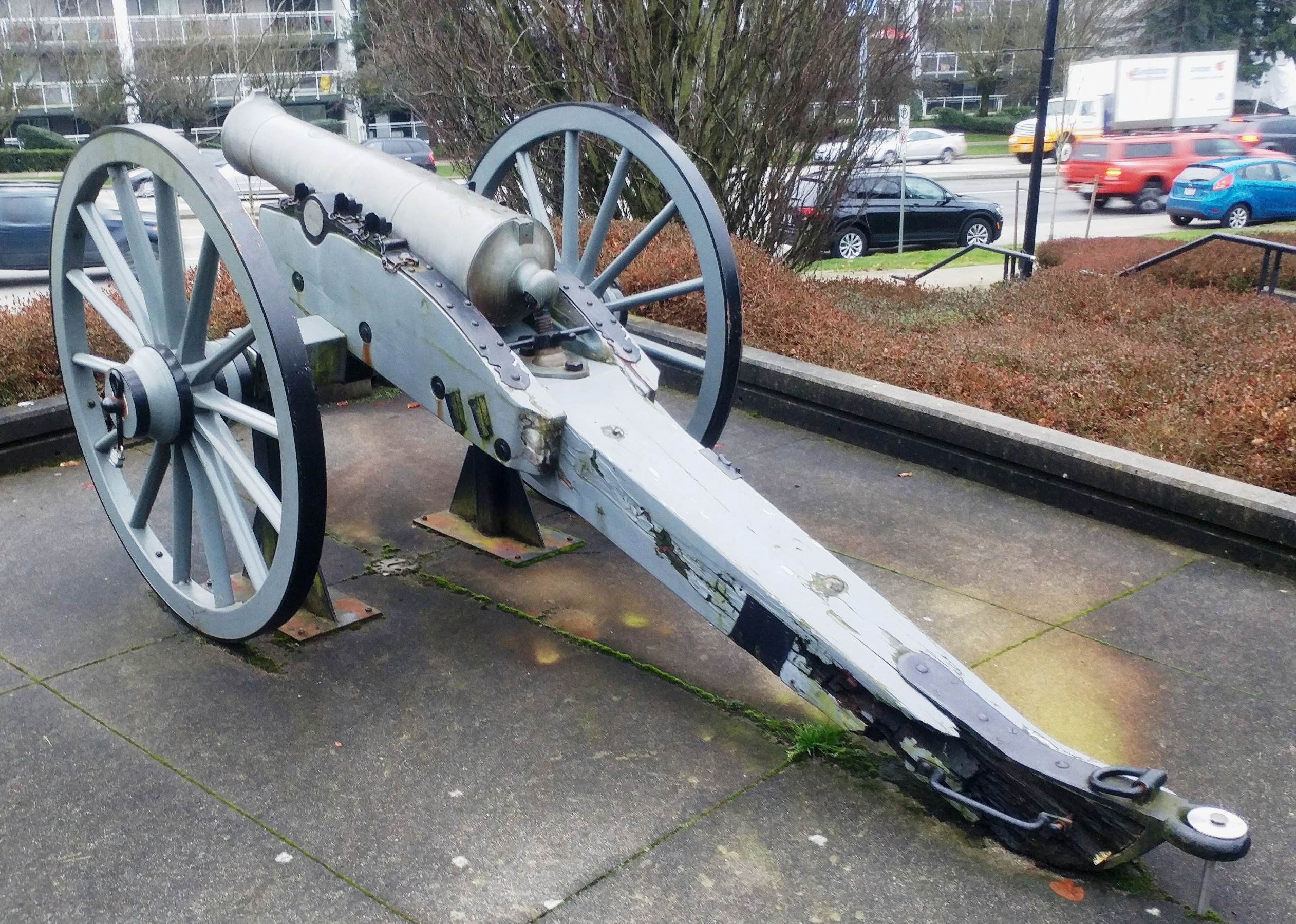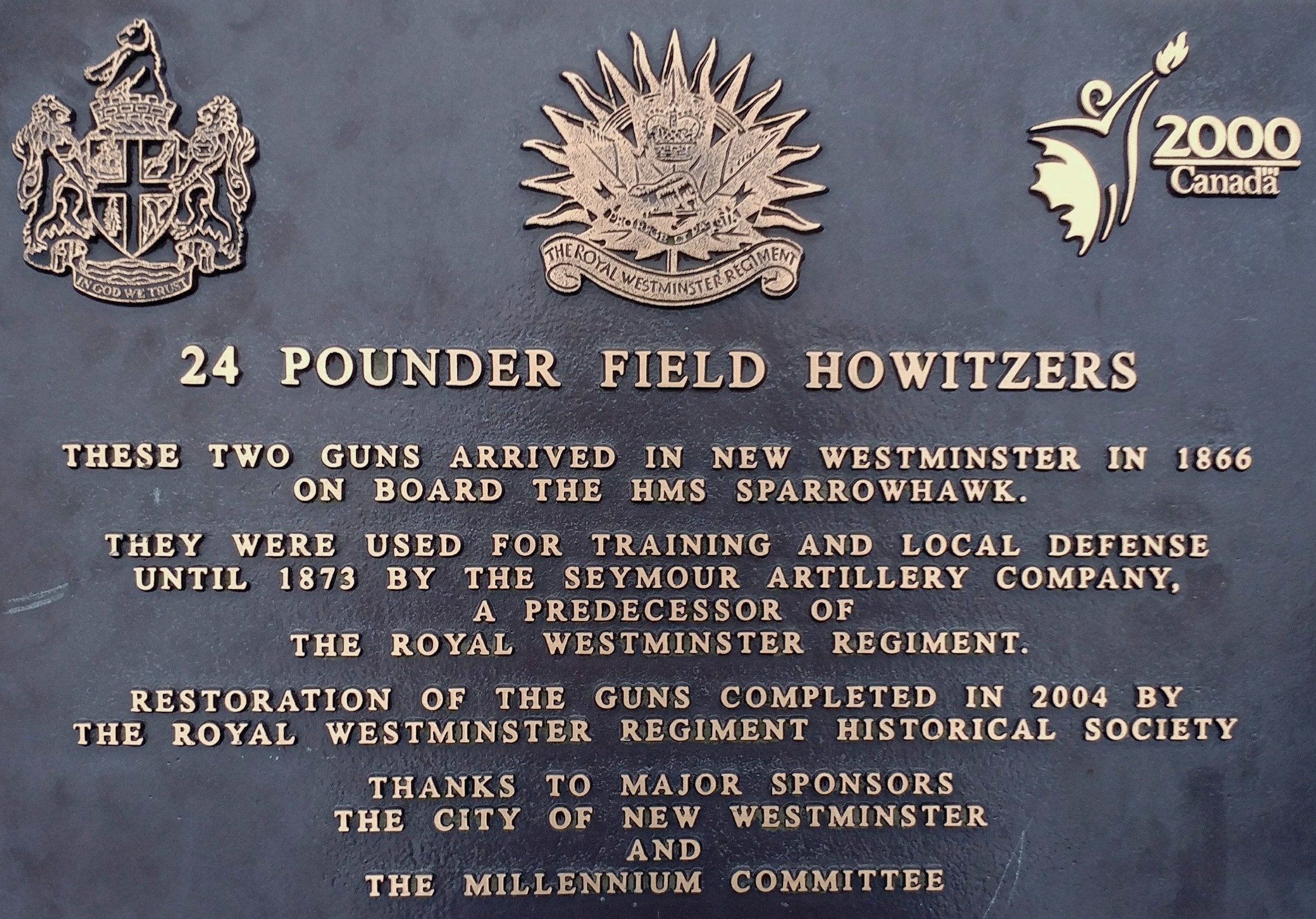 Bronze 24-pounder 12-cwt Smoothbore Muzzleloading Howitzer, weight 12-2-24 (1,424 lbs), 1858 on the left trunnion, Serial No. DCCXV (615), on the right trunnion, Queen Victoria (1837 to 1901) cypher, 4858 with broad arrow on the barrel, F.M. EARDLEY-WILMOT (Frederick Marow Eardley-Wilmot) above the cascabel. Mounted on a wheeled carriage, No. 1 of 2 on display in front of City Hall. These guns arrived on 15 Sep 1866 on HMS Sparrowhawk and were used for training and defence in British Columbia until 1873.