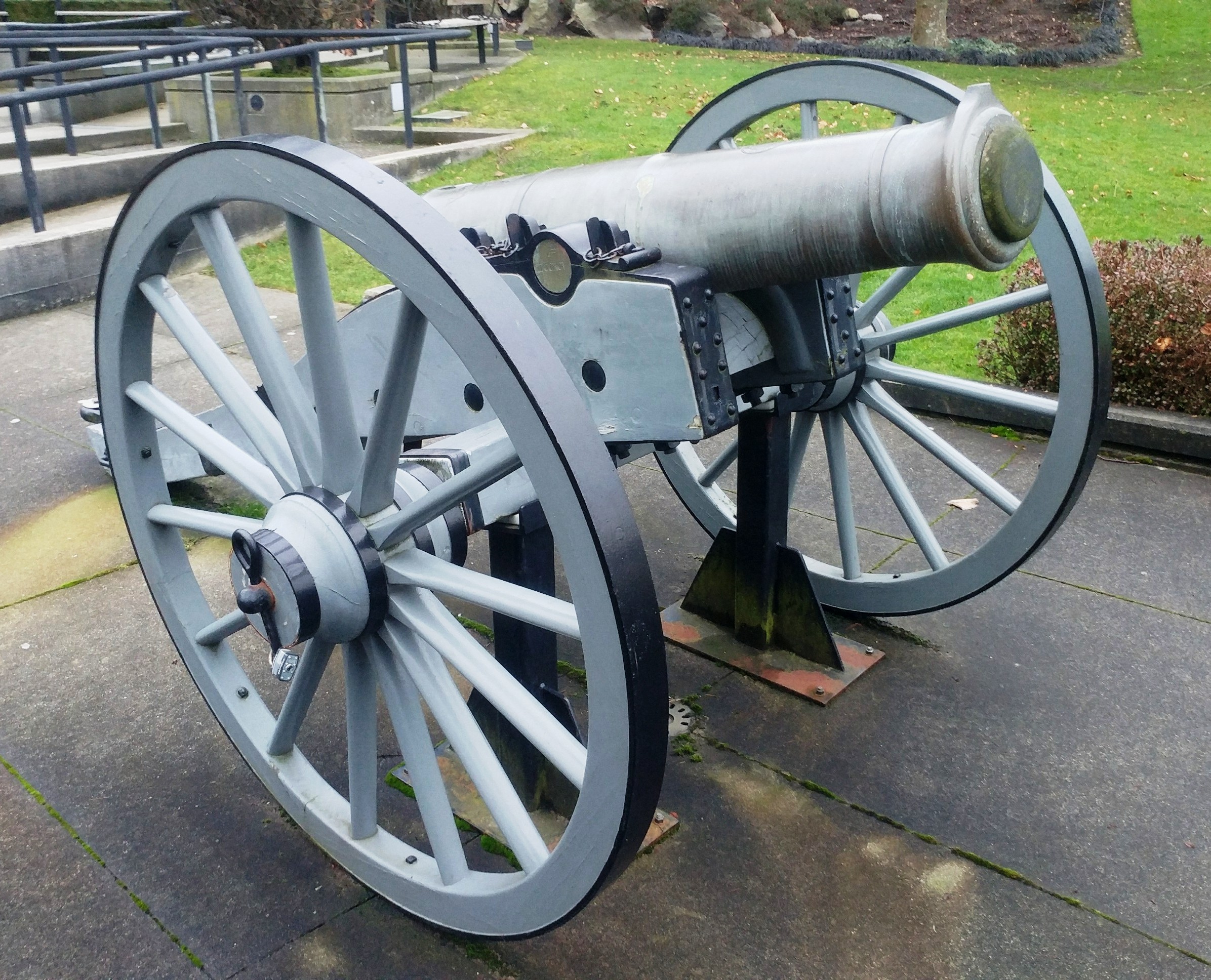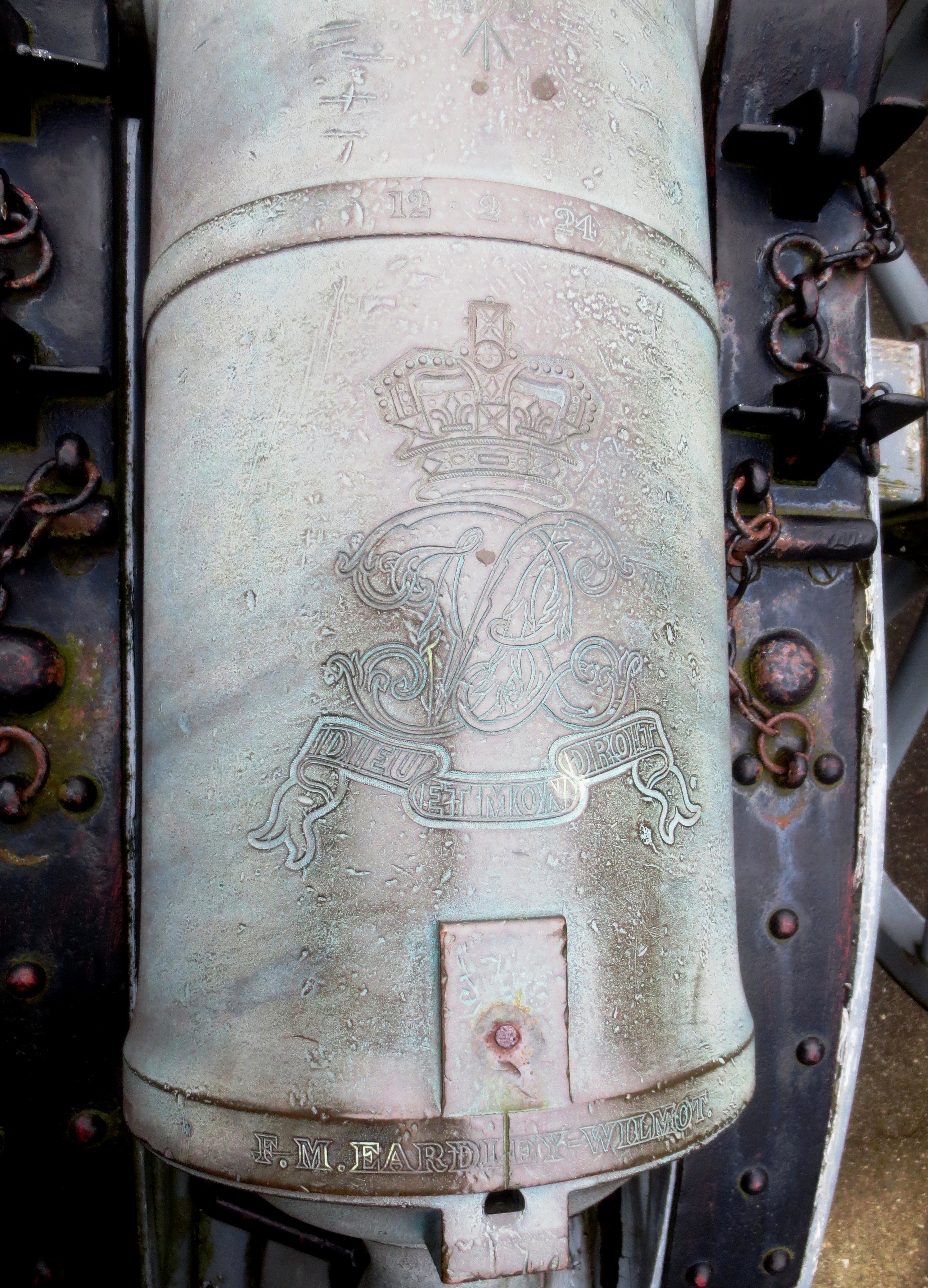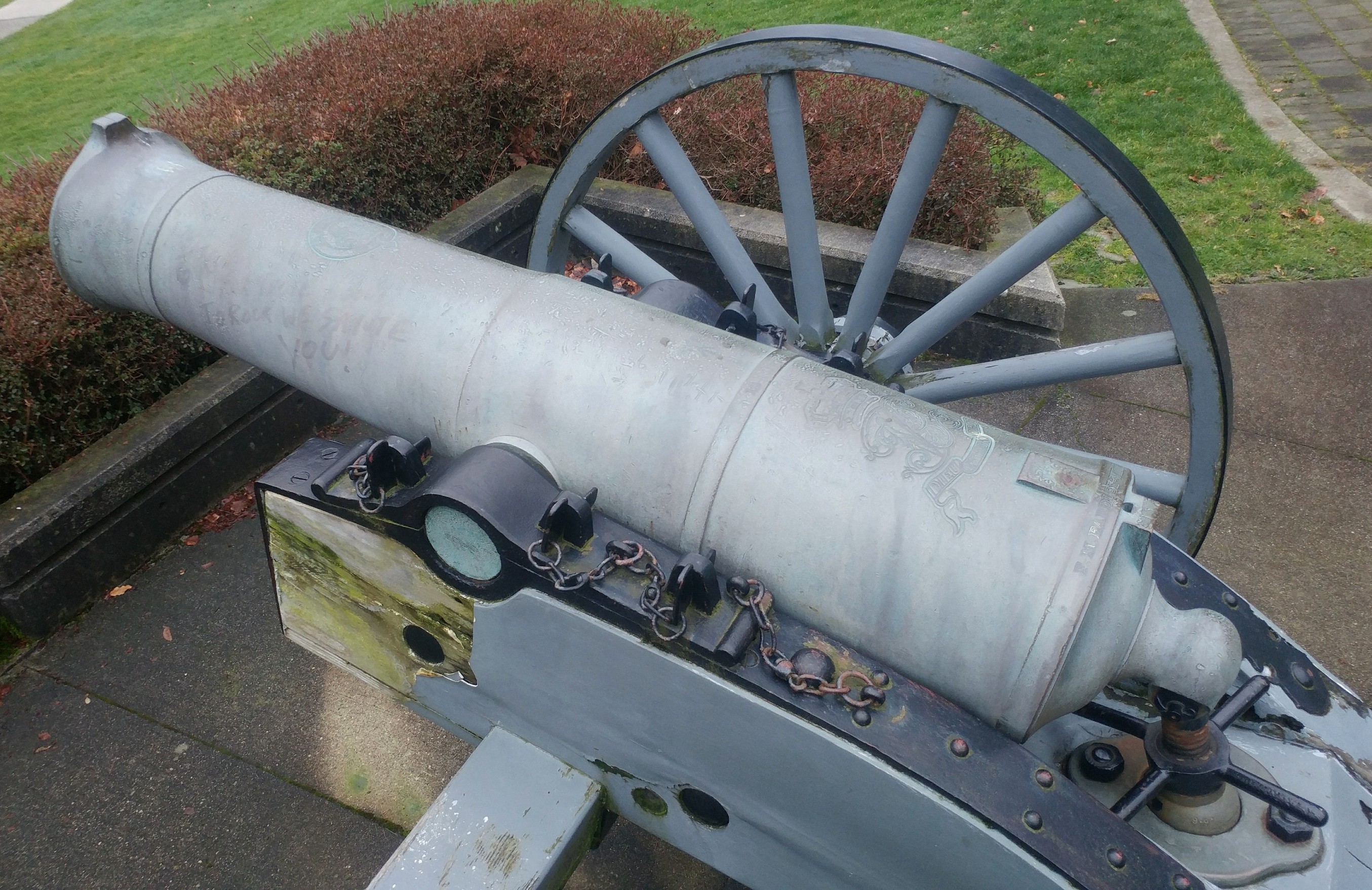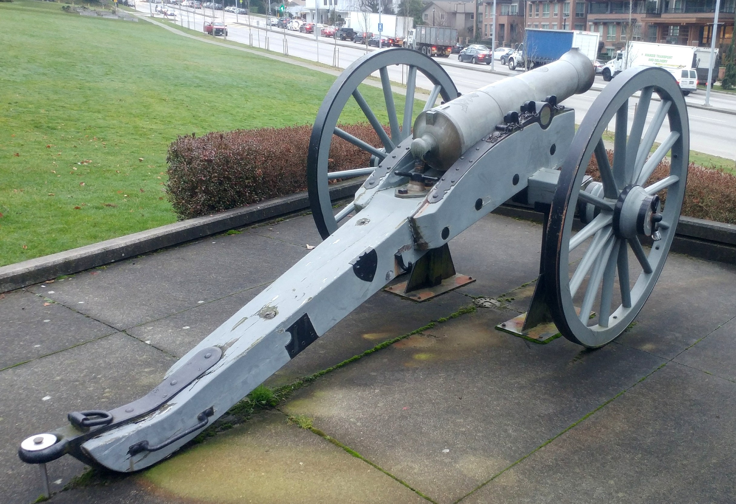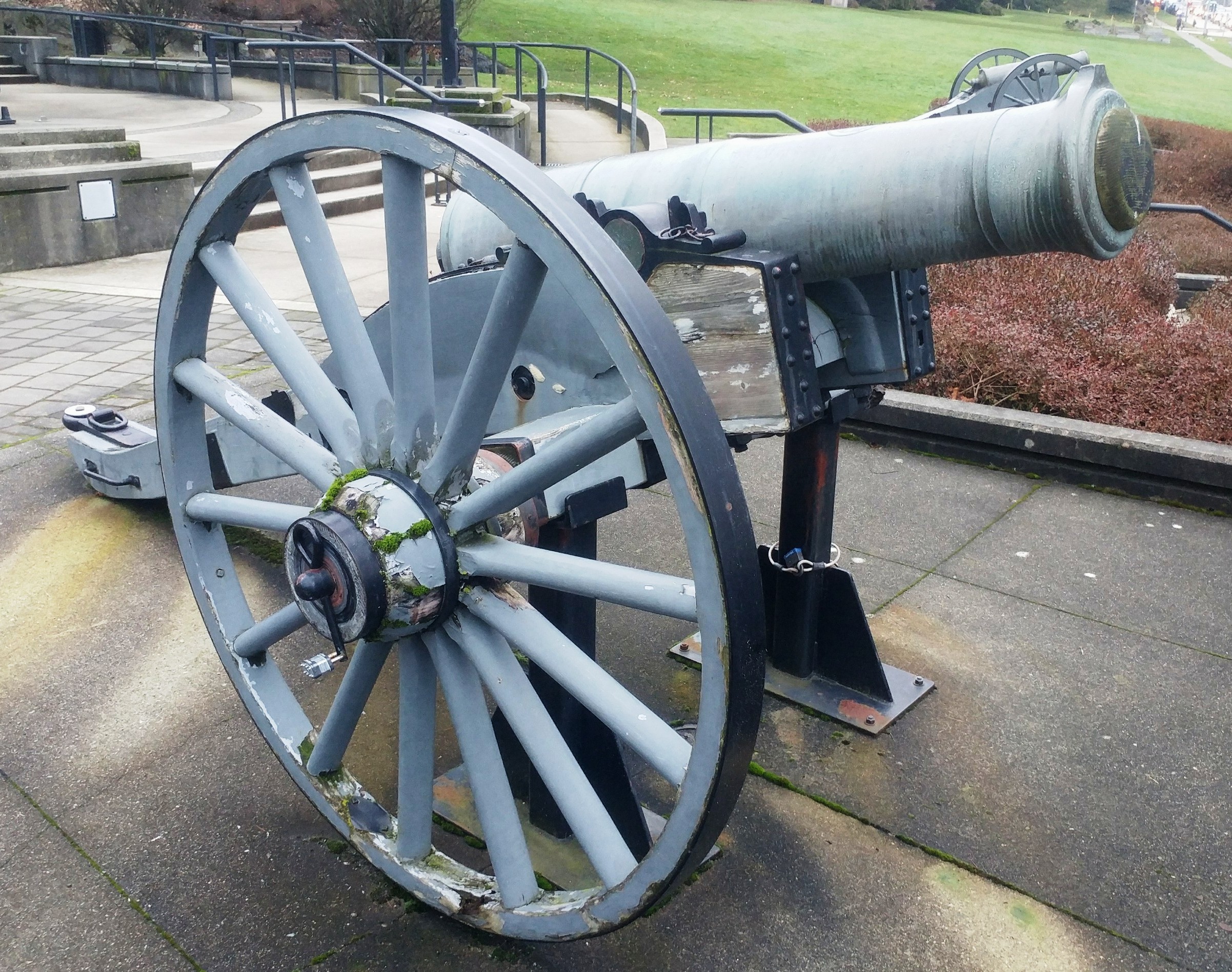 Bronze 24-pounder 12-cwt Smoothbore Muzzleloading Howitzer, weight 12-2-24 (1,424 lbs), 1858 on the left trunnion, Serial No. DCCXV (615), on the right trunnion, Queen Victoria (1837 to 1901) cypher, 4858 with broad arrow on the barrel, F.M. EARDLEY-WILMOT (Frederick Marow Eardley-Wilmot) above the cascabel. Mounted on a wheeled carriage, No. 1 of 2 on display in front of City Hall. These guns arrived on 15 Sep 1866 on HMS Sparrowhawk and were used for training and defence in British Columbia until 1873.