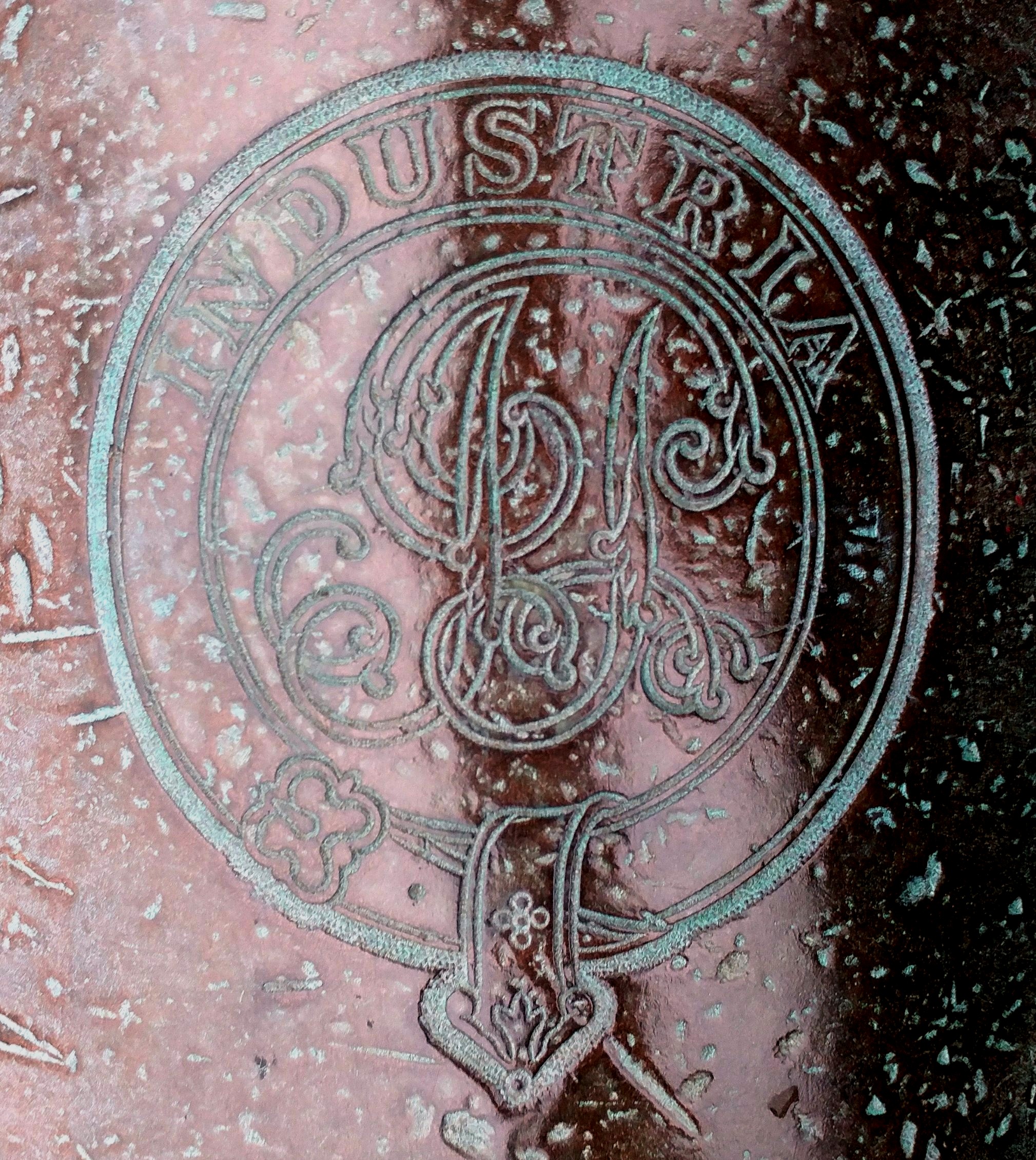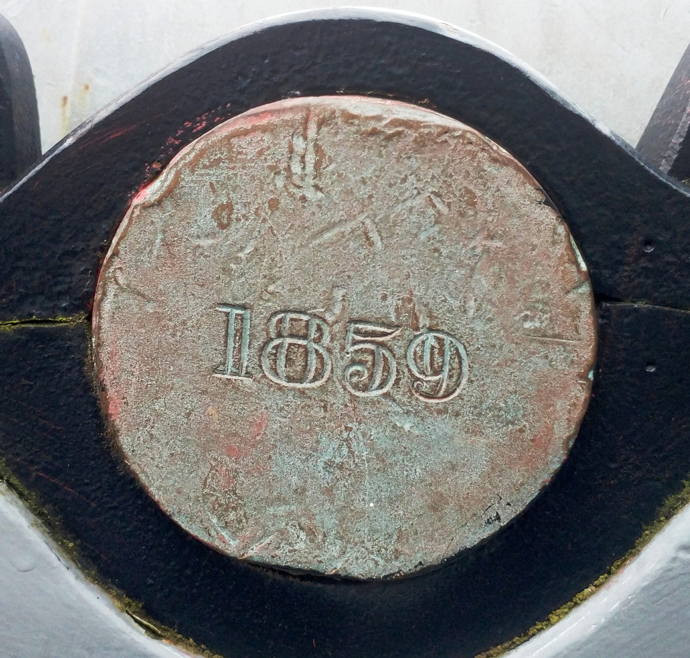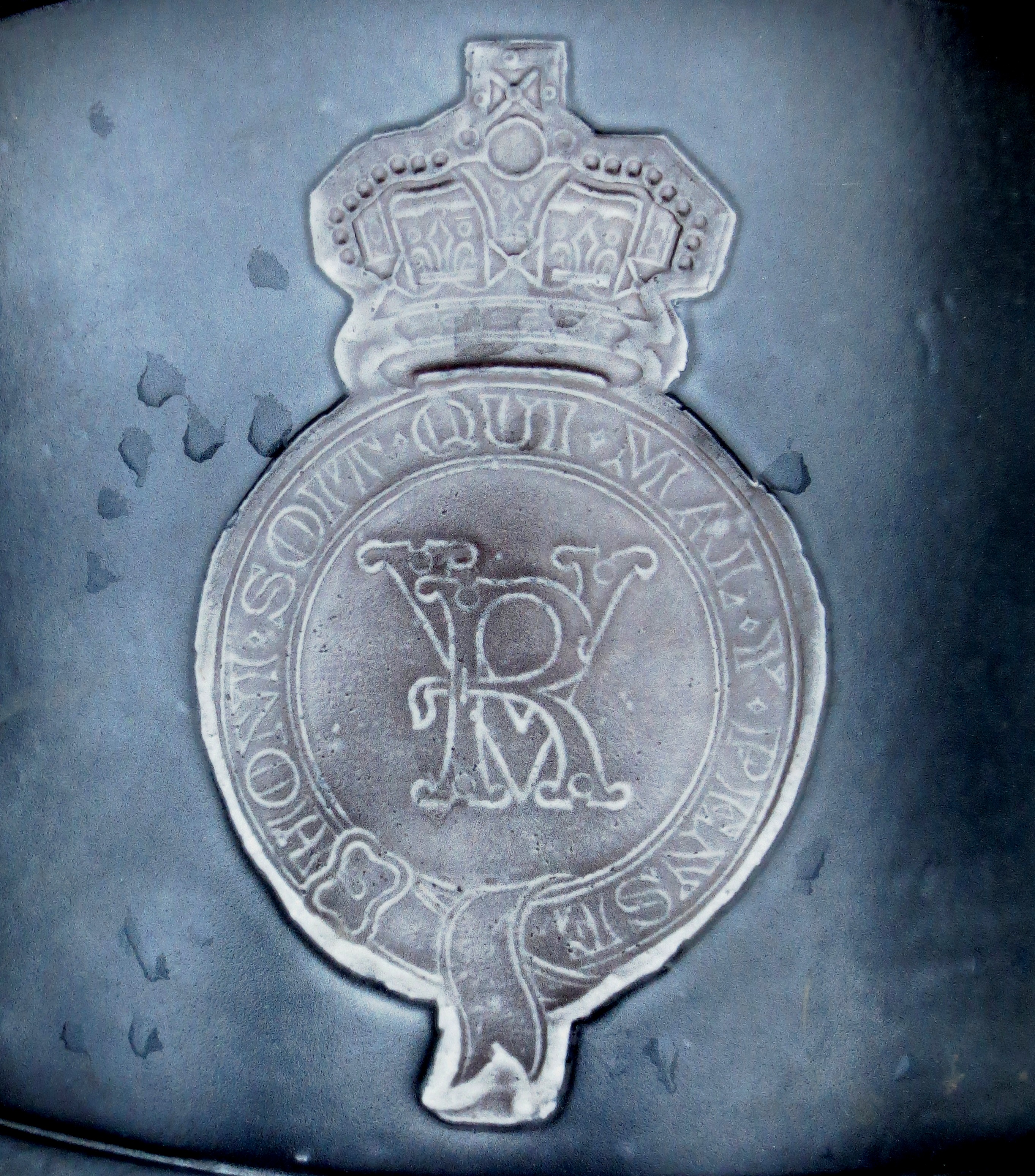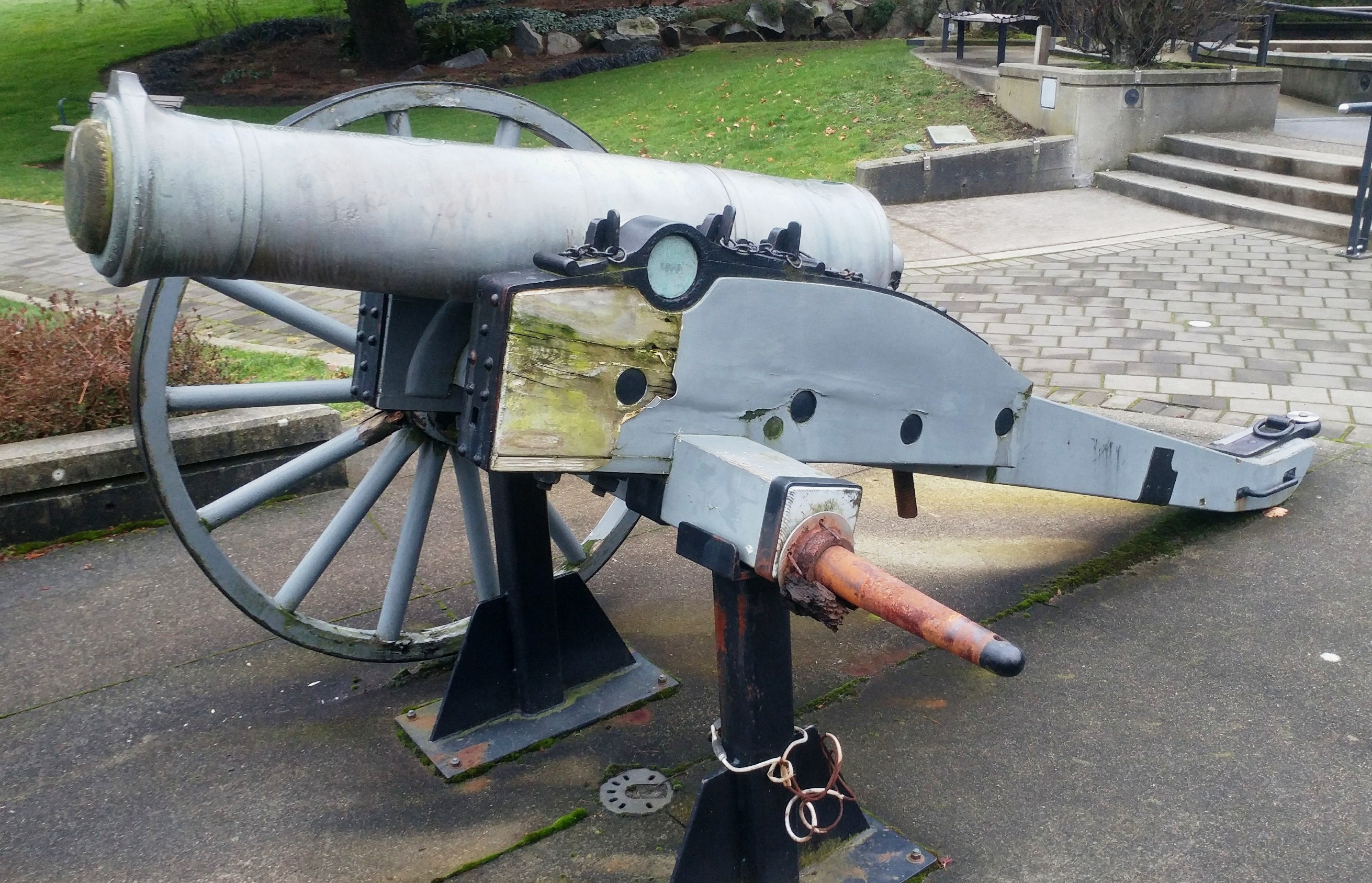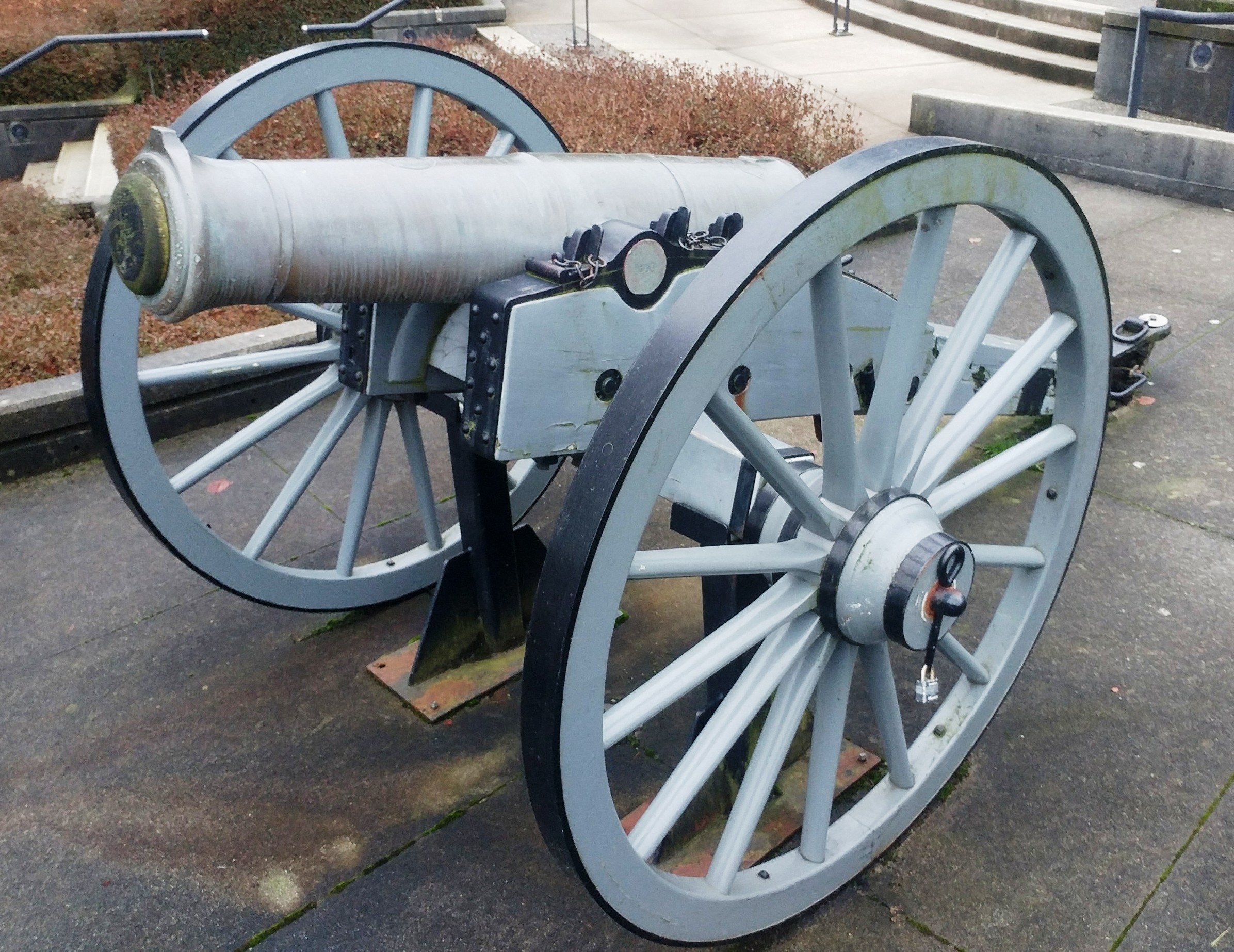 Bronze 24-pounder 12-cwt Smoothbore Muzzleloading Howitzer, weight 12-2-24 (1,424 lbs), 1858 on the left trunnion, Serial No. DCCXV (615), on the right trunnion, Queen Victoria (1837 to 1901) cypher, 4858 with broad arrow on the barrel, F.M. EARDLEY-WILMOT (Frederick Marow Eardley-Wilmot) above the cascabel. Mounted on a wheeled carriage, No. 1 of 2 on display in front of City Hall. These guns arrived on 15 Sep 1866 on HMS Sparrowhawk and were used for training and defence in British Columbia until 1873.