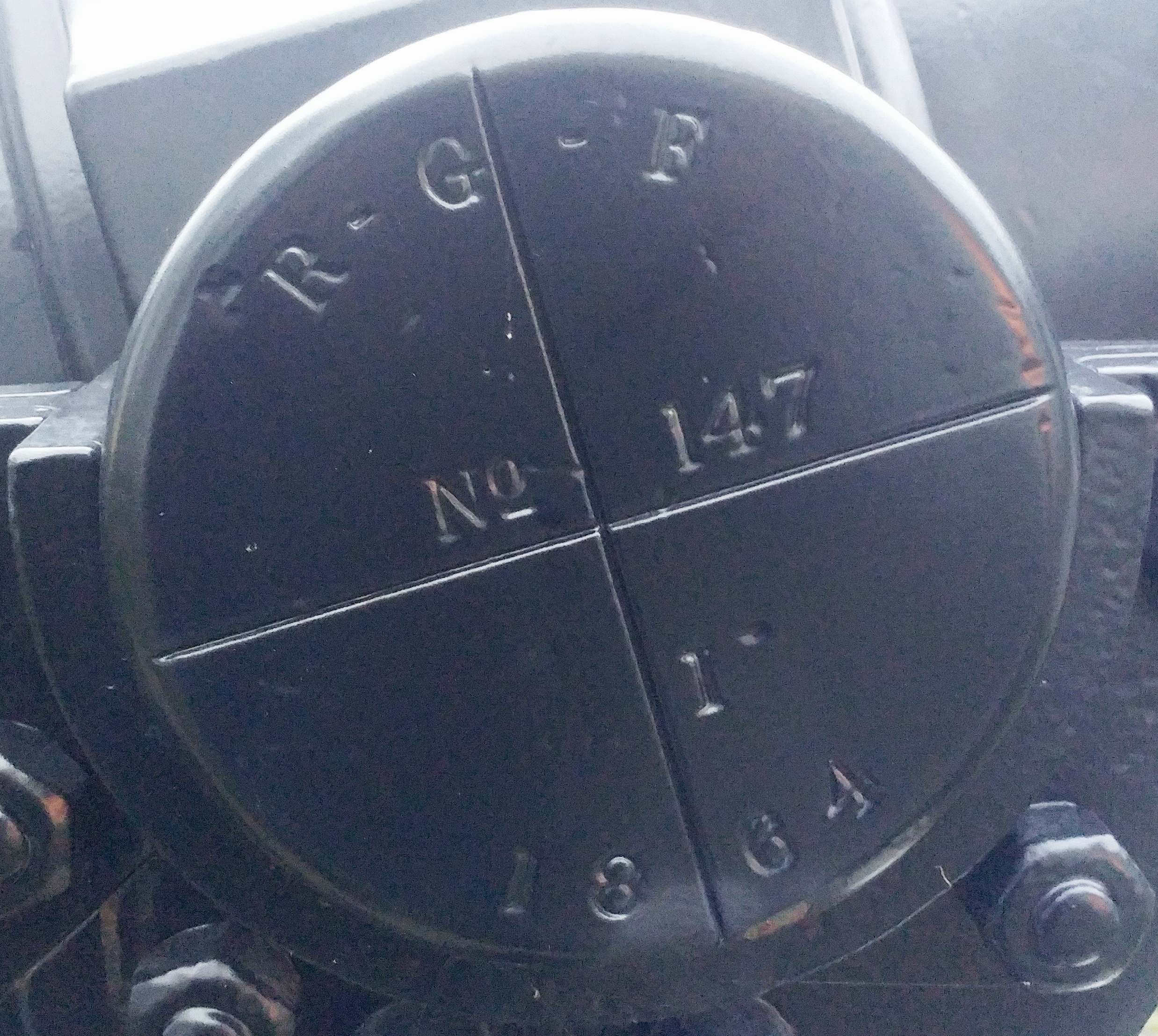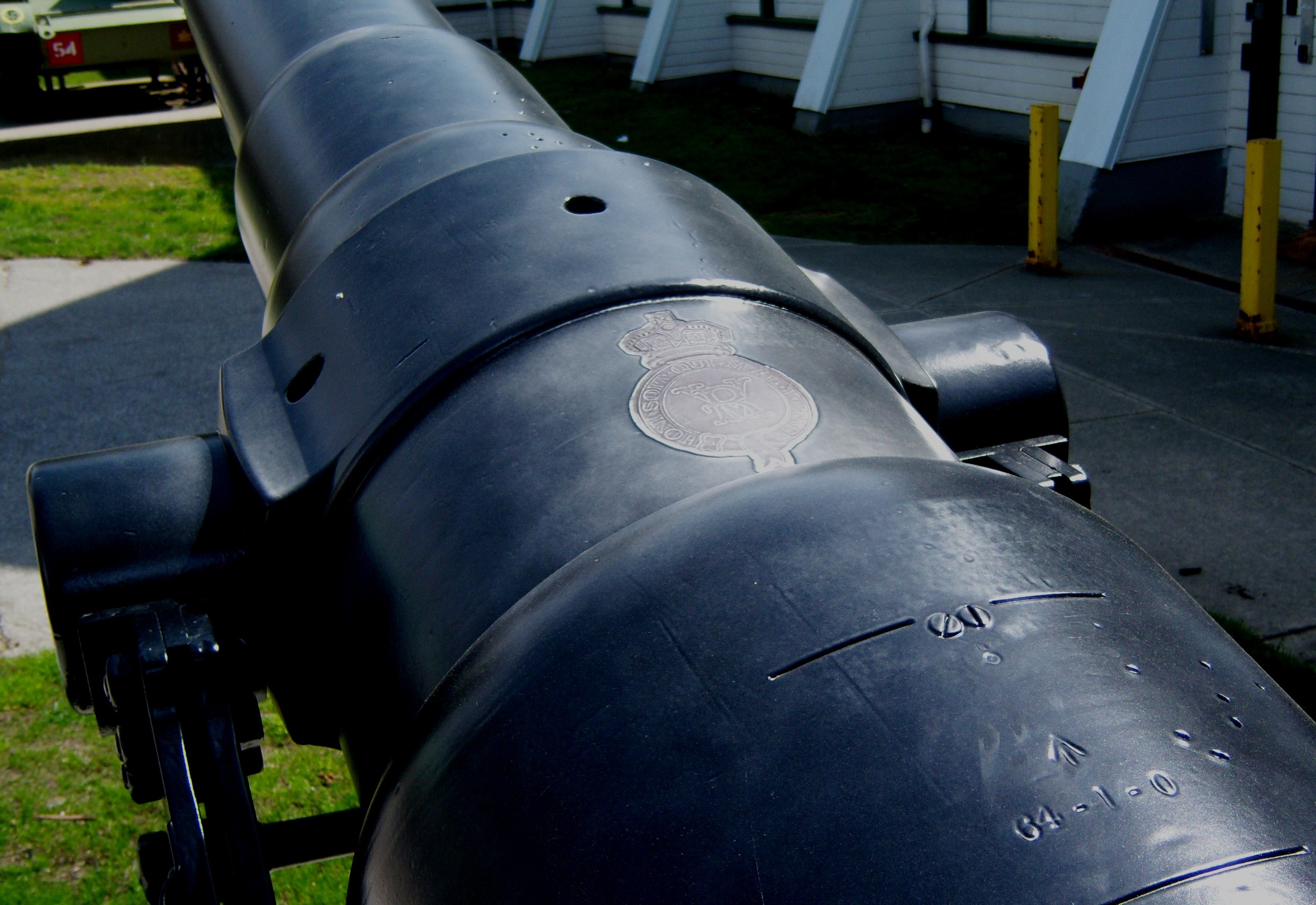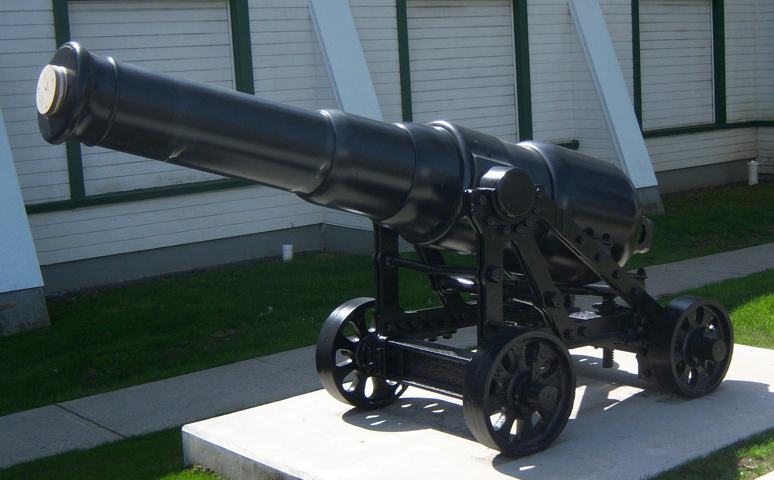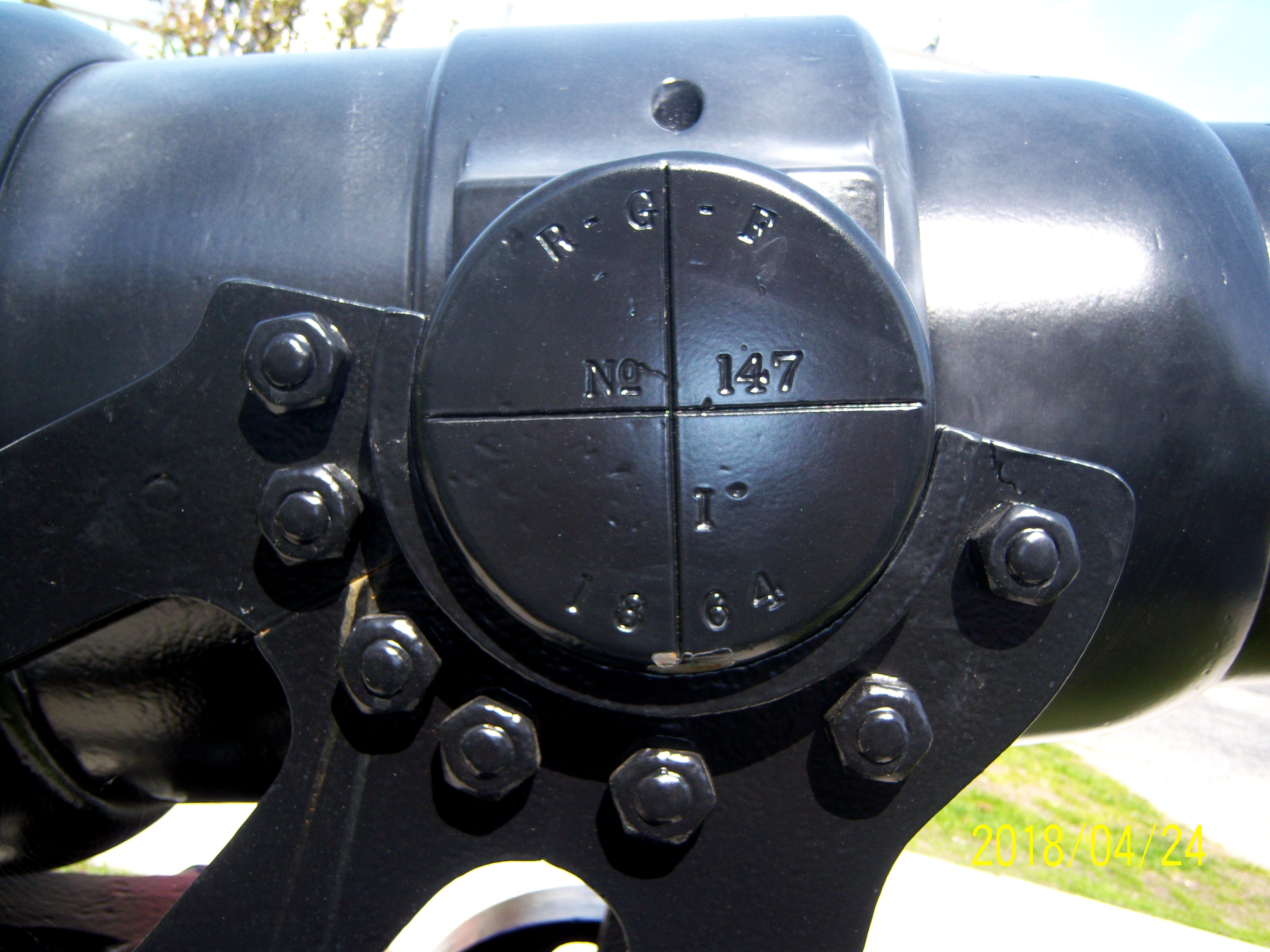 64-pounder 71-cwt Converted Rifled Muzzleloading Gun with Millar-pattern breeching ring, weight 64-1-0 (7,196 lbs), RGF No. 147, 1864 on the left trunnion, mounted on an iron garrison carriage. The gun is from the lower deck of a British Man of War, from redundant stores of the Royal Navy Dockyard sent to Victoria, in 1895. It stands in front of the Armoury, home of the Museum of the Royal Westminster Regiment, 530 Queenâs Avenue.