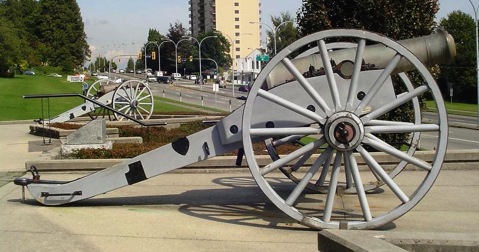 For many years these two bronze 24-pounder SBML howitzers were on display on either side of the monument to Simon Fraser near the Pattullo Bridge in New Westminster. They were later moved to New Westminster Quay, before being placed on display in their present location in front of the New Westminster City Hall. These howitzers are reported to be the ones that were issued to the Seymour Battery of Garrison Artillery, which was the first artillery unit to be formed in BC in 1866. (Dale Mumford)