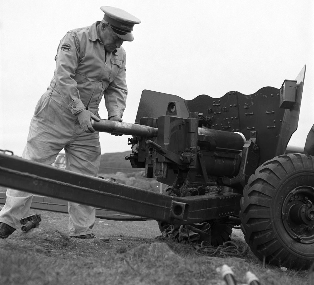 6-pounder AT Gun being loaded by Pat Brophy on Signal Hill, 1959.