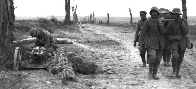Canadian soldier examining a German First World War 7.58-cm leMW trench mortar as German prisoners carrying their wounded pass by him during the advance East of Arras, France, Aug 1918.