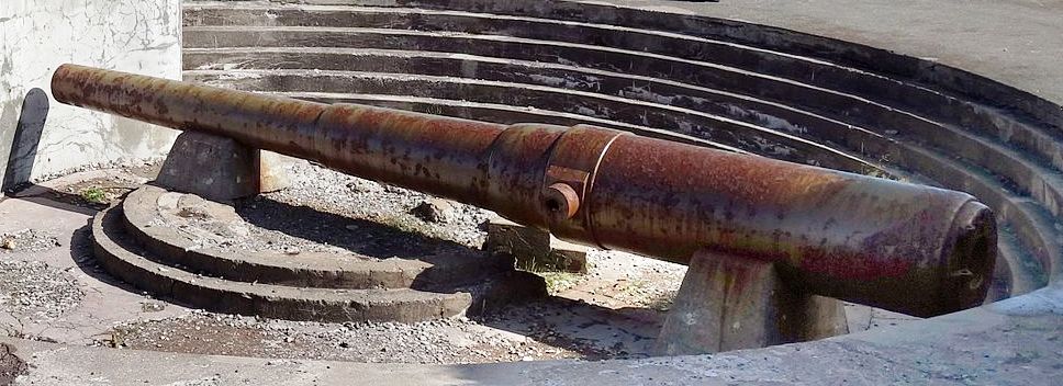 Smoothbore Muzzleloading Gun, heavily corroded, on private property across the harbour.