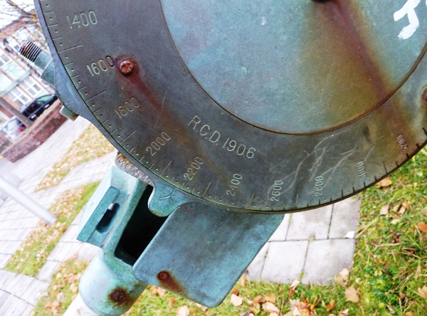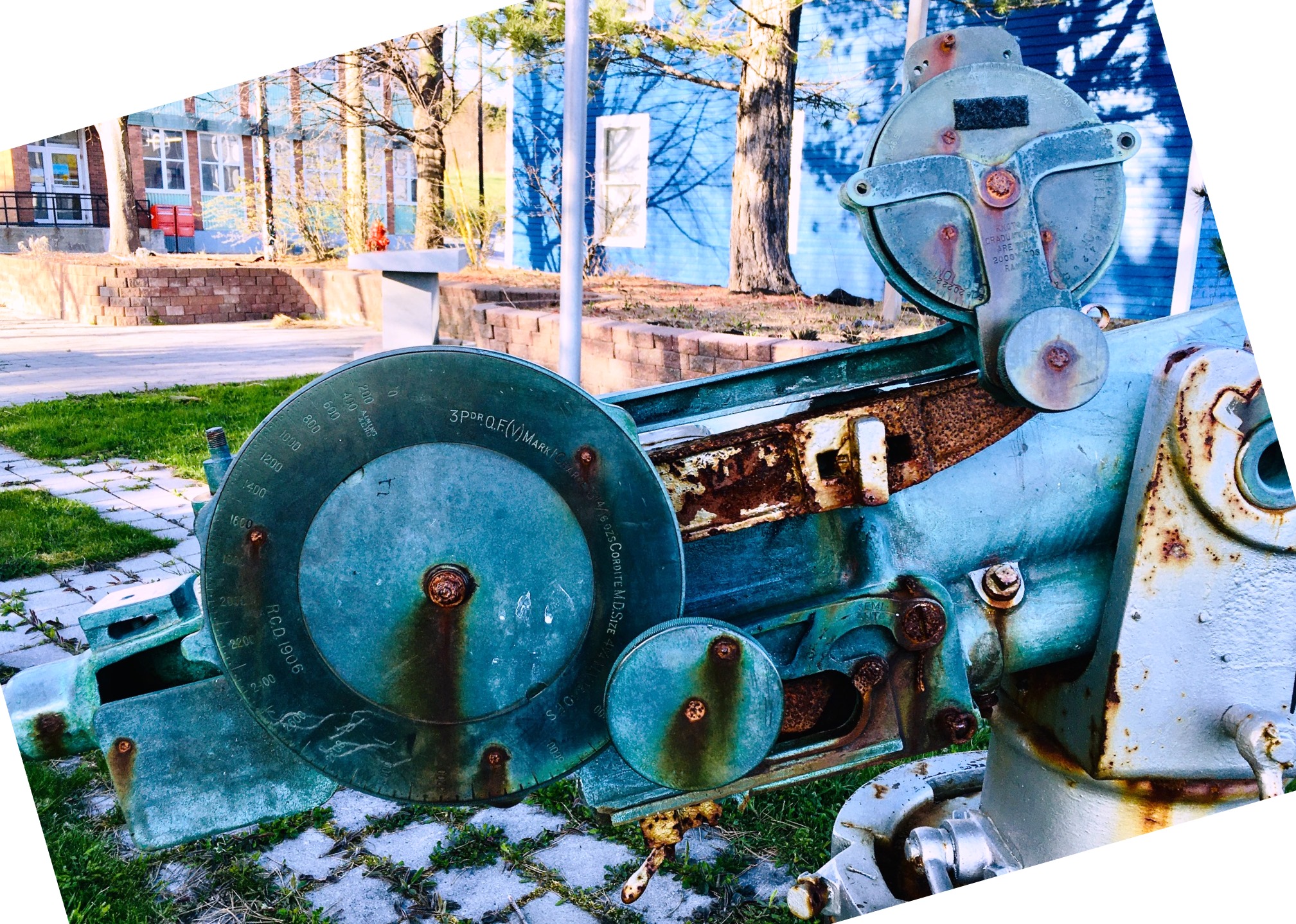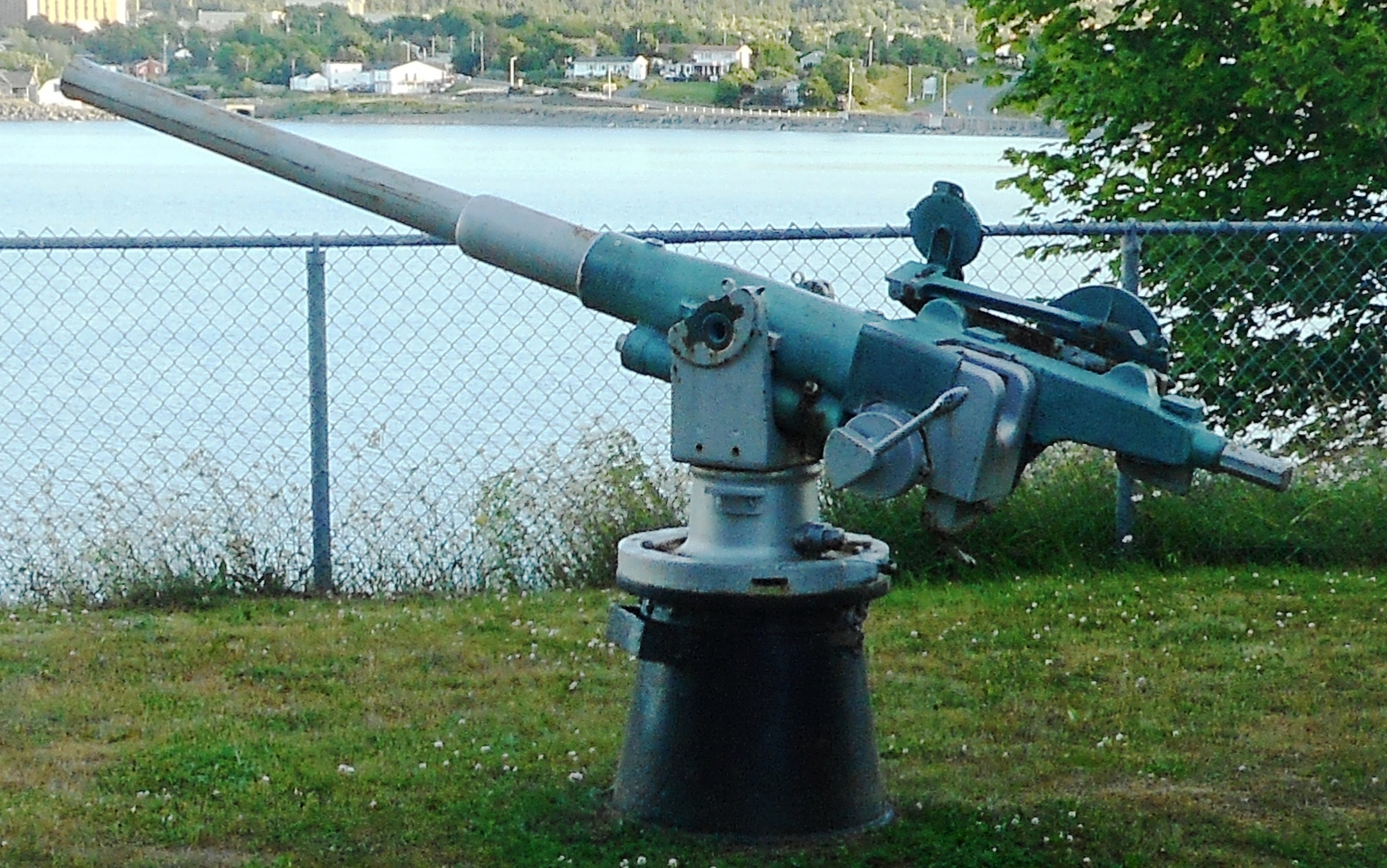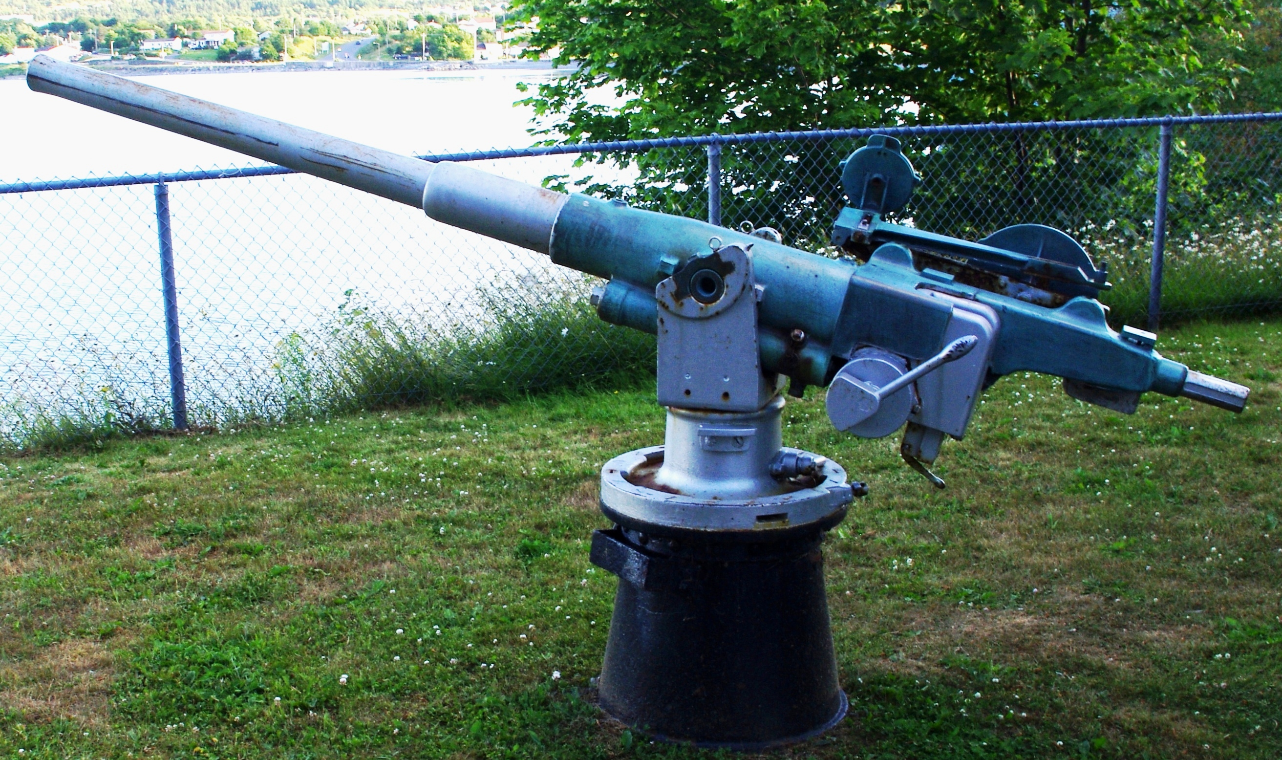 3-pounder QF (V) (Vicker’s Model) Hotchkiss Gun, mounted on a naval gun stand in the War Memorial Park. It is marked R.C.D. 1906. It was a shipboard weapon brought to Carbonear by Capt. Cyrus Taylor, and stood across the road from his house until being moved to the present site in 1980. Capt. Taylor was captain of many semi-official vessels during and after the First World War and this 3-pounder could have been taken from any one of them. For instance he commanded the ex-RN sloop Lobelia when it had been given to Newfoundland and outfitted as a Labrador passenger ship. (Carbonear Heritage Society)