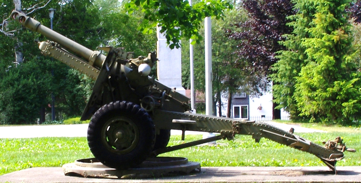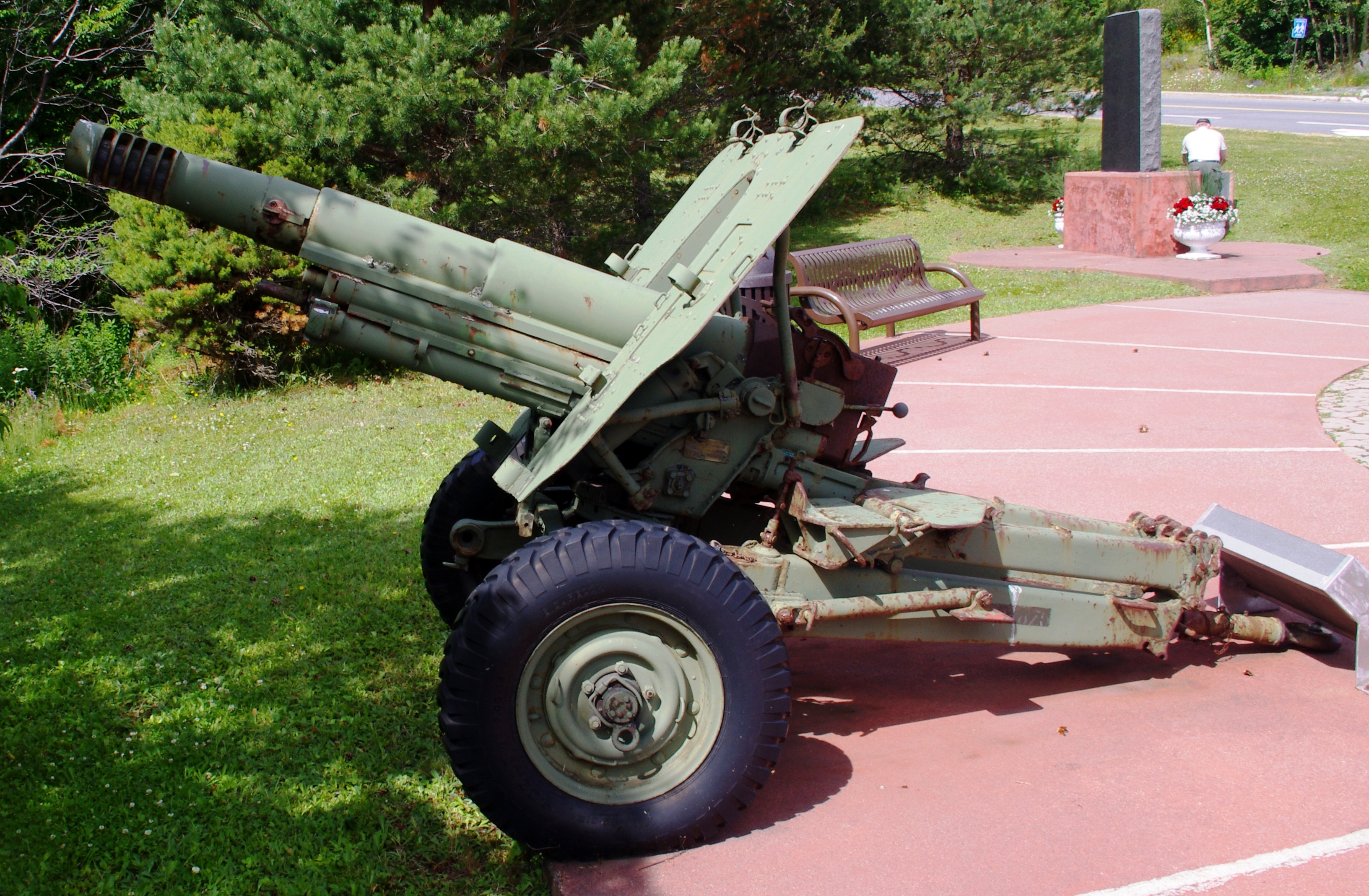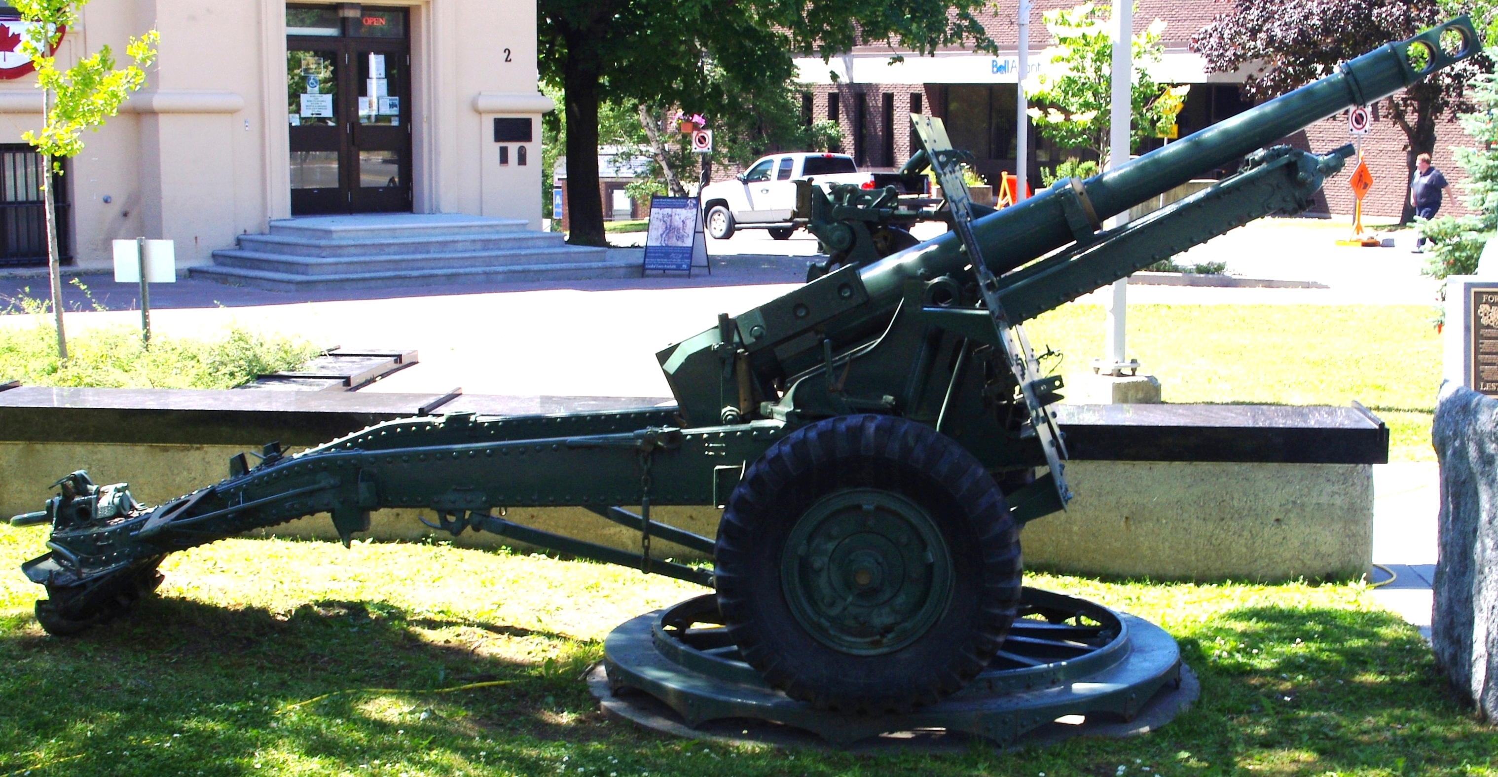 105-mm L5 Pack Howitzer, CFR unknown, carriage No. 57668, 1969. This gun is located on Memorial Ave and Balbo Street, in front of the cenotaph and across from the Town Hall.