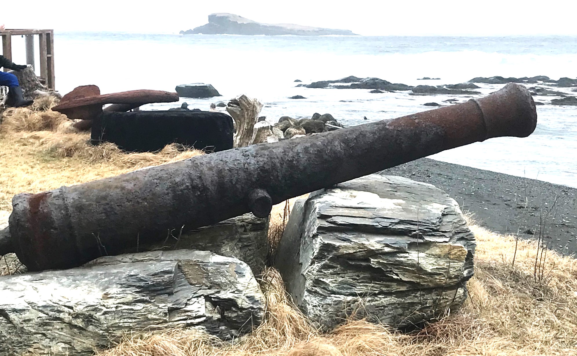 Cast Iron 3-pounder 3-cwt Smoothbore Muzzleloading Gun, weight 3-3-6 (426 Lbs), unmounted, facing the water at the at the entrance to Voisey’s Bay, south of Nain, Labrador. The BP and Crown marking is the black powder proof mark of the Birmingham Proof House. From the proof marks book: “Final black powder proof mark for use with nitro powder. The same mark was also used for the final proofs with black powder for smoothbore muzzleloader barrels.” There is no royal cipher or broad arrow mark. Possibly a Hudson’s Bay Company gun.