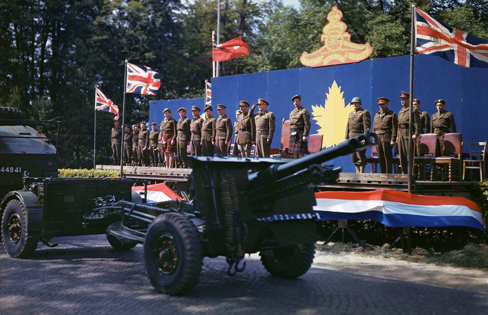 25-pounder C Mk. 2 QF Field Gun with No. 9 circular firing platform, with CMP FAT & limber, 2nd Division parade, ca 1945.