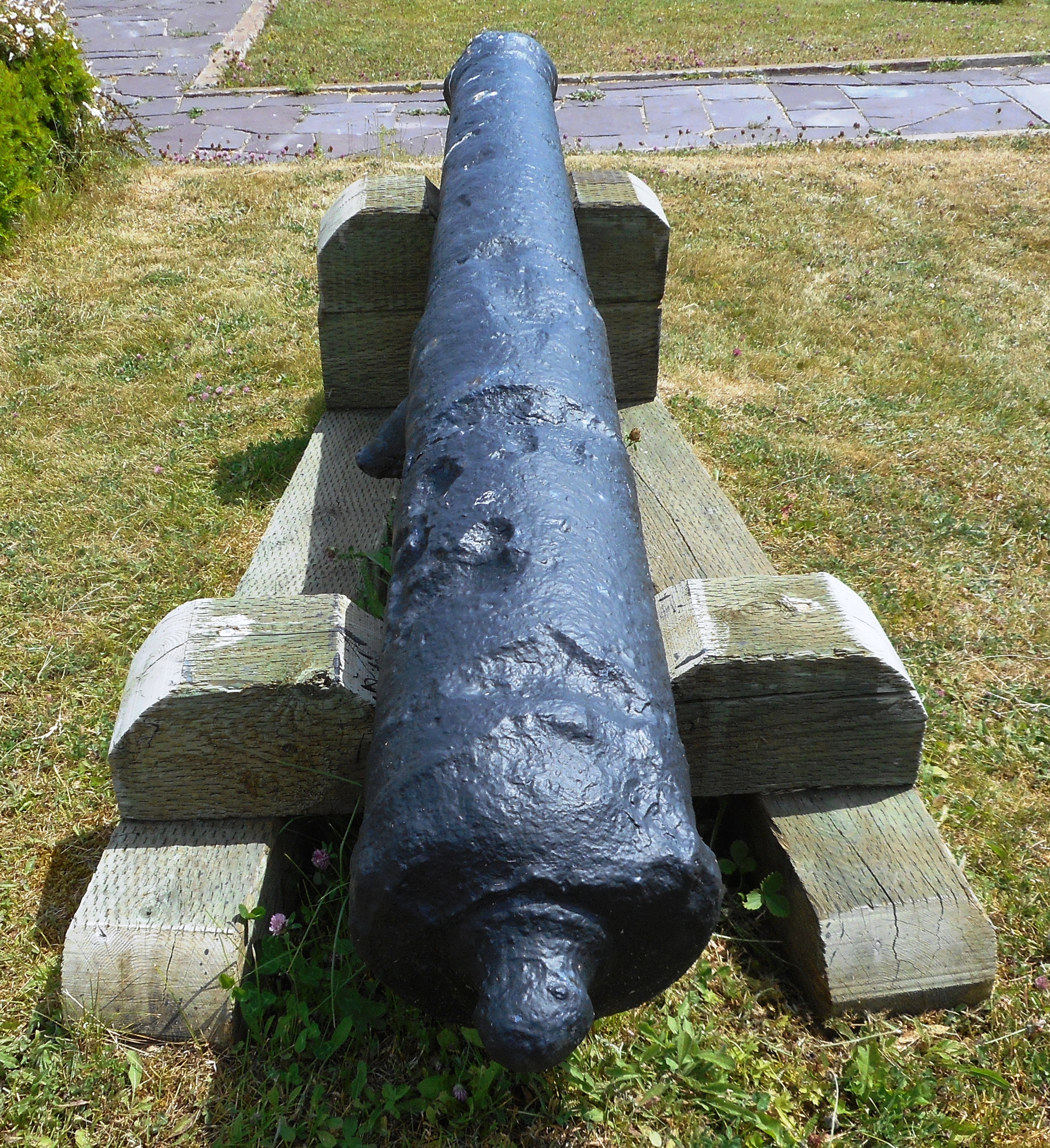 Cast Iron 6-pounder 22-cwt Smoothbore Muzzleloading Gun, weight 23-1-5 (2,609 lbs), King George II cypher, cast by Morgan no earlier than 1757, mounted on a 24-pounder Iron Garrison carriage. Private owner, Harold Forward. The cannon stands in front of his house on the Southside Road.