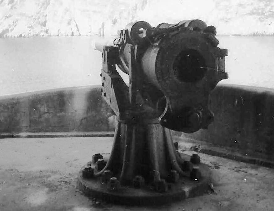 4.7-inch QF Mk. III Gun (Serial No. 1060) on a Central Pivot Mount Mk I, C10, No. 1 of 2 at Fort Amherst. This gun is reported to be in very poor condition and has fallen into the land wash.