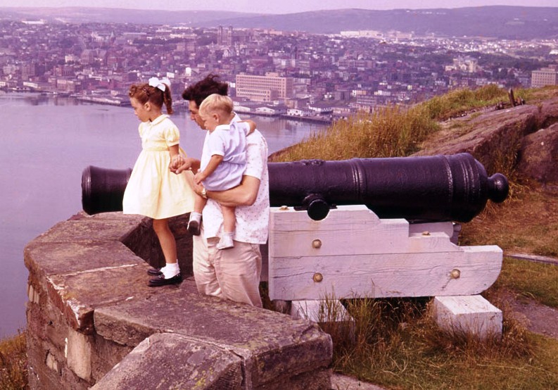Cast Iron 18-pounder 42-cwt Smoothbore Muzzleloading Gun, with family overlooking St. Johns Harbour, Aug 1960.