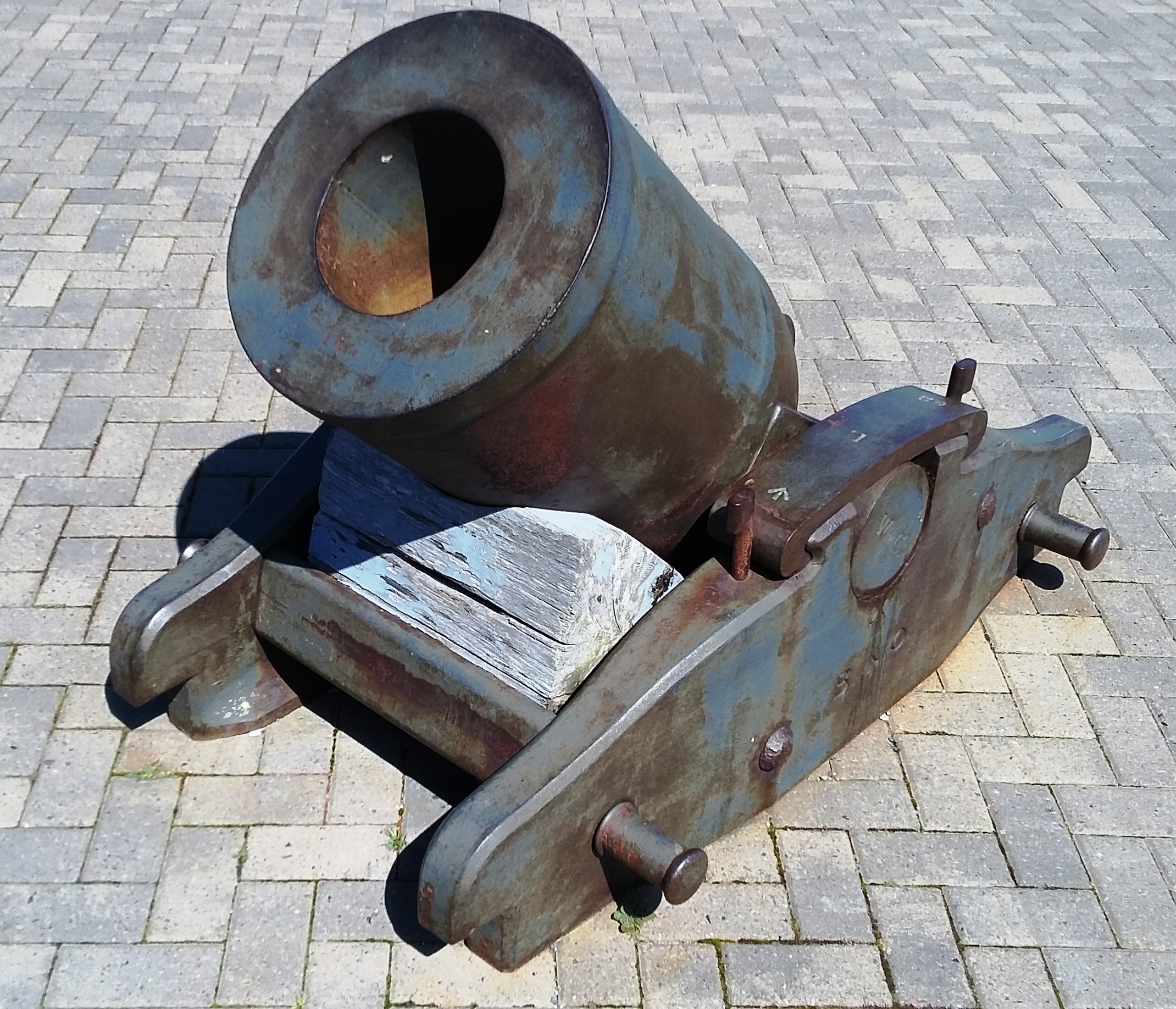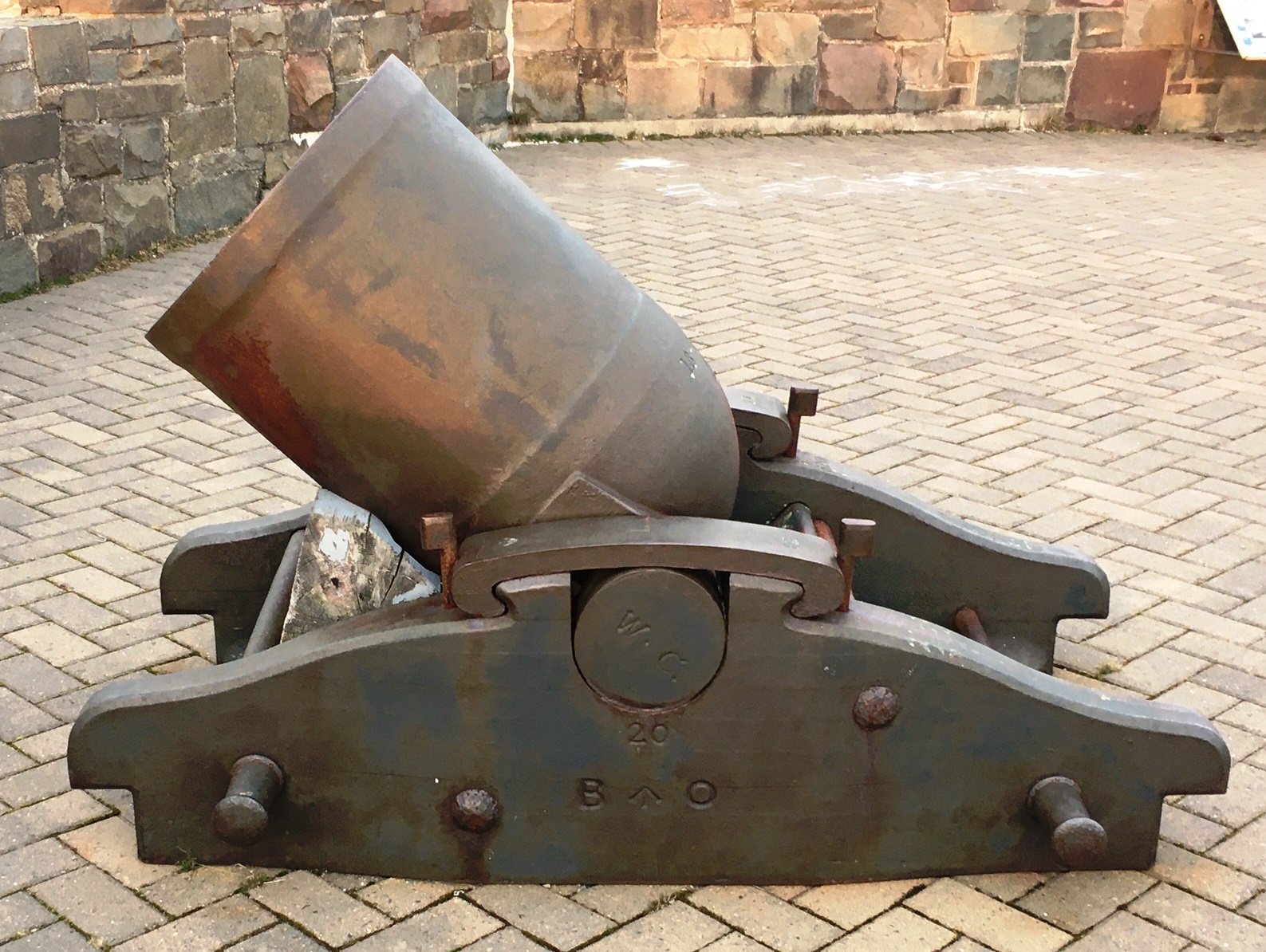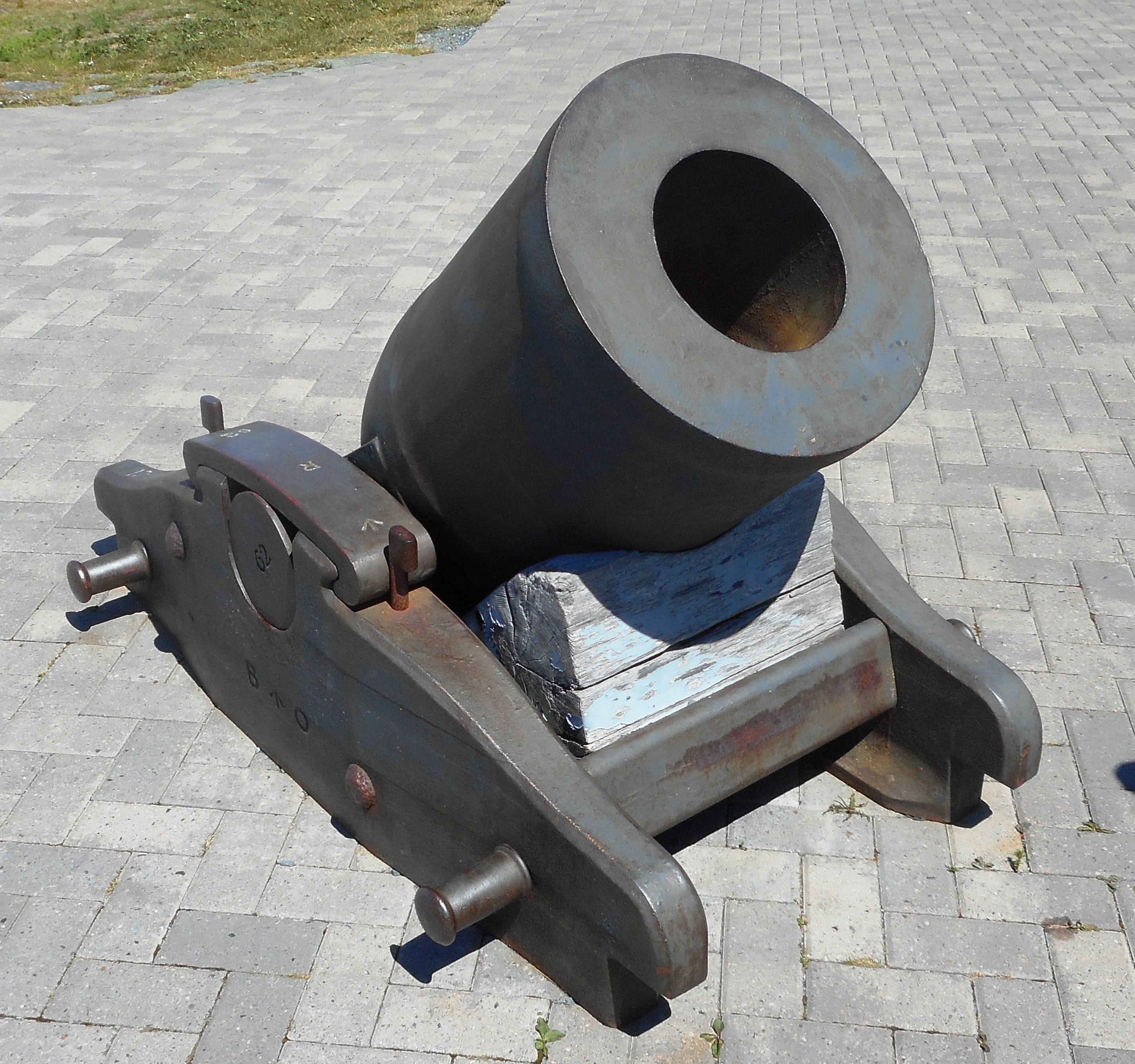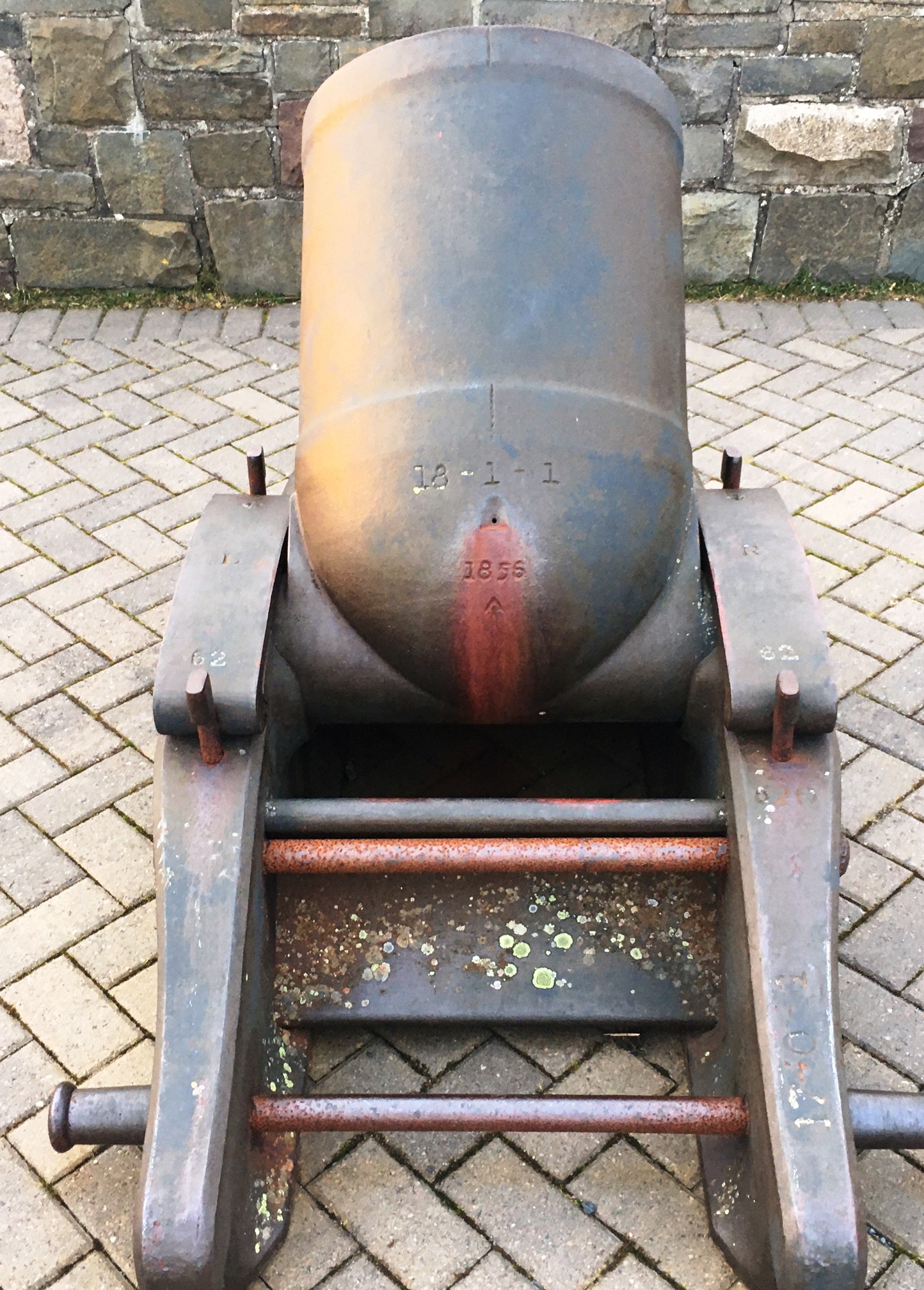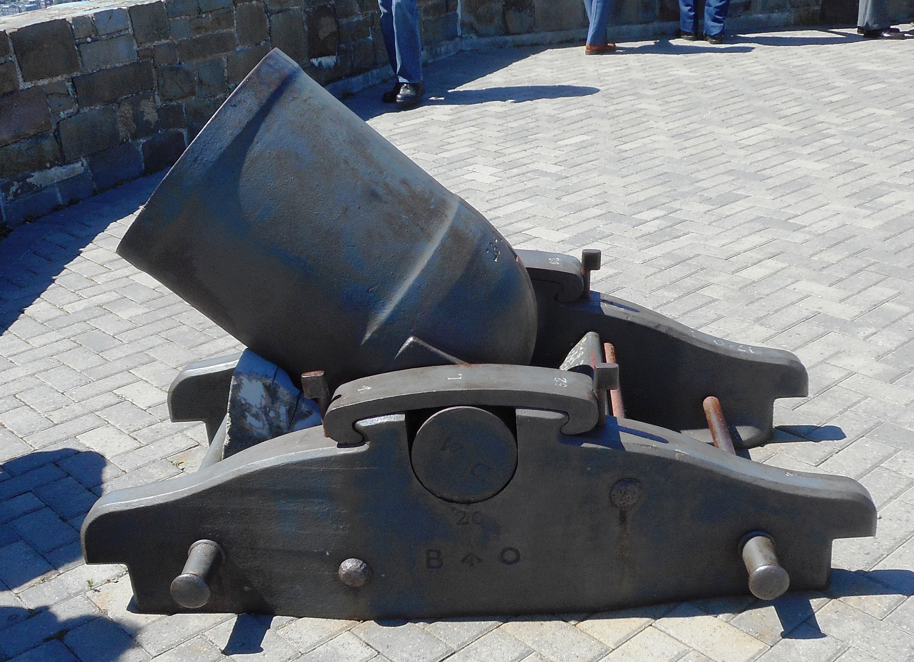 Cast Iron 6-pounder Smoothbore Muzzleloading Land Service Mortar, reproduction, weight 18-1-1 (2,045 lbs), mounted on an iron carriage, weight 17-0-1 (1,905 lbs), WCo, B broad arrow O, 62. This mortar stands on the roof of Cabot Tower, and is used by the Tattoo re-enactors.