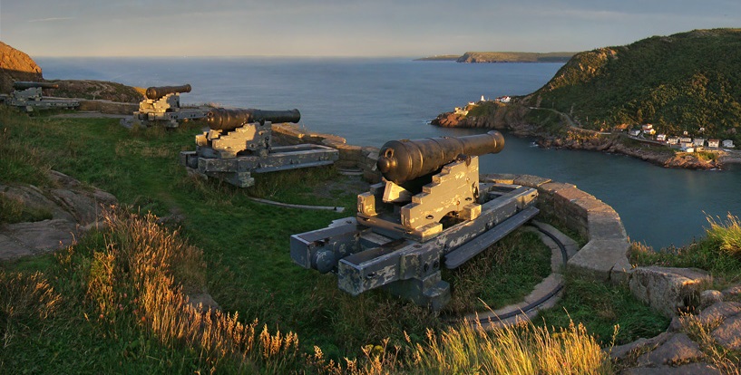 Cast Iron 6-pounder Smoothbore Muzzleloading Guns mounted on garrison carriages from Fort Townsend, Quidi Vidi National Historic Site.