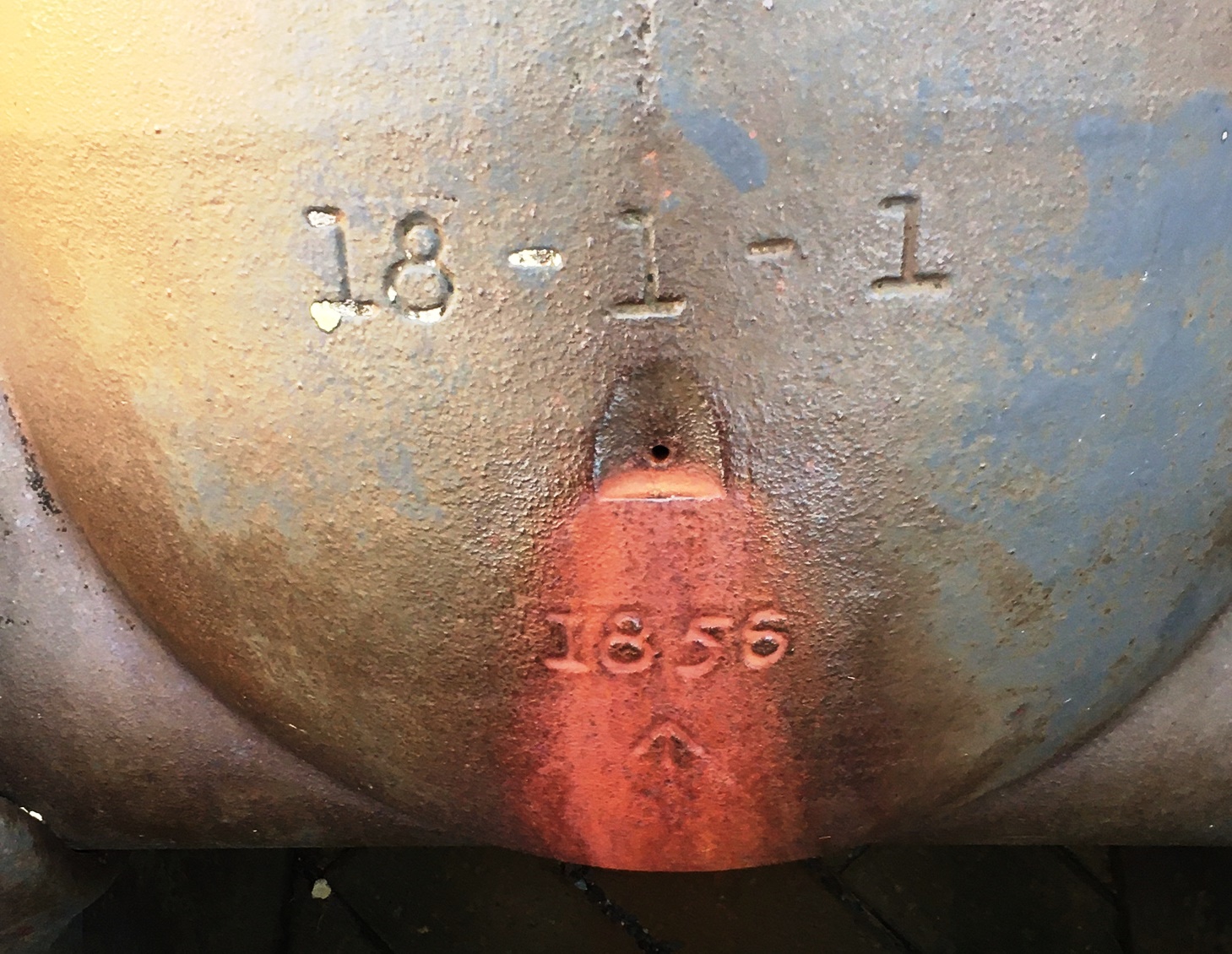 Cast Iron 24-pounder Smoothbore Muzzleloading Gun, weight unknown, Queen Ann cypher, no trunnions, No. 1 of 2, resting on timbers. Admiral’s (Fort) Point.