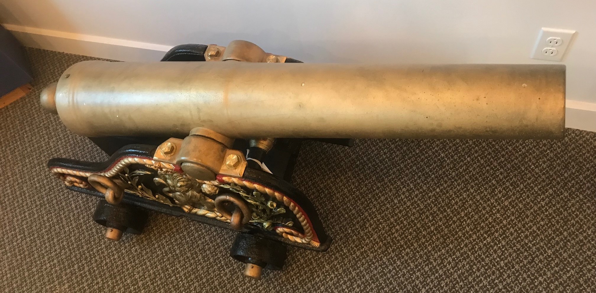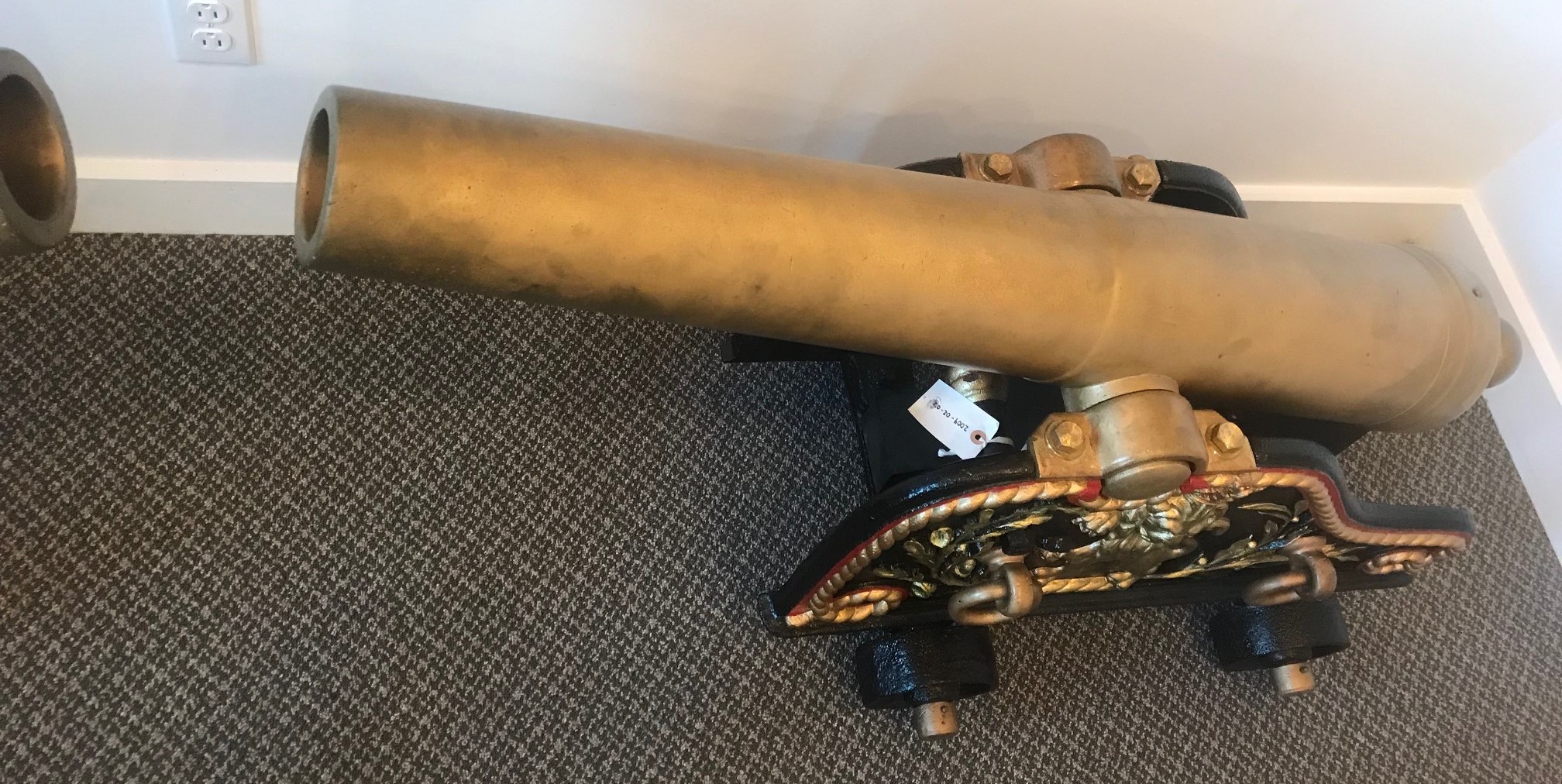 Bronze Lyle 2.5-inch Smoothbore Muzzleloading ceremonial guns with cast wheeled carriages, donated from the Touton Property to the Admiralty House Museum, Mount Pearl. Restored by Jim Steinhauer and Nelson Sherren, No. 2 of 2. This gun came from the HMS Calypso, a Royal Newfoundland Naval Reserve (RNR) sail training corvette.