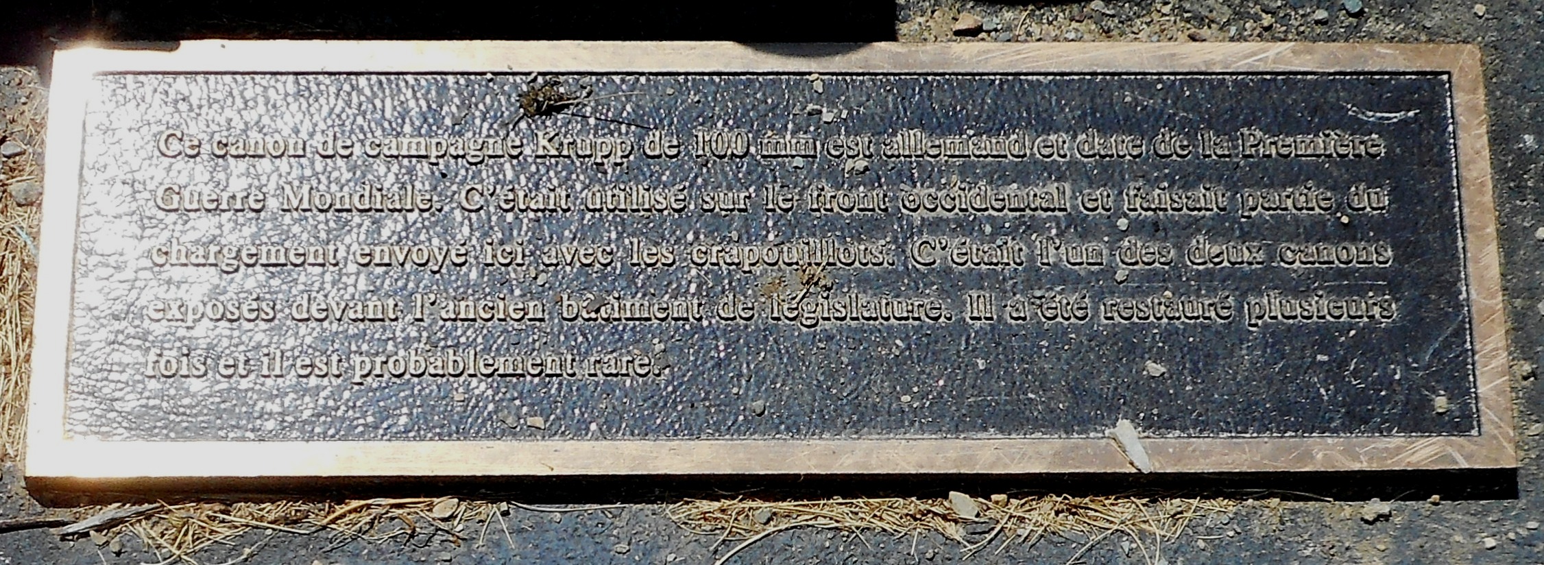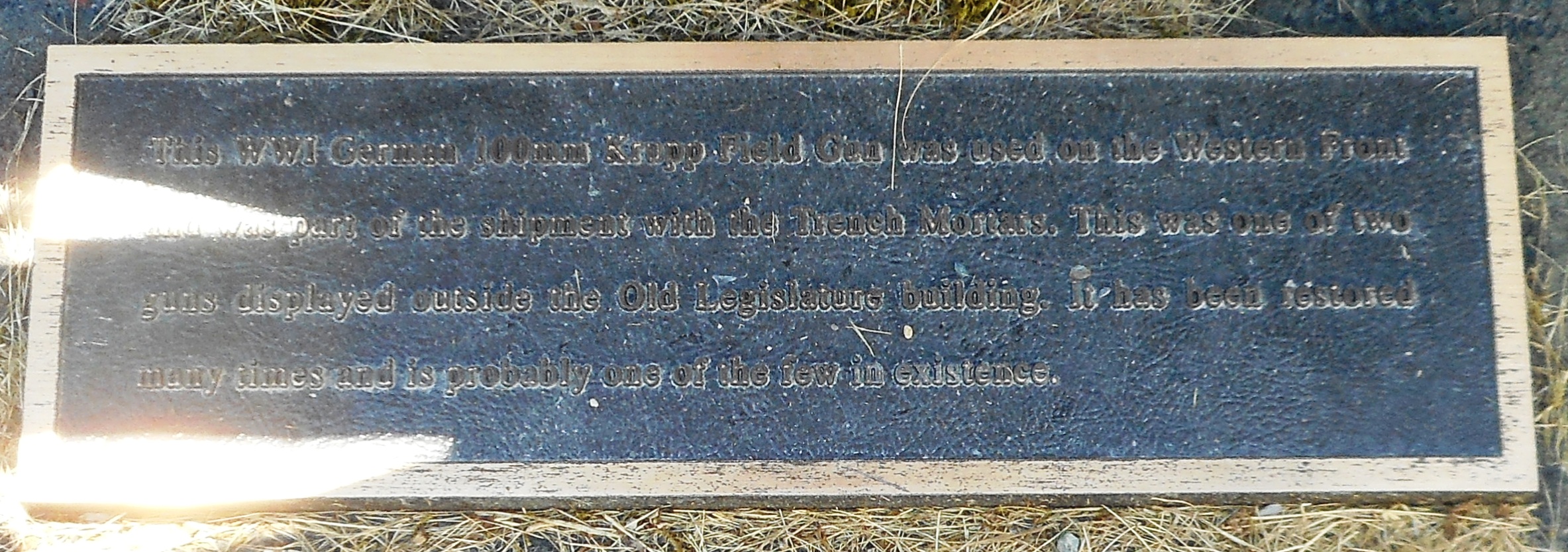 German First World War 10-cm Kanone 17 (10-cm K17), (Serial Nr. unknown), field gun in Victoria Park. The trail has been cut off and the forward part of the gun rests on a concrete stand with a plaque.
