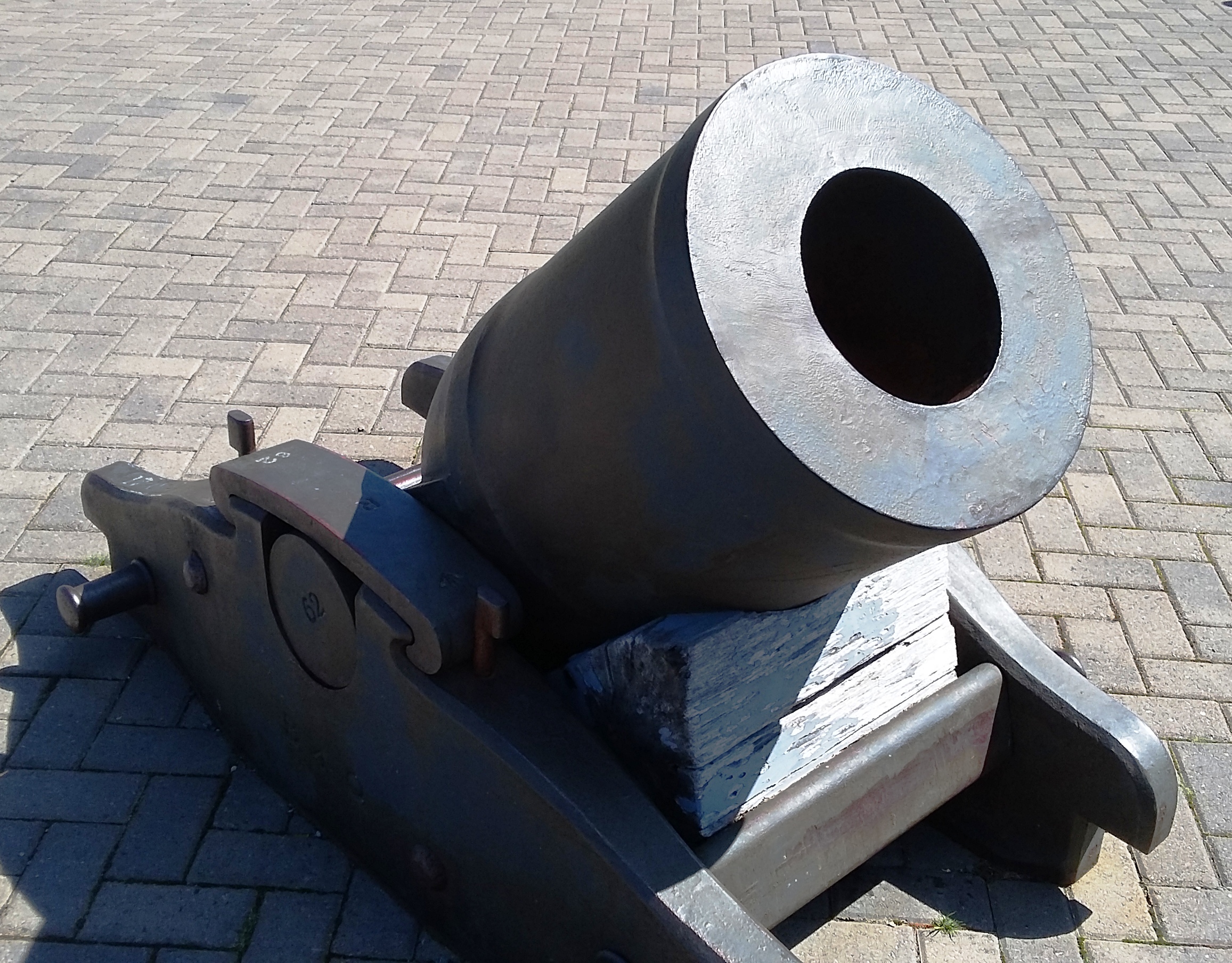 Cast Iron 24-pounder Smoothbore Muzzleloading Gun, weight unknown, Queen Ann cypher, resting on timbers. Admiral’s (Fort) Point.