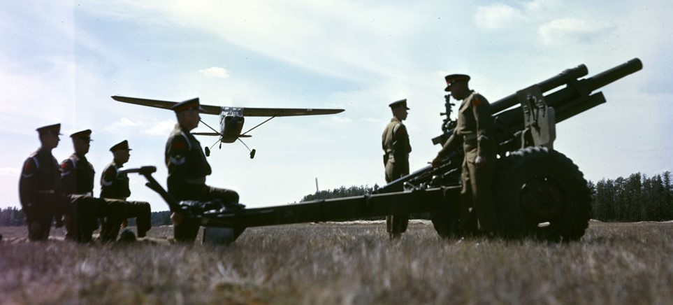 Cessna L-19 Bird Dog flying over a Royal Canadian Artillery gun crew manning a 105-mm C1A1 Field Gun, likely at CFB Gagetown or CFB Shilo, c1960s.