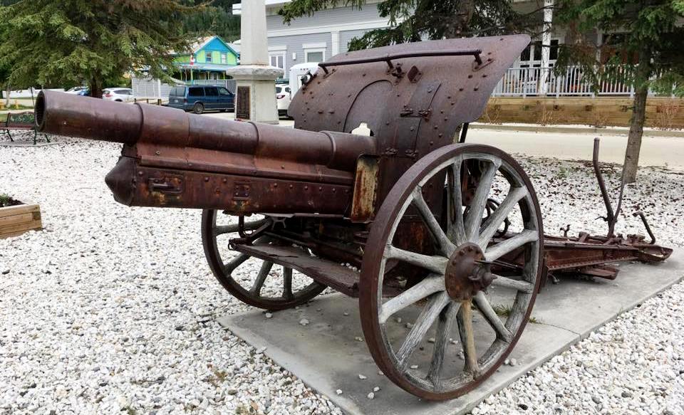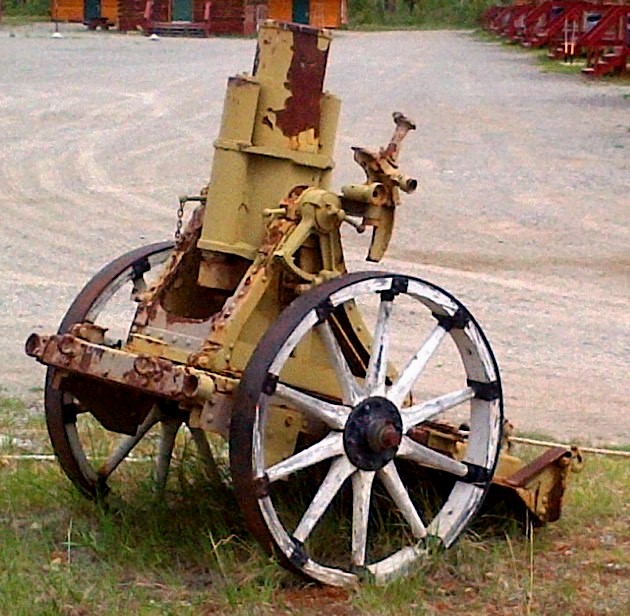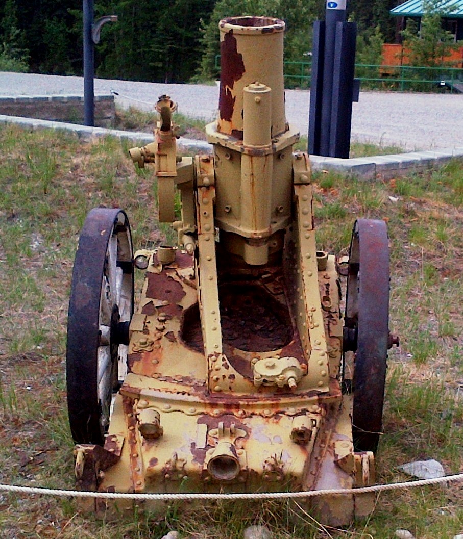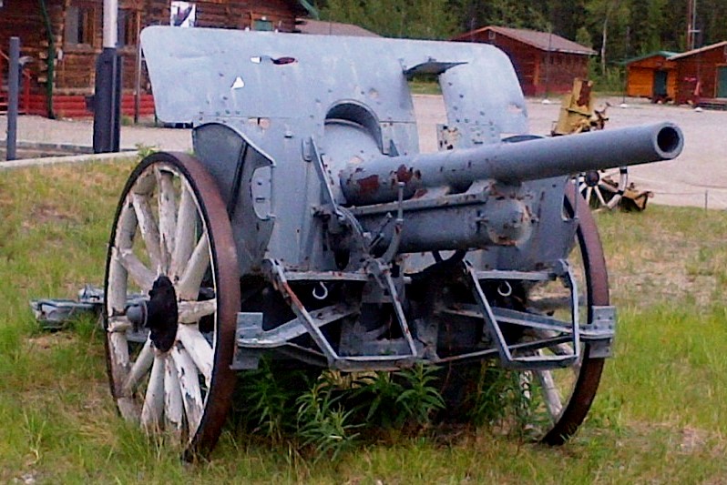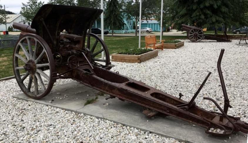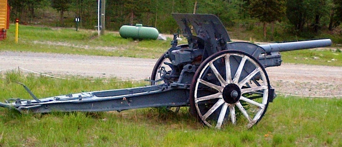 German First World War 7.7-cm Feldkanone 16 (7.7-cm FK 16) Field Gun (Serial Nr. 7414). This gun was captured on 27 Sep 1918 by the 102nd Battalion (Central Ontario), 11th Infantry Brigade, 4th Canadian Division, Canadian Expeditionary Force (CEF), West of Bourlon Wood, during the battle of Canal du Nord, France. The gun was originally allocated to Dawson City. This gun is located 13 km SE of Whitehorse at the Cadet Camp by Mary Lake. (Photos courtesy of LCol Bruce Kiecker)