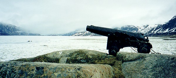 Cast Iron 12-pounder 6-cwt Smoothbore Muzzleloading Carronade with Blomefield-pattern breeching ring, weight >600lbs. This Hudson’s Bay Company gun is mounted on a wood naval gun carriage. It was placed here in the early 1900s and is chained to a rock on the East coast of Baffin Island. The Carronade is a short smoothbore, cast iron cannon, which was used by the Royal Navy and first produced by the Carron Company, an ironworks in Falkirk, Scotland. It was used from the 1770s to the 1850s. Its main function was to serve as a powerful, short-range anti-ship and anti-crew weapon. While considered very successful early on, Carronades eventually disappeared as rifled naval artillery changed the shape of the shell and led to fewer and fewer close-range engagements.