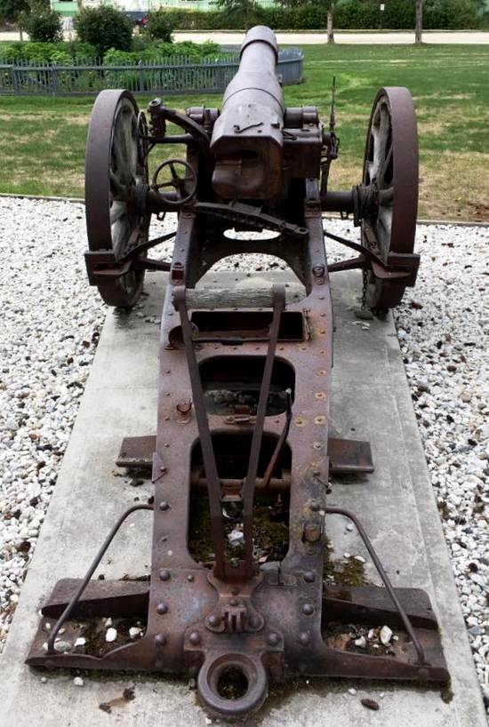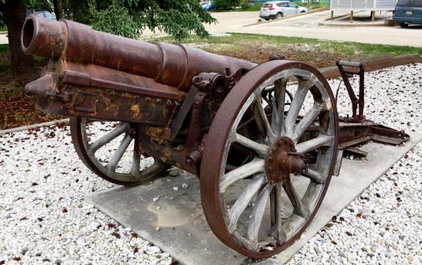 German First World War 15-cm schwere Feldhaubitze 1902 (15-cm sFH 02), (Serial Nr. 1169). This gun was captured on 8 Aug 1918 by the 16th Battalion (Canadian Scottish), 3rd Infantry Brigade, 1st Canadian Division, Canadian Expeditionary Force (CEF), near Aubercourt, France. The gun is No. 1 of 2 Guns in front of the cenotaph at Victory Gardens.