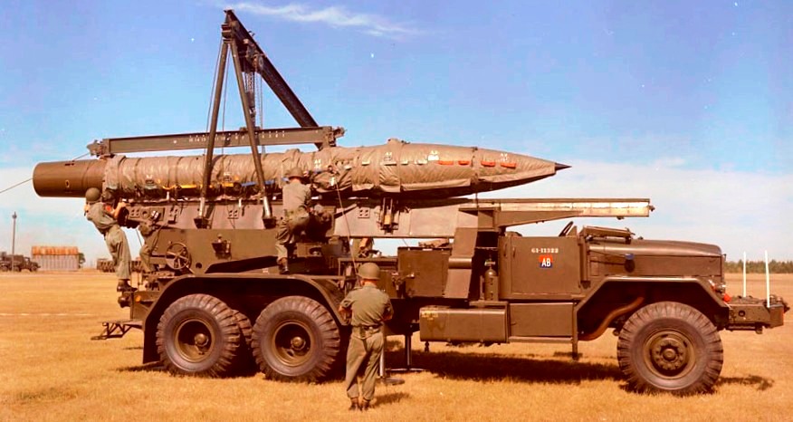 762-mm M31/M50 Honest John Rocket with M33 launcher trailer set-up and in operation in Canada the early 1950s. (Library and Archives Canada Photos MIKAN Nos. 4235079)
