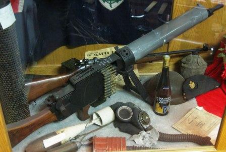 German First World War 7.92-mm Maxim Spandau MG 08 Machineguns, the mounts are original, but the real machineguns were stolen in the 1970s, these are replicas. The missing MGs were (Serial Nr. 5203) captured by the 2nd Canadian Division and (Serial Nr. 5307) captured by the 27th Battalion at Passchendaele, or (Serial Nr. 44996) (no data).