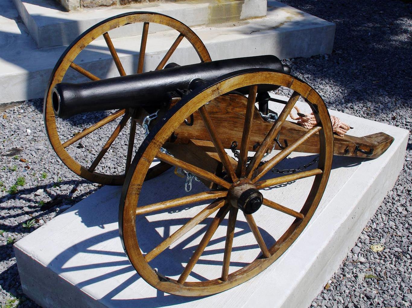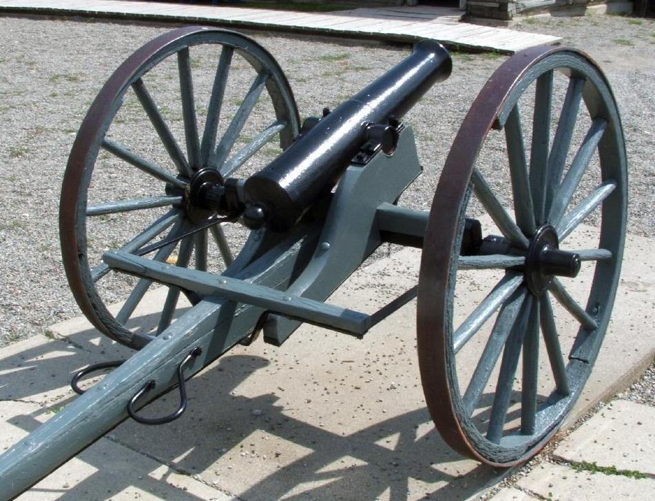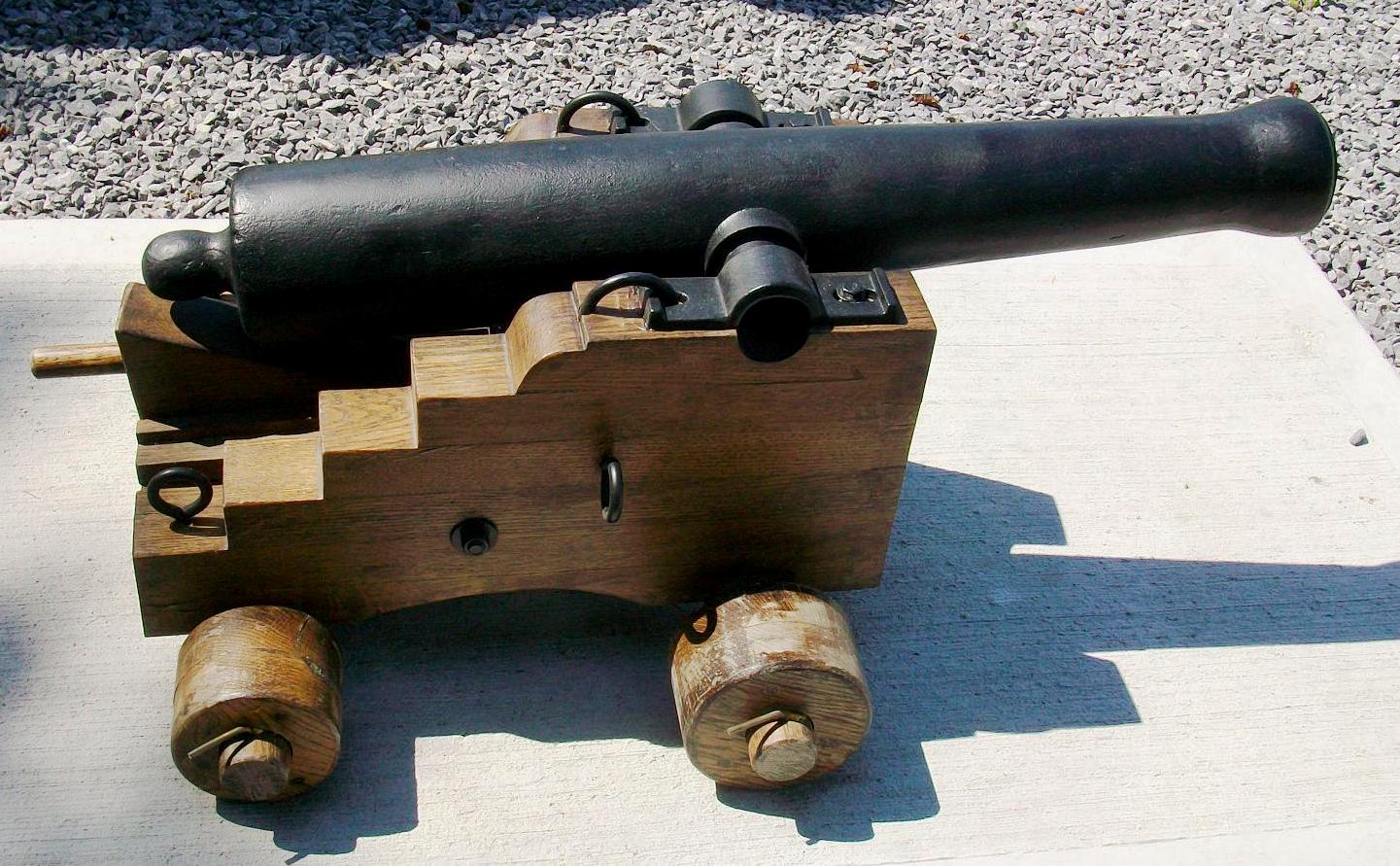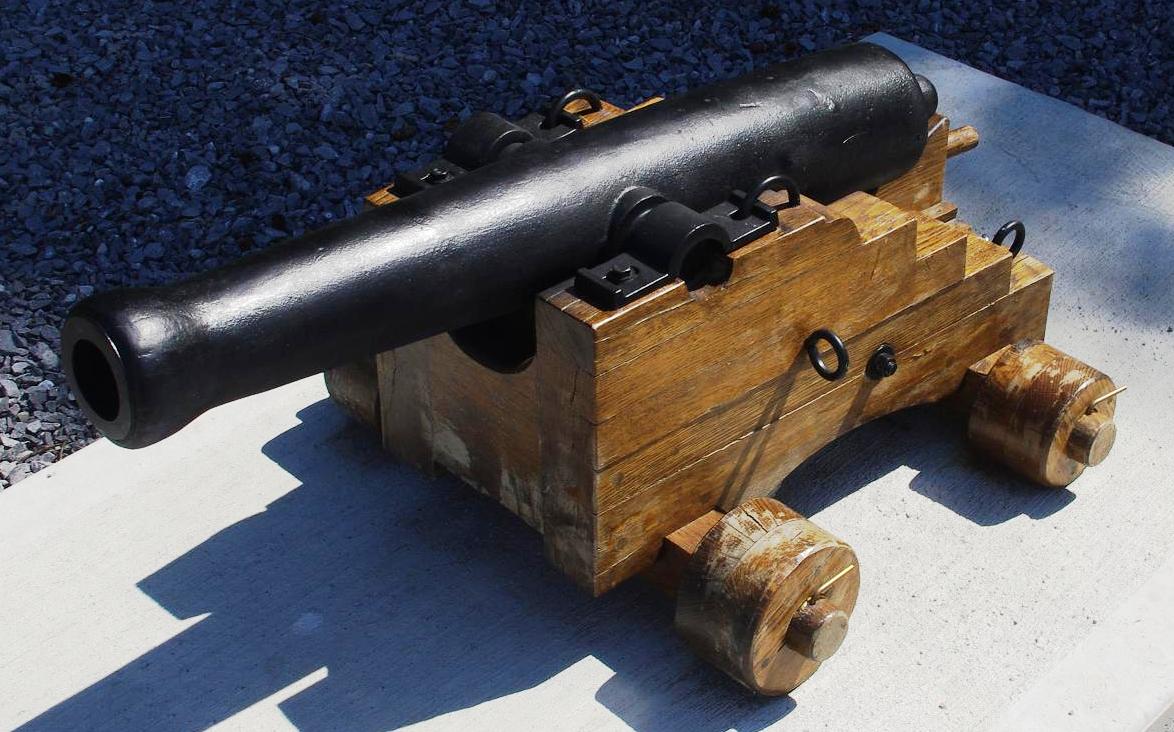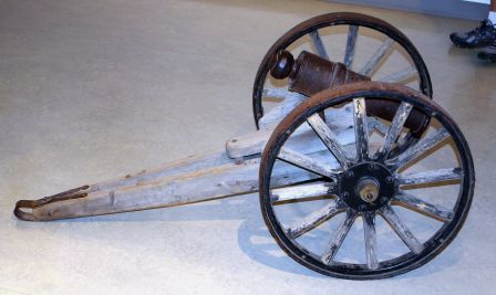 Cast Iron 1-pounder Smoothbore Muzzleloading Gun, weight, maker and Serial No. unknown, mounted on a wood wheeled wood gun carriage.