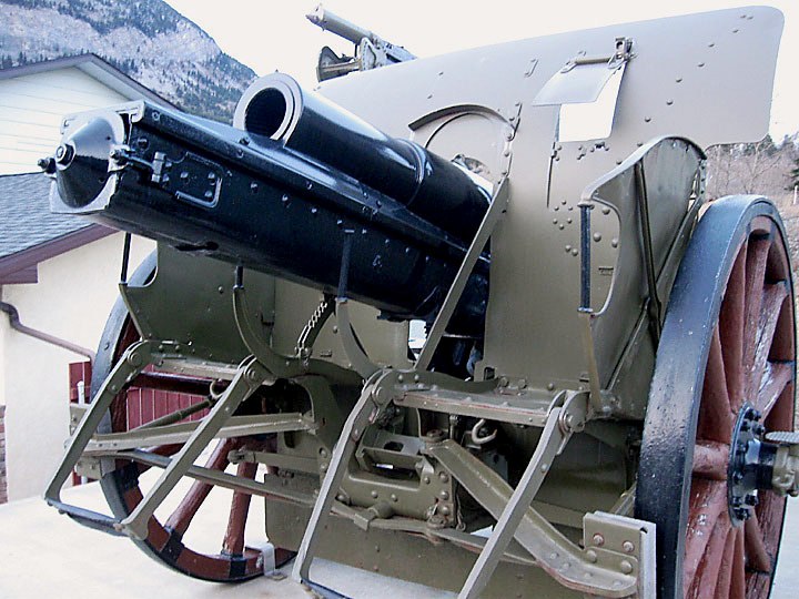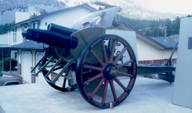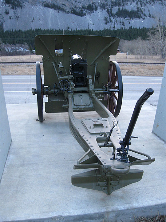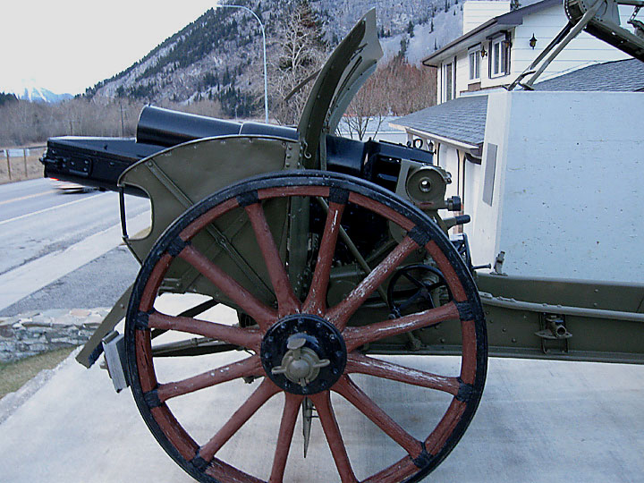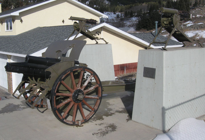 German First World War 10.5-cm leichtes Feldhaubitze 98/09 (10.5-cm leFH 98/09) Light Field Howitzer, (Serial Nr. 3392), no data, 1916. This gun is part of a War Memorial located on the Crowsnest Highway, Route 3, Alberta, a few miles east of the divide in the small community of Frank. The gun is flanked by two German First World War 7.92-mm Maxim Spandau MG08 Machineguns.