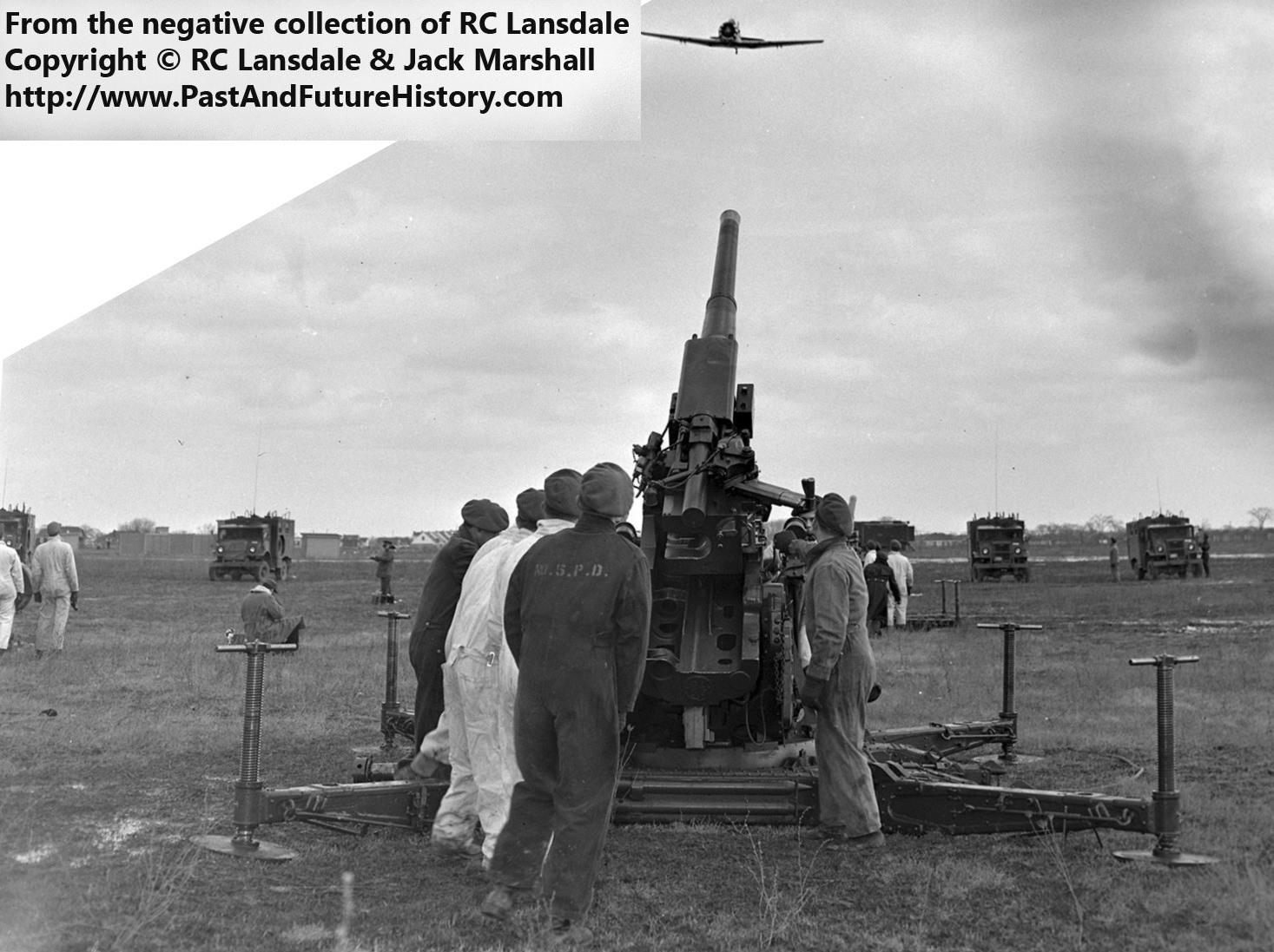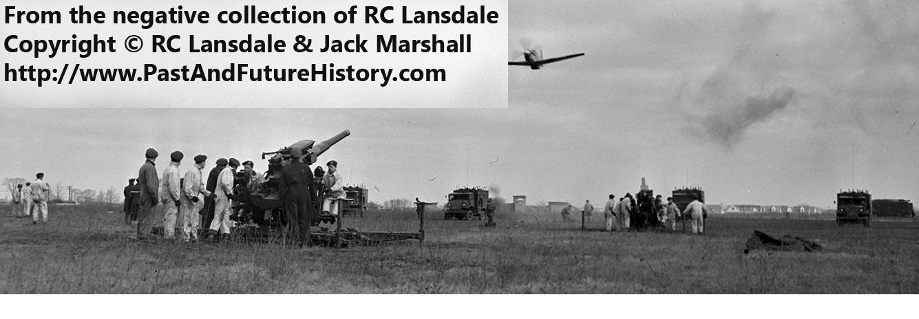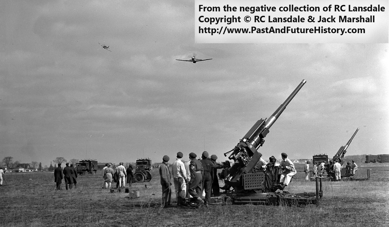 Canadian Army QF 3.7-inch AA Gun, with RCAF North American Mustang Mk. IVs and a Harvard coming in on an exercise run.