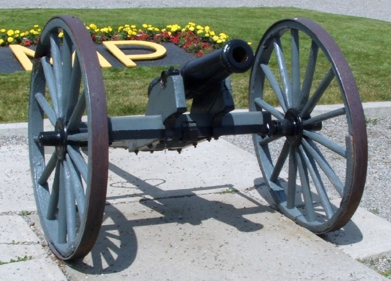 This British gun was the smallest variety of rifled muzzle loader produced for British service. This gun has been on display in the 5th Regiment, RCA Officer’s Mess for many years. It is mounted on a steel carriage with two small wooden truck wheels at the front and a skid at the rear. Its service history is unknown and there is no record of guns of this type having been issued to this regiment. These guns were used as small (and hence easily transportable) siege pieces by the army and on small vessels by the navy.