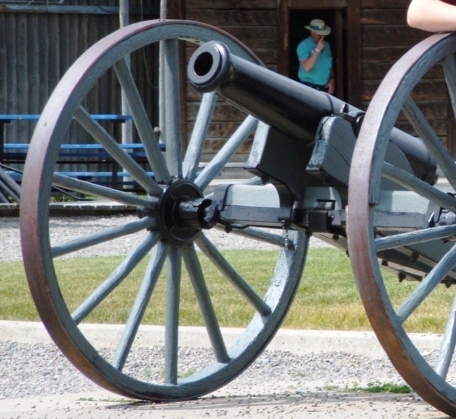 7-pounder Bronze Mk. II 200 lb Rifled Muzzleloader Gun (painted black), mounted on a field carriage (Fort Macleod, Alberta). The bronze guns were conversions from the 3-pounder smoothbore, while the steel guns were designed from scratch. All 7-pounders used the same projectile but different charges. They were the same 3-inch calibre as the 9-pounder, but could not interchange projectiles (except for case shot) because the studs on the projectiles were different.