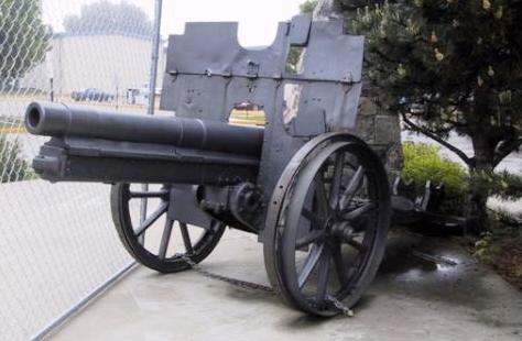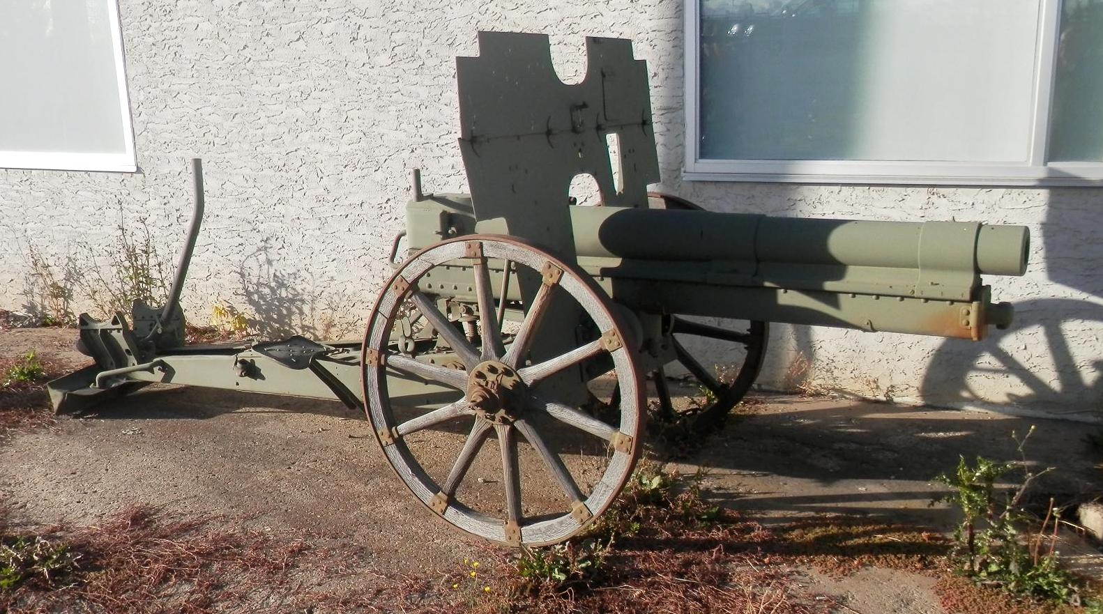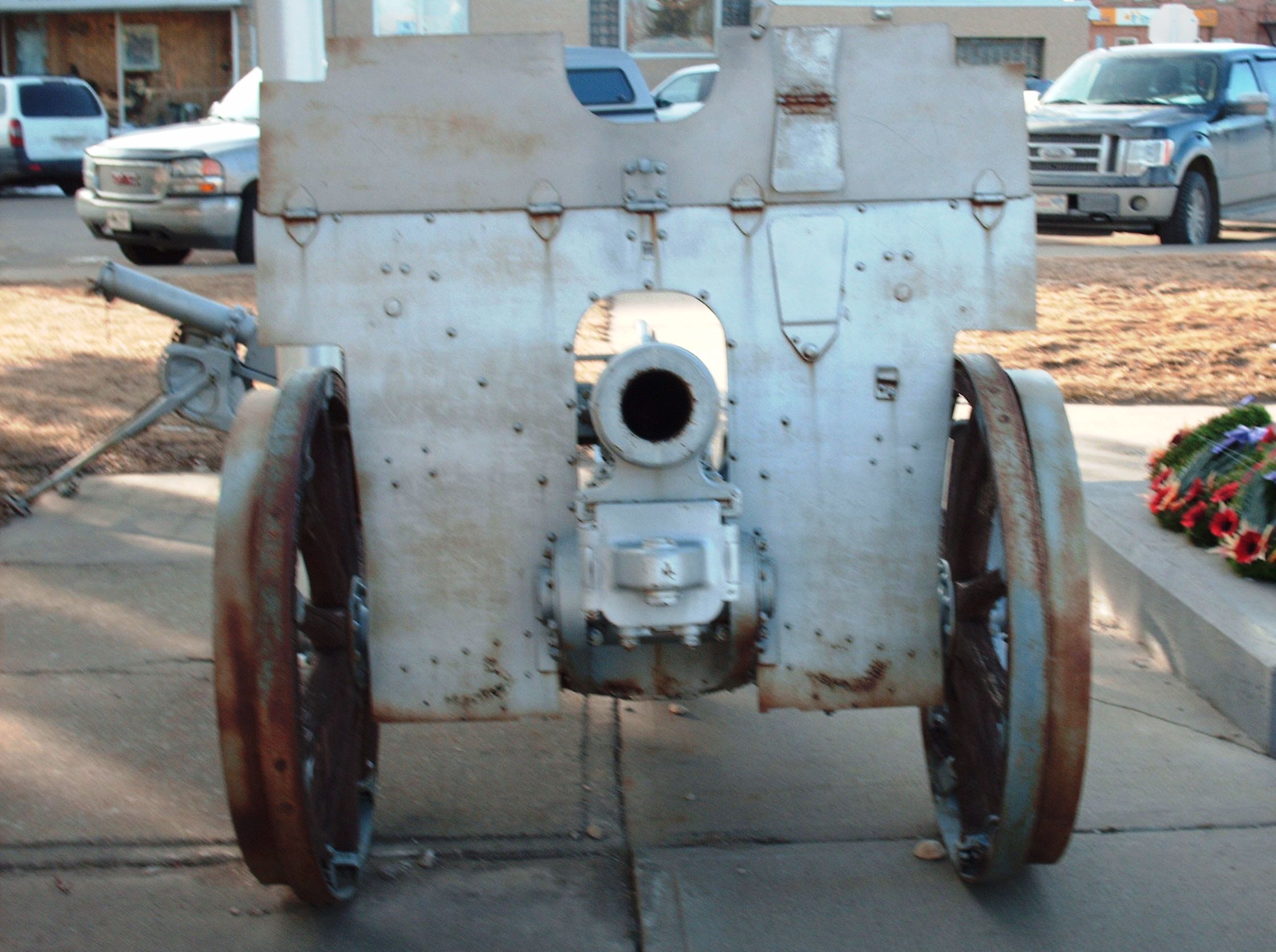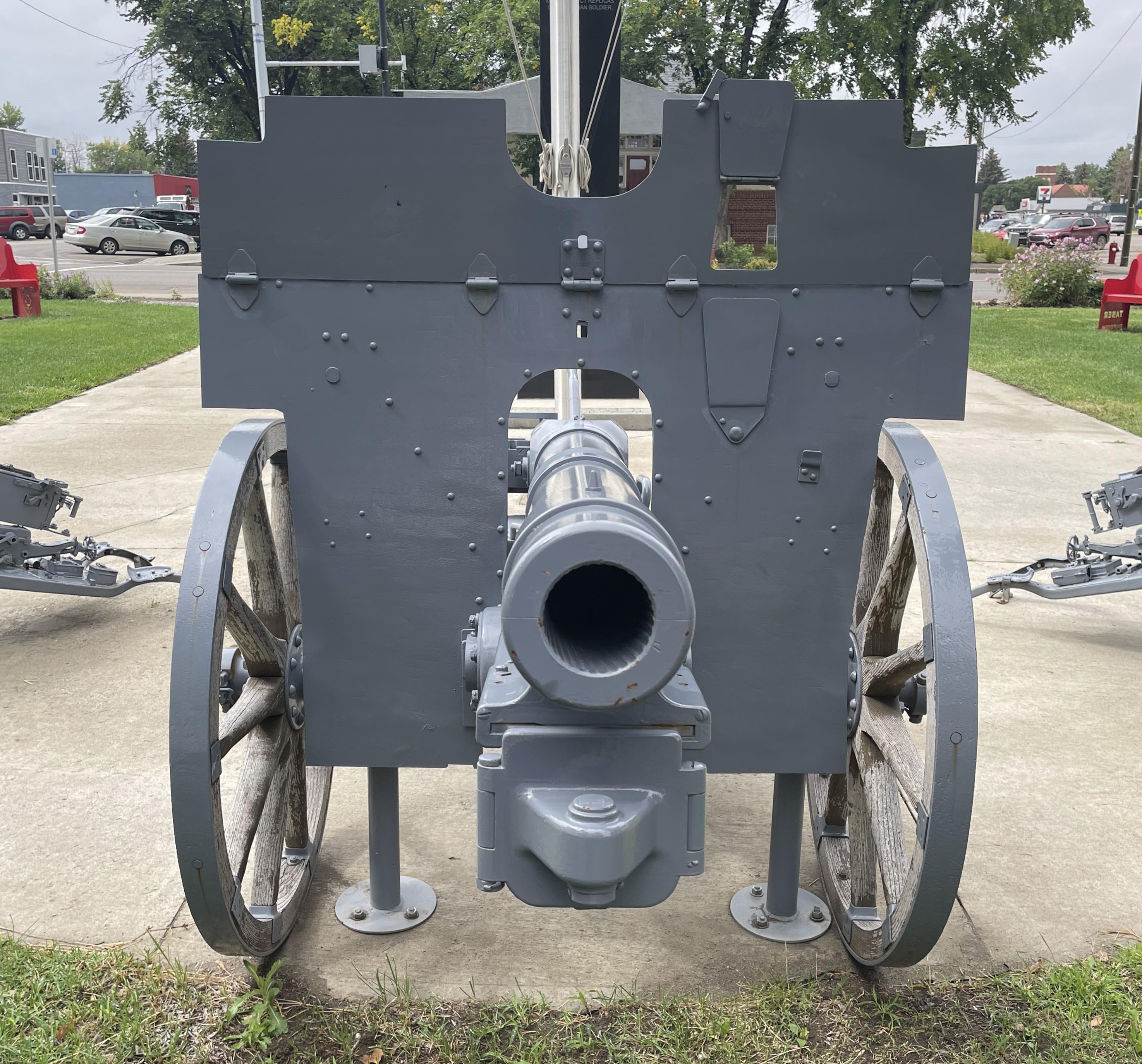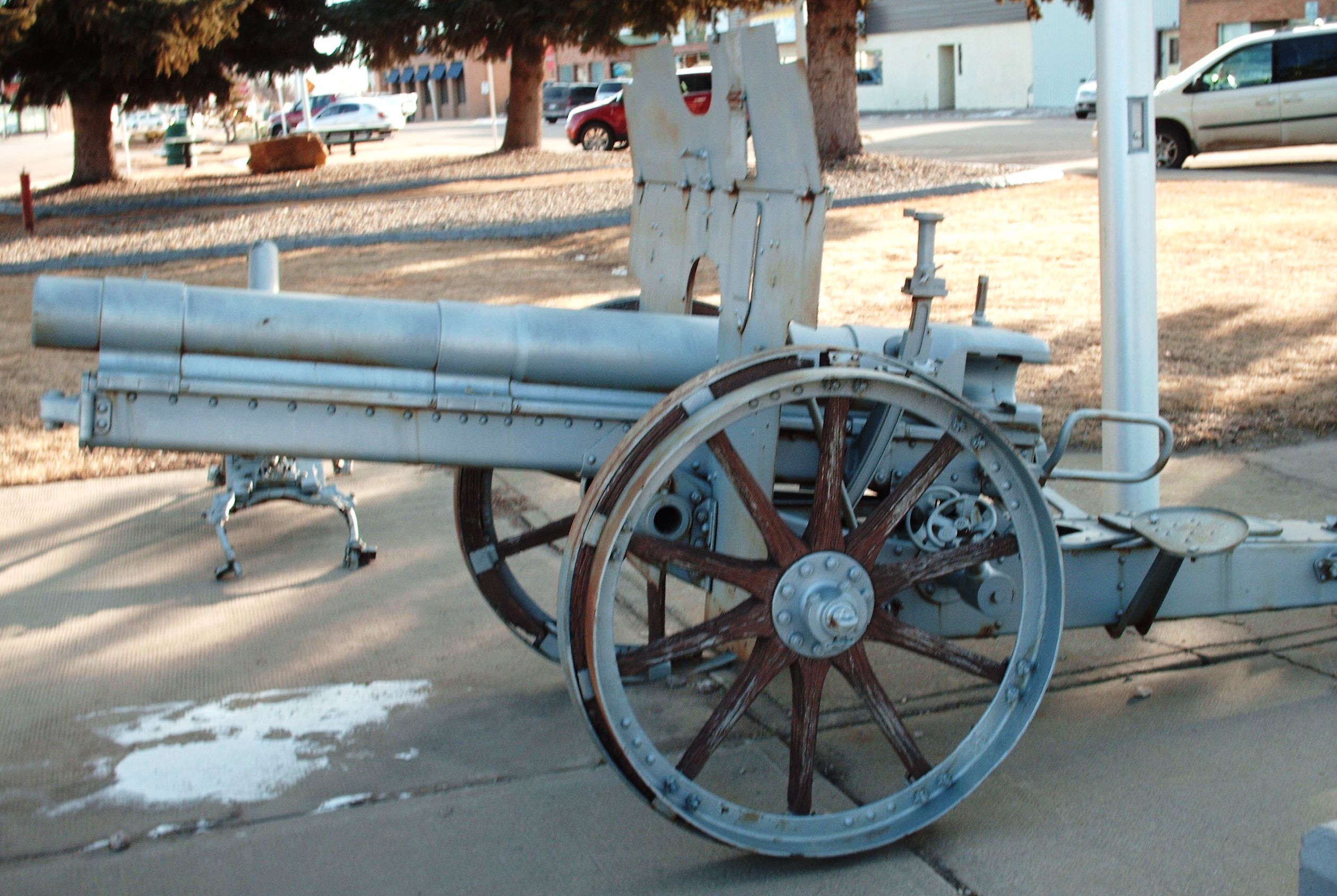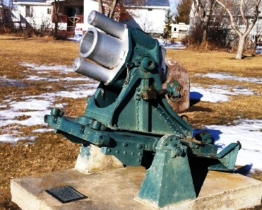 German First World War 7.7-cm Infantriegeshutz L/27 (7.7-cm IG L/27), (Serial Nr. 9406), no data, standing beside Royal Canadian Legion Branch No. 11 at 5144 Railway Ave.
