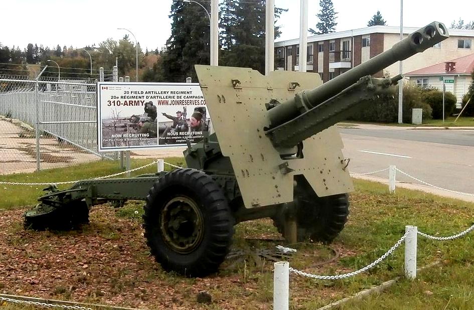 25-pounder C Mk. 2 QF Field Gun with No. 9 circular firing platform, in front of the Royal Canadian Legion, 217 5th St. N.