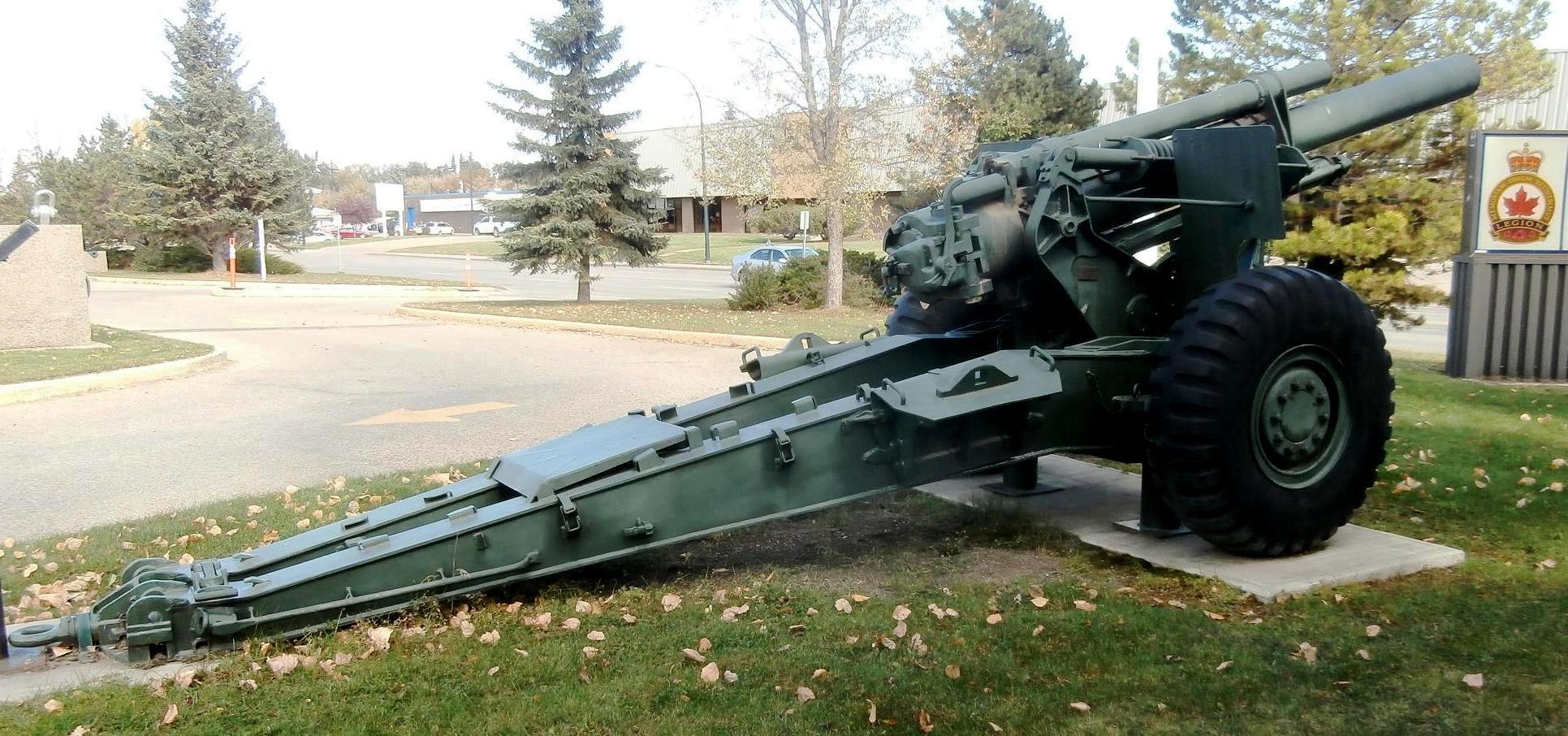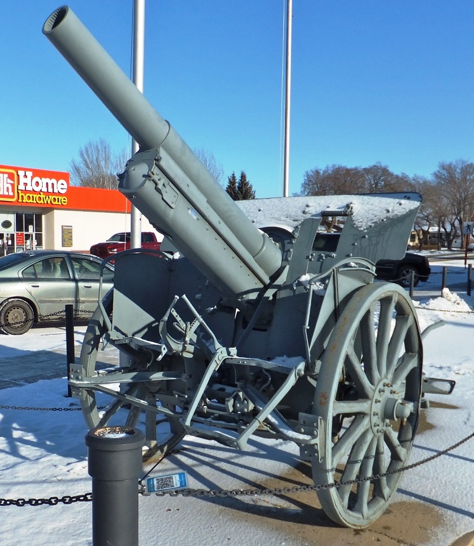 German First World War 10.5-cm leichtes Feldhaubitze 16 (10.5-cm leFH 16), (Serial Nr. 12626). This gun was captured by the 31st Battalion (Alberta), 6th Canadian Infantry Brigade, 2nd Canadian Division of the Canadian Expeditionary Force (CEF). The gun is located beside the Royal Canadian Legion Branch No. 6 at 302 Broadway St E.